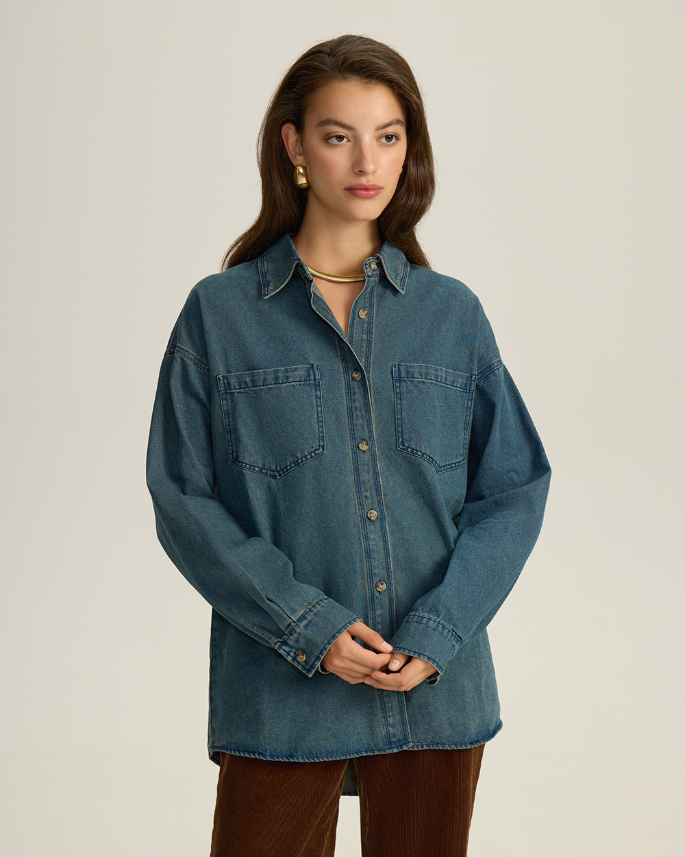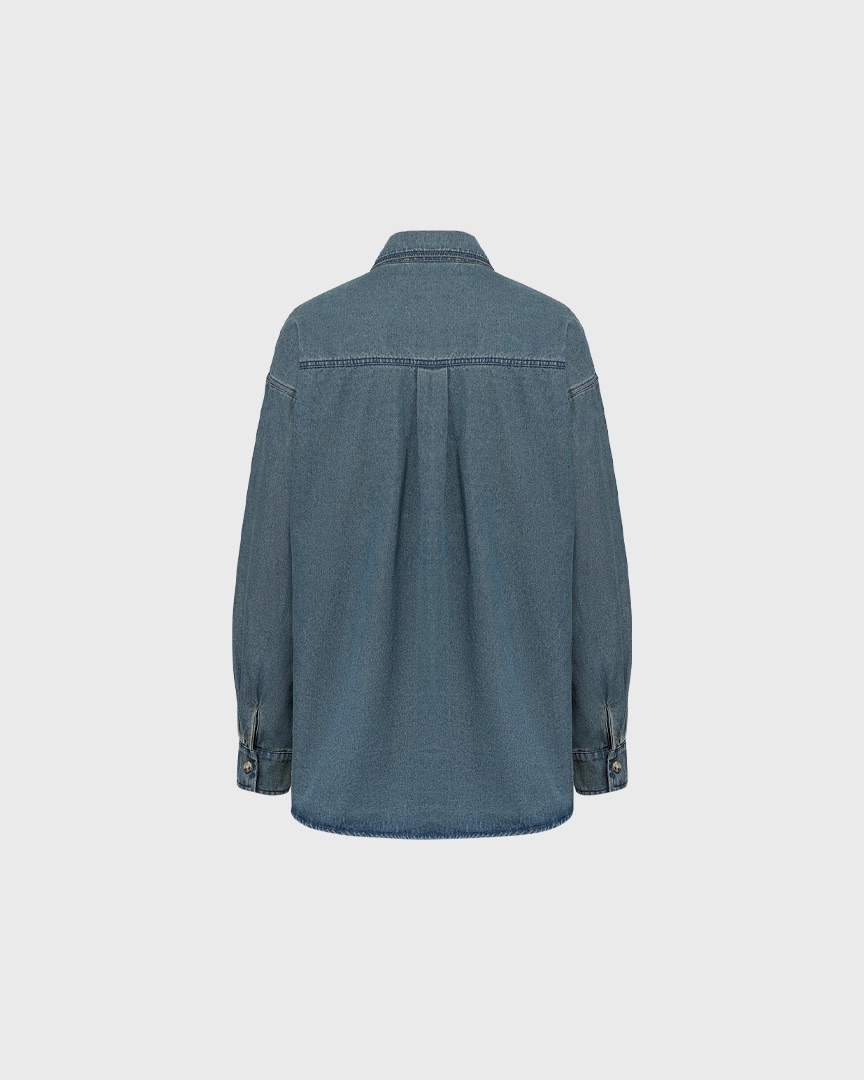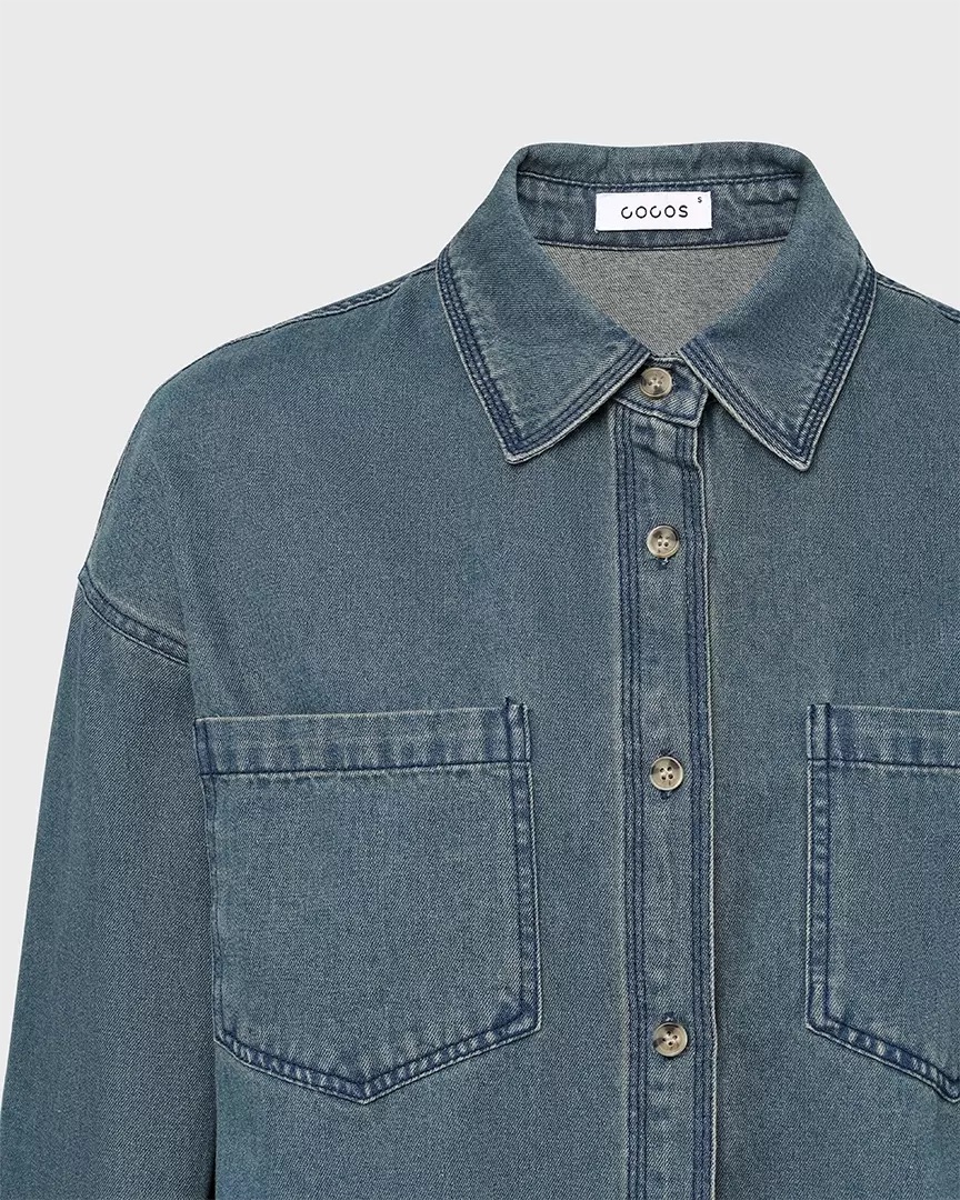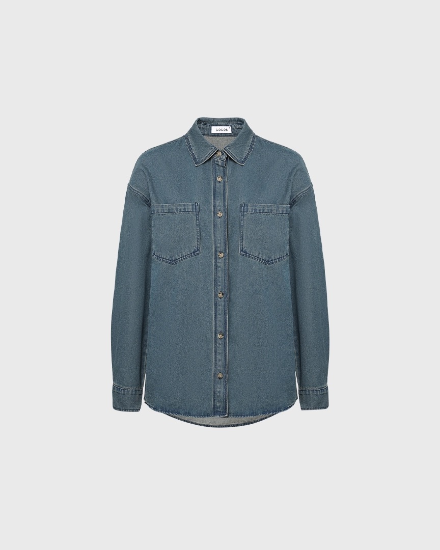 Джинсовая рубашка прямого кроя Отложной воротник, длинные рукава с манжетами. Застежка на пуговицы. Карманы на груди.