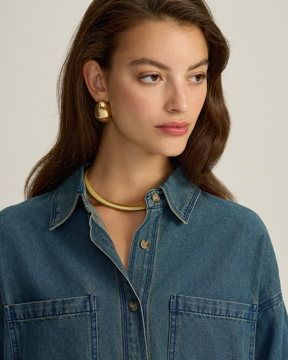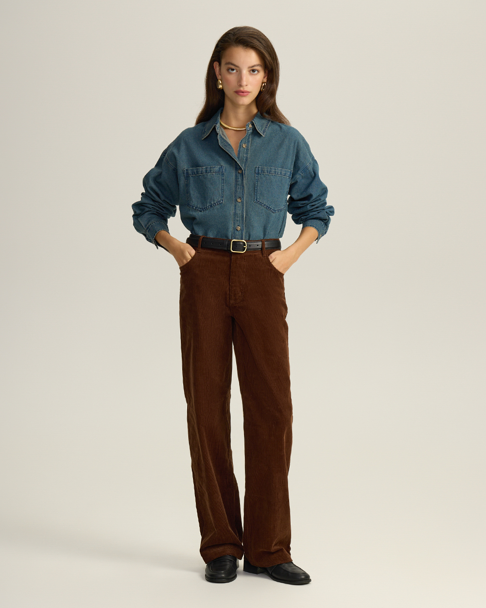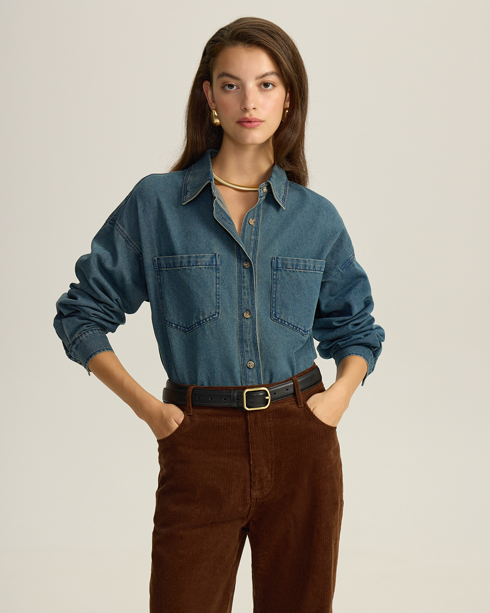 Джинсовая рубашка прямого кроя Отложной воротник, длинные рукава с манжетами. Застежка на пуговицы. Карманы на груди.