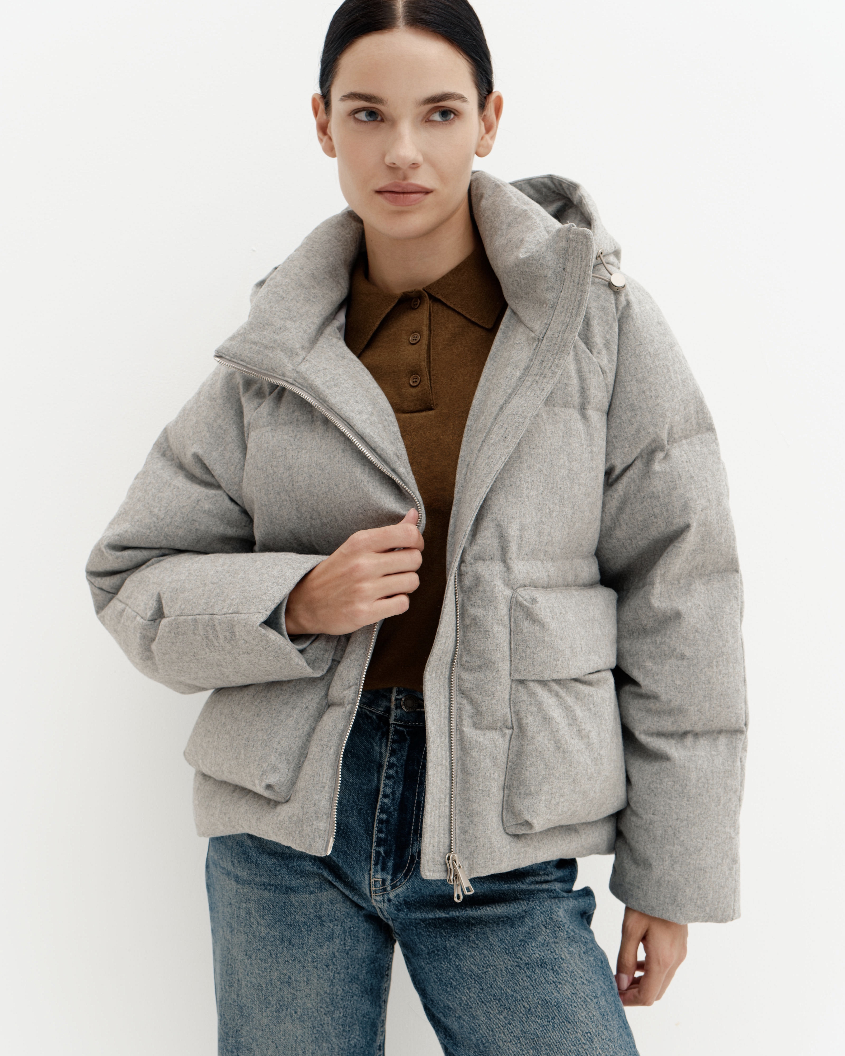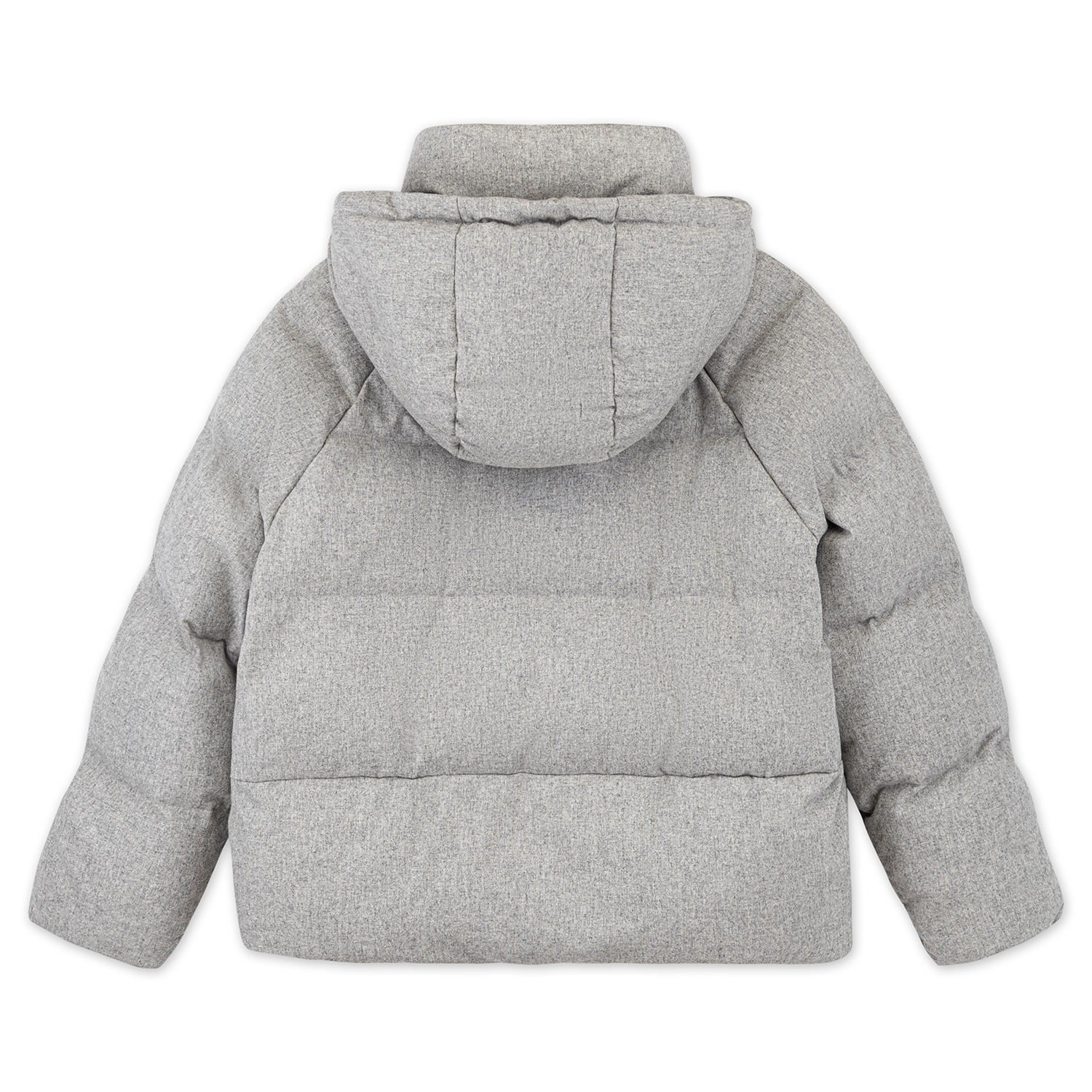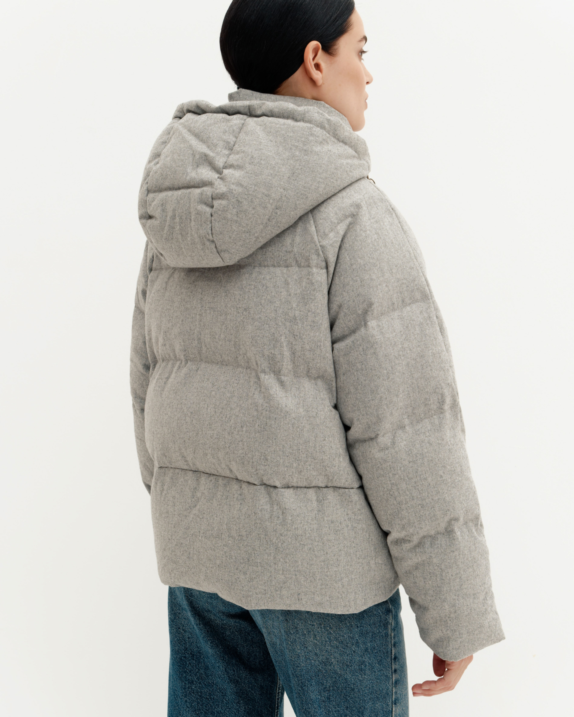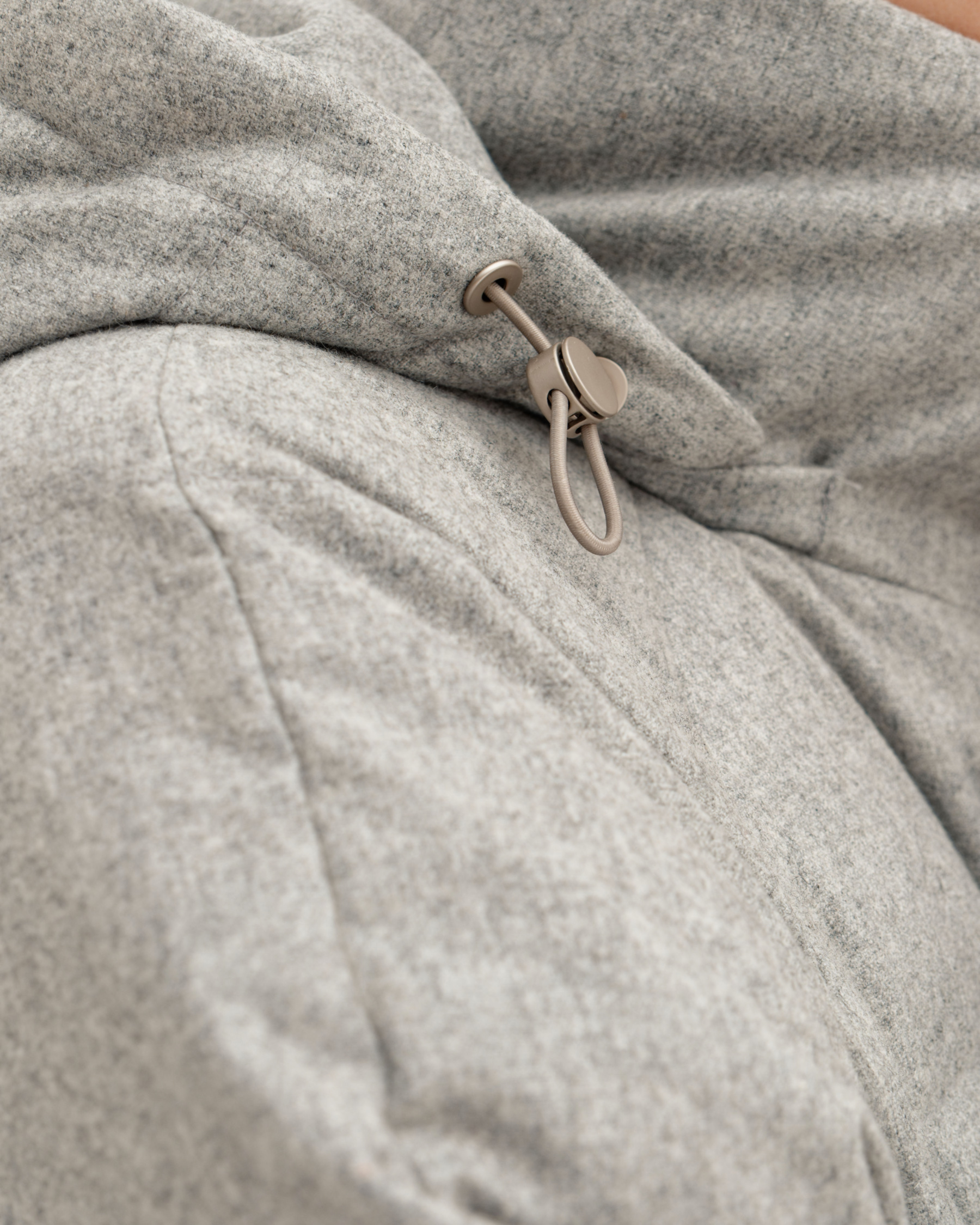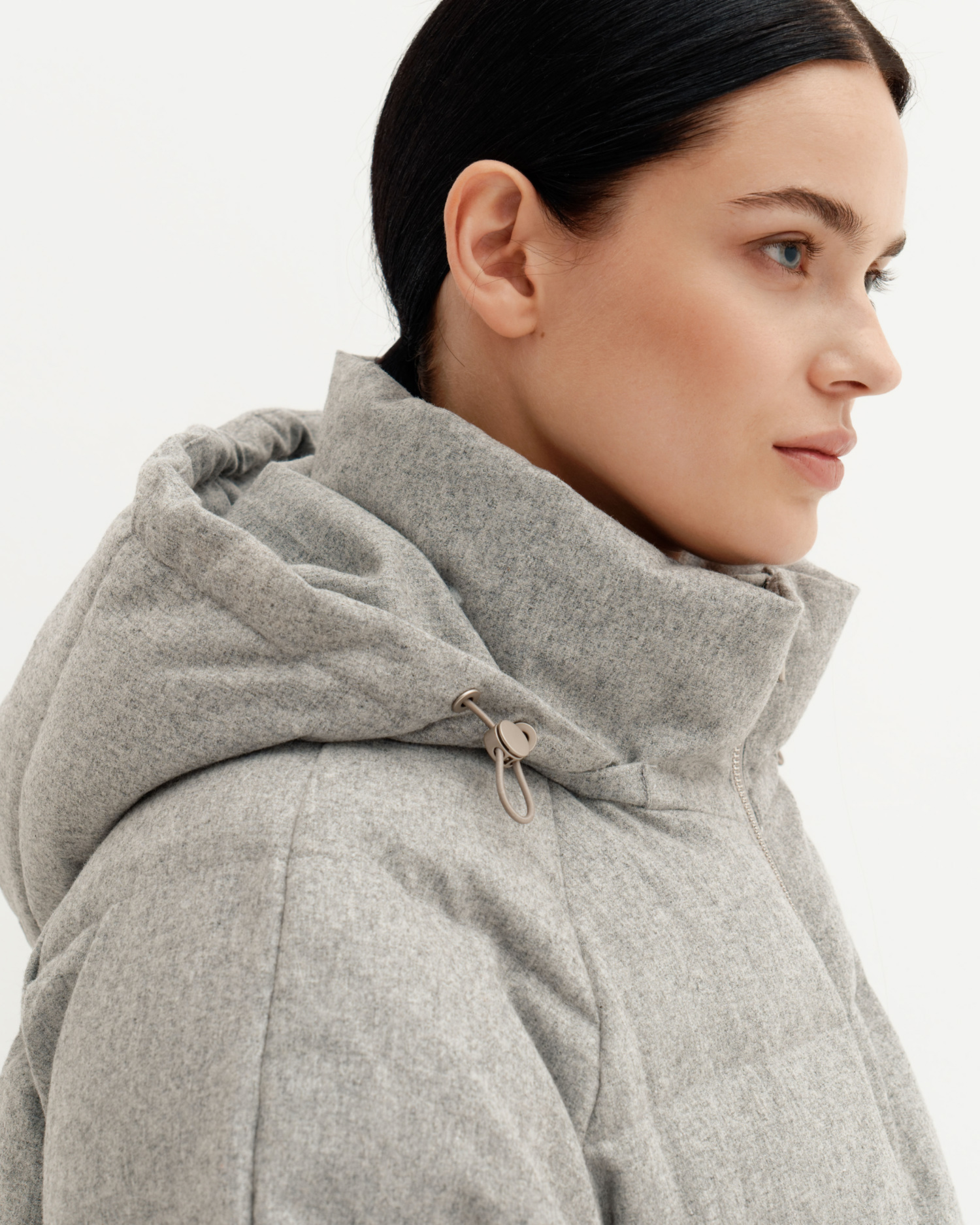 Пуховик из непромокаемой шерстяной пальтовой ткани с капюшоном, серый меланж