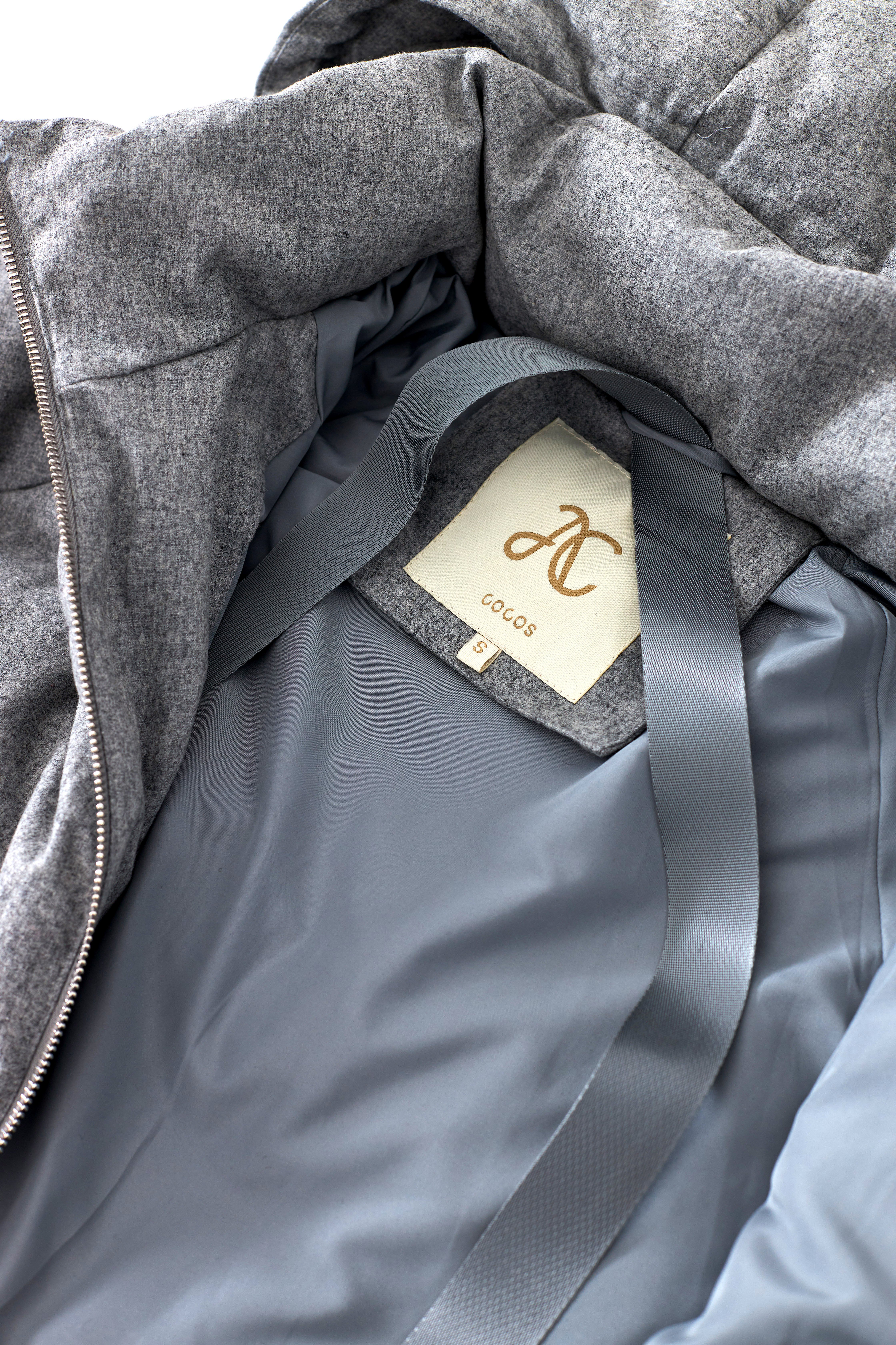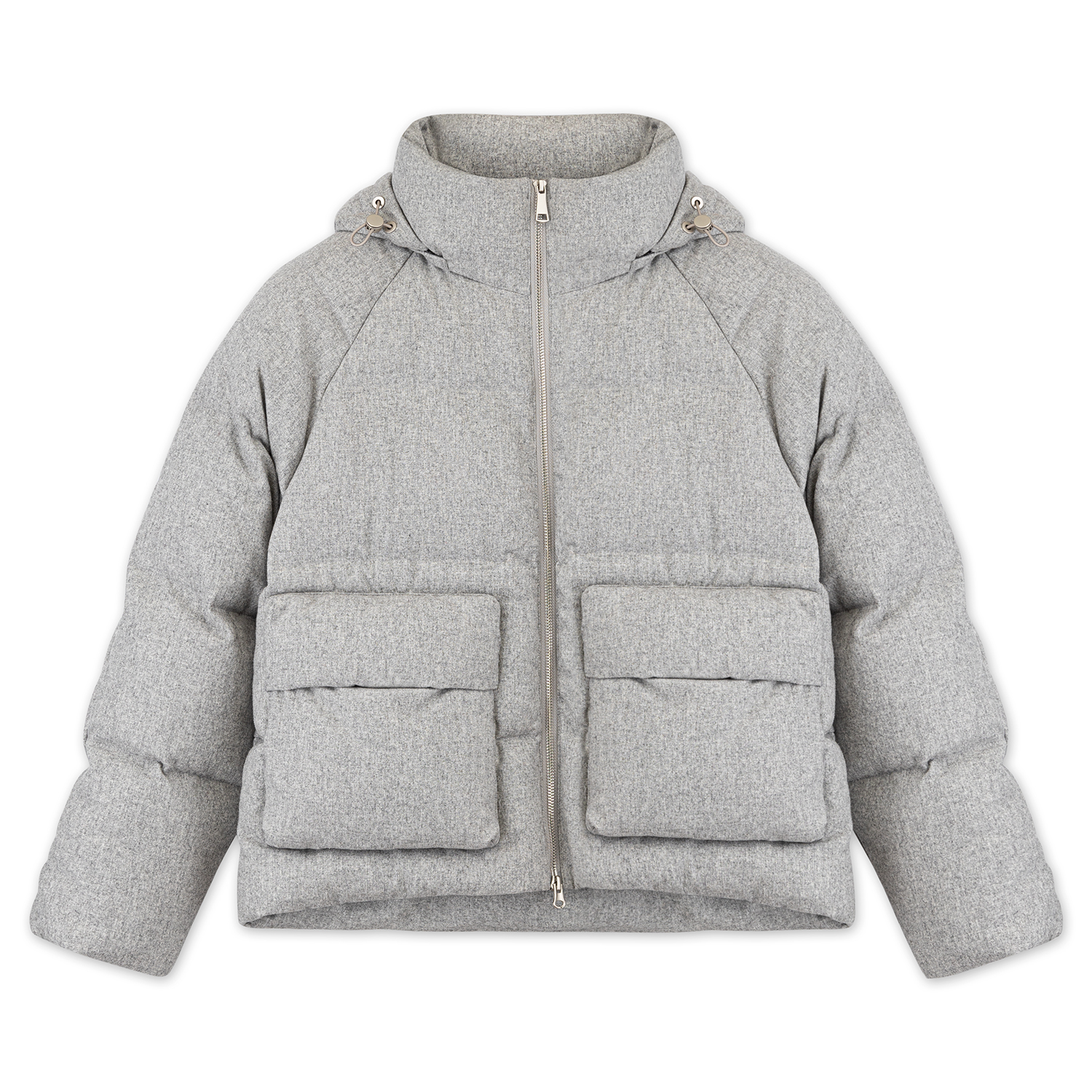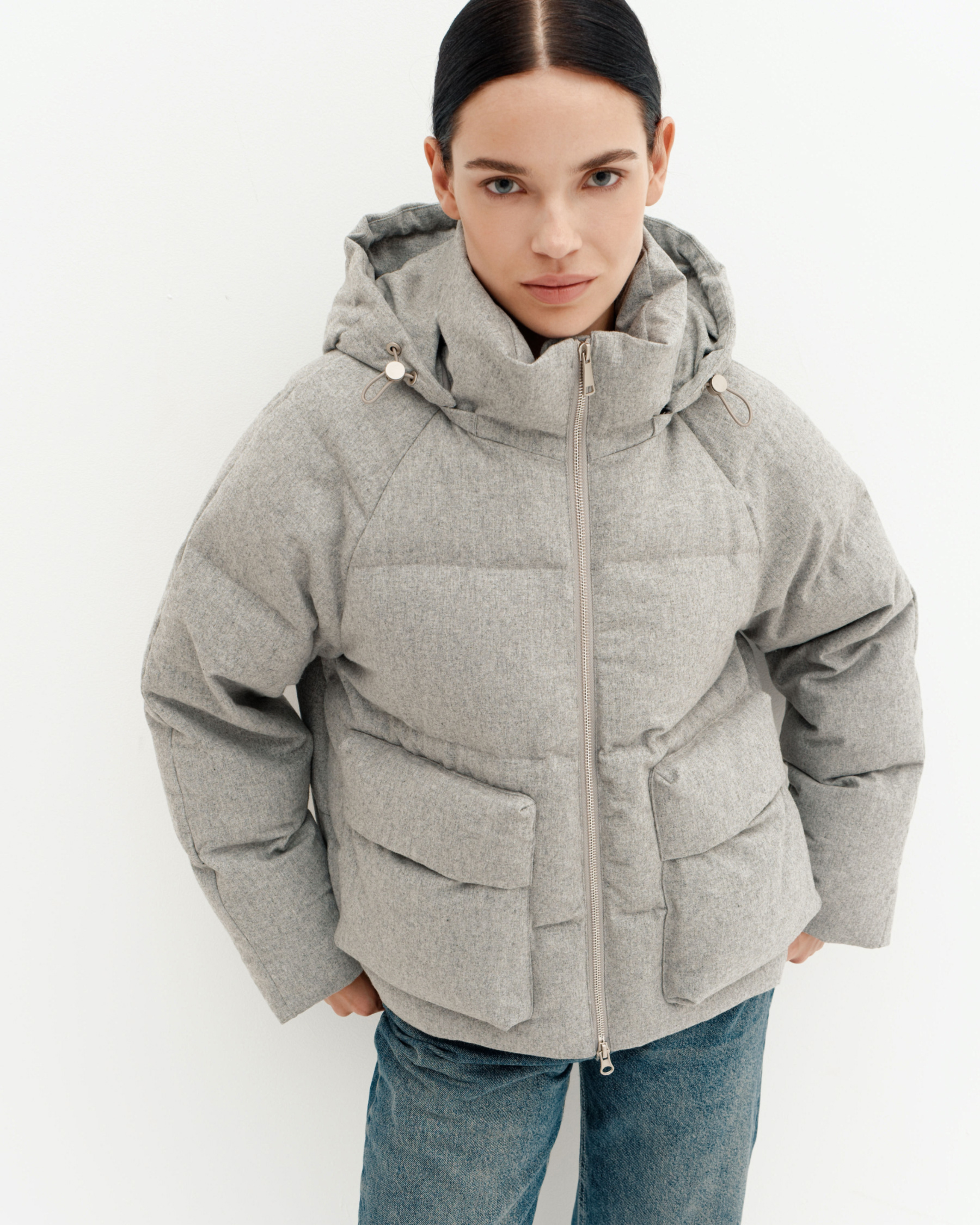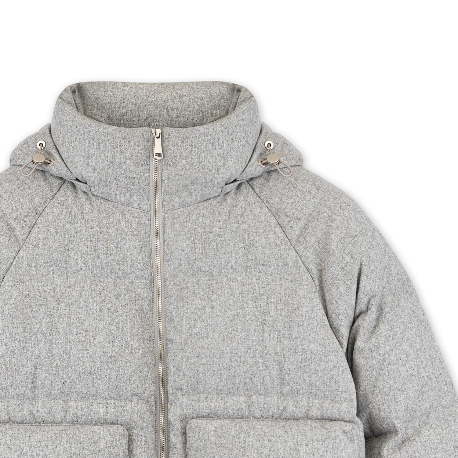 Пуховик из непромокаемой шерстяной пальтовой ткани с капюшоном, серый меланж