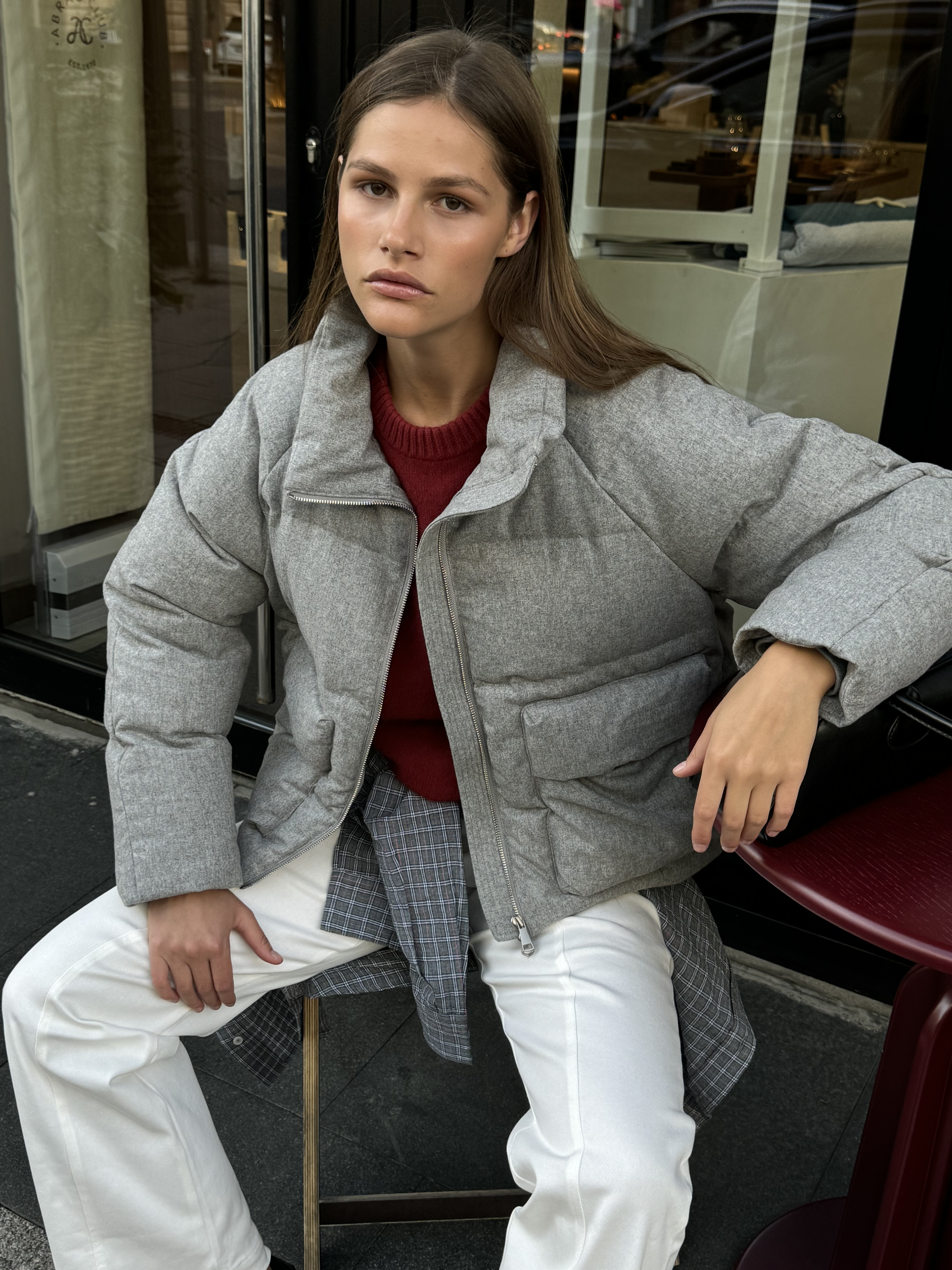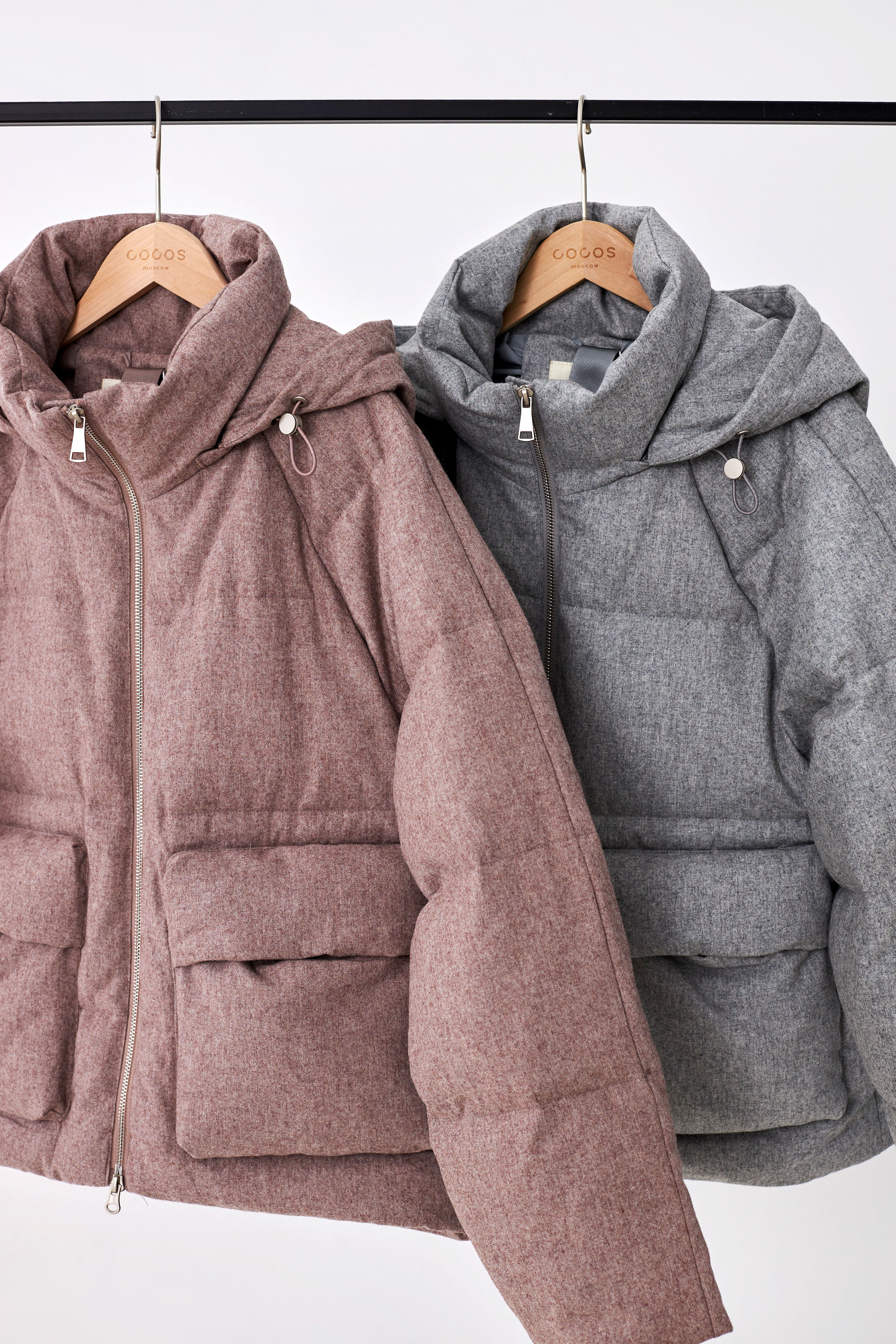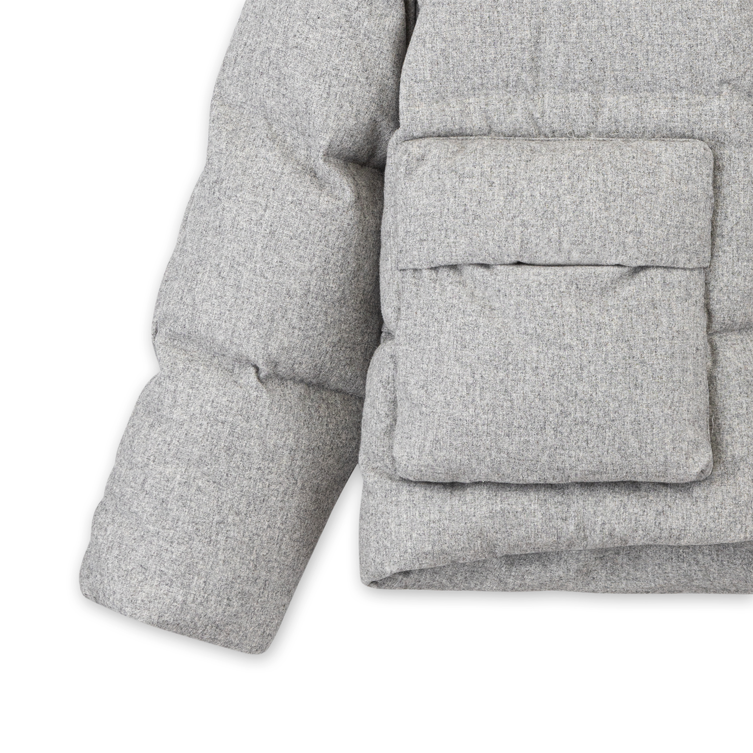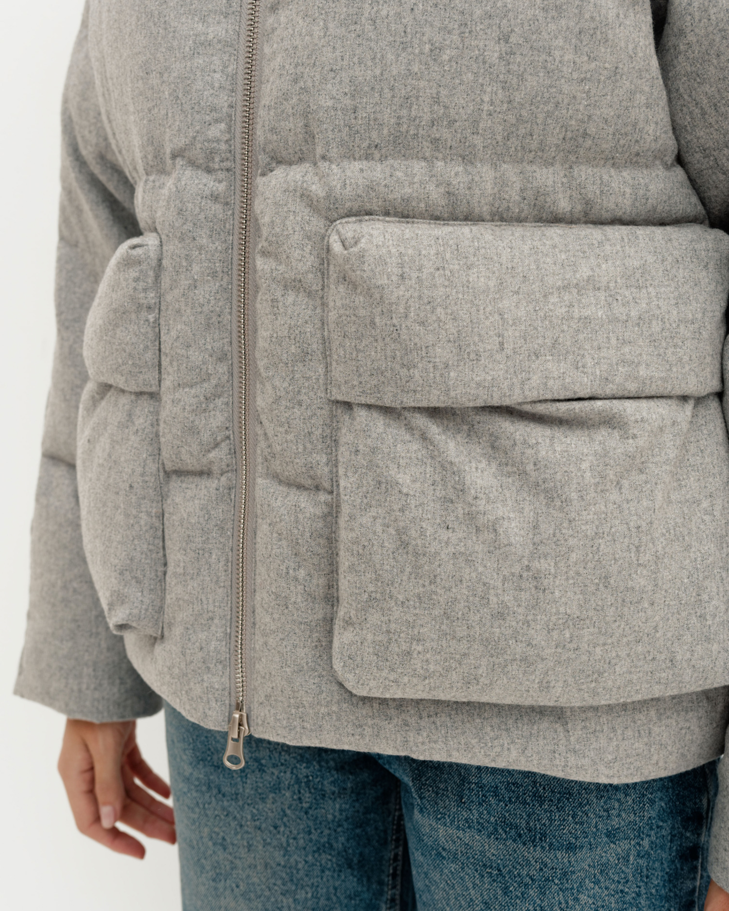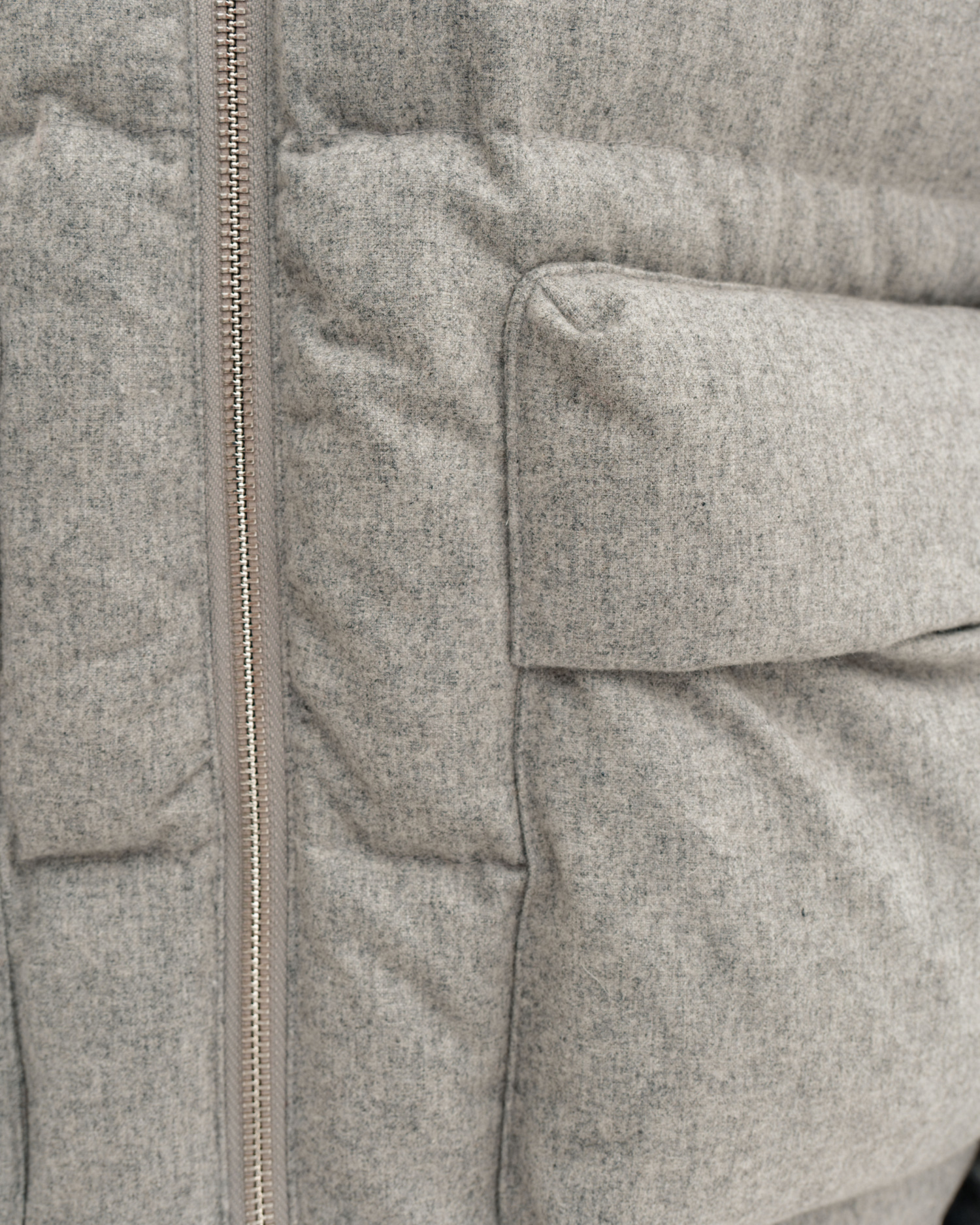 Пуховик из непромокаемой шерстяной пальтовой ткани с капюшоном, серый меланж