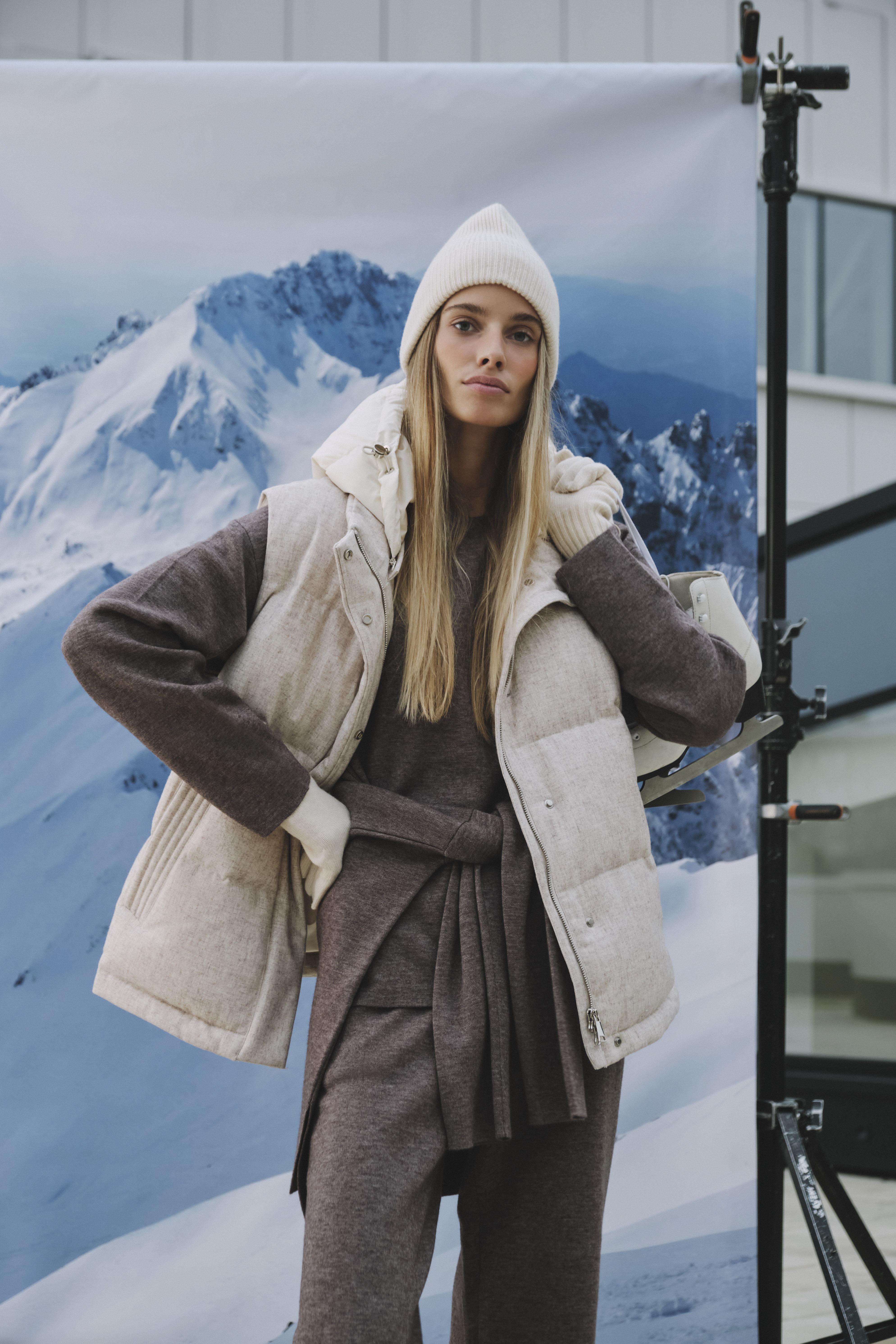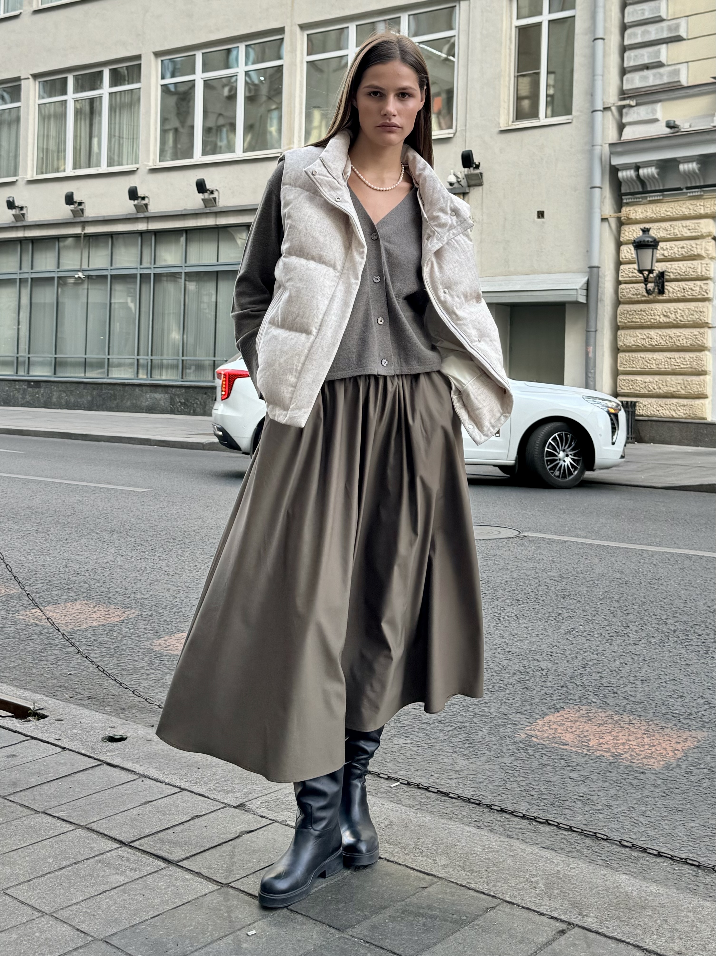 Непромокаемый прямой, объемный жилет с капюшоном. Застежка на молнию и кнопки. Главная особенность — в шерстяной ткани верха, напоминающей фактурную благородную ткань пальто, но непромокаемой благодаря современным технологиям.