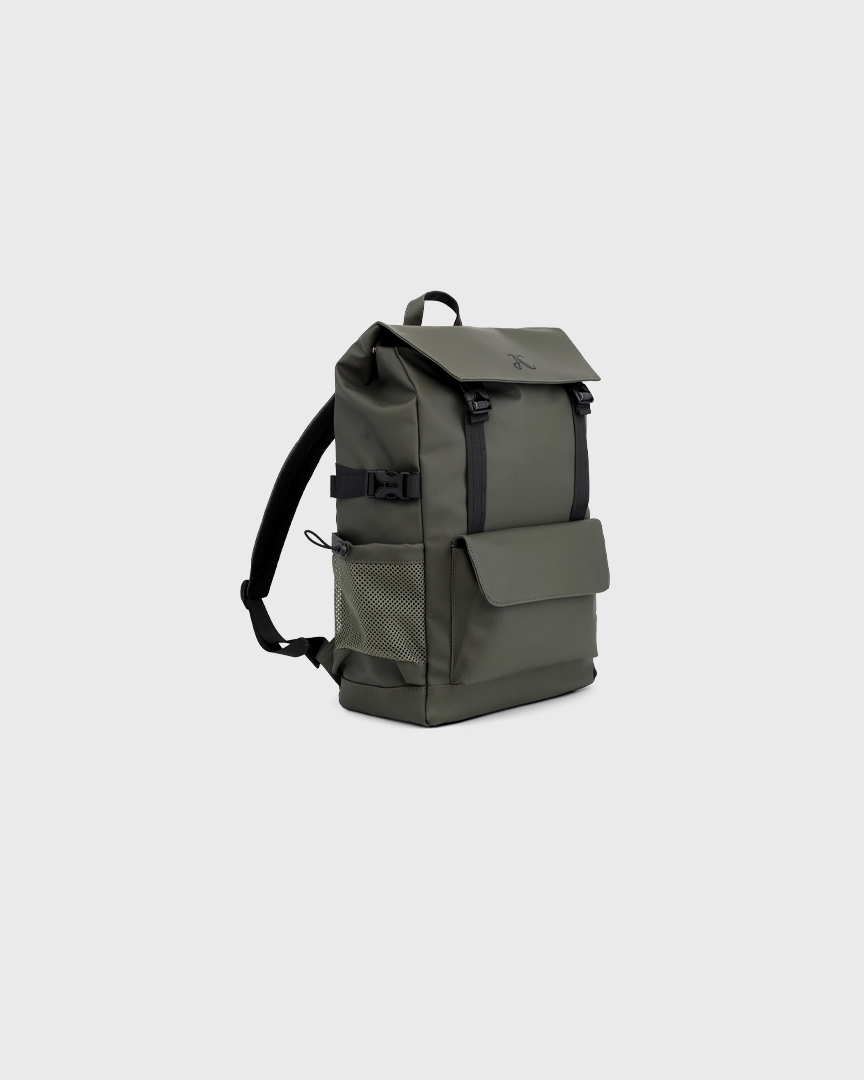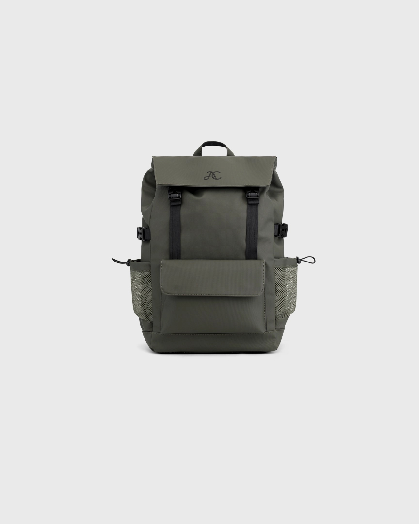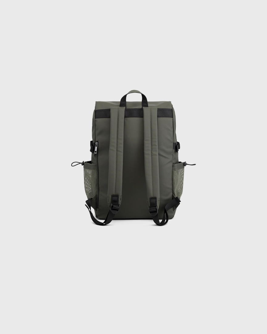 Застёжка на клапан с пряжкой. Внешний объёмный карман на кнопке, два боковых открытых отделения и потайной карман на молнии сзади.
