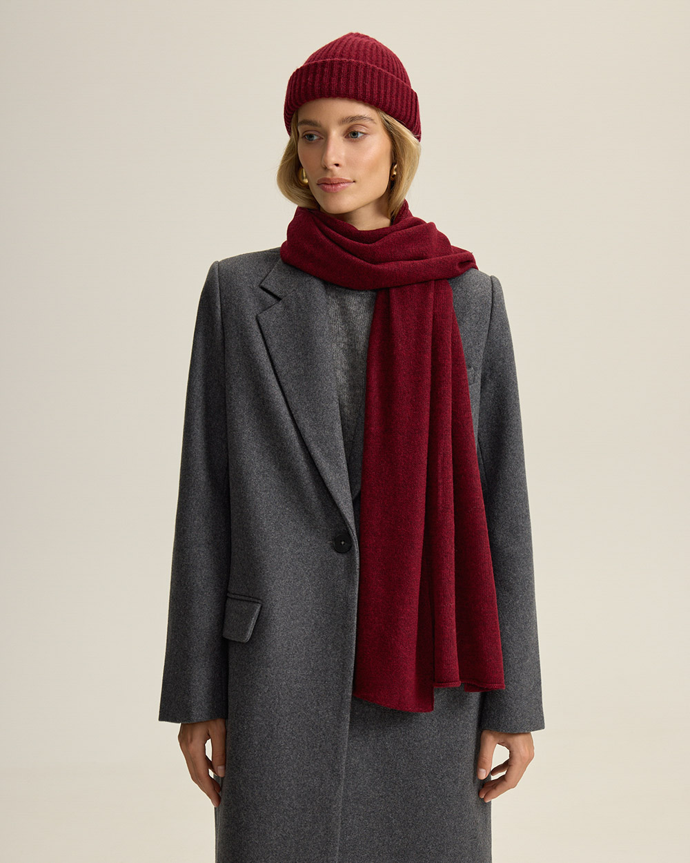 Теплая шапка "бини" с двумя отворотами фактурной вязки, из шерсти и кашемира первоклассного качества. Подойдет как мужчинам, так и женщинам. Фирменный винный оттенок станет стильным акцентом. Образ можно дополнить трикотажным шарфом винного оттенка, а также носками из шерсти и кашемира с вышивкой "елочка".