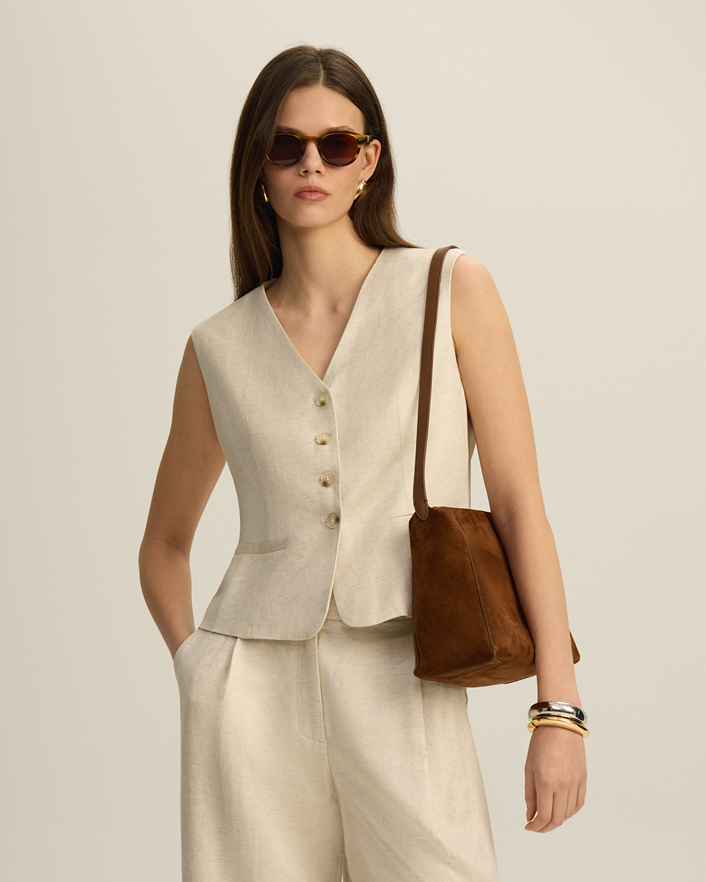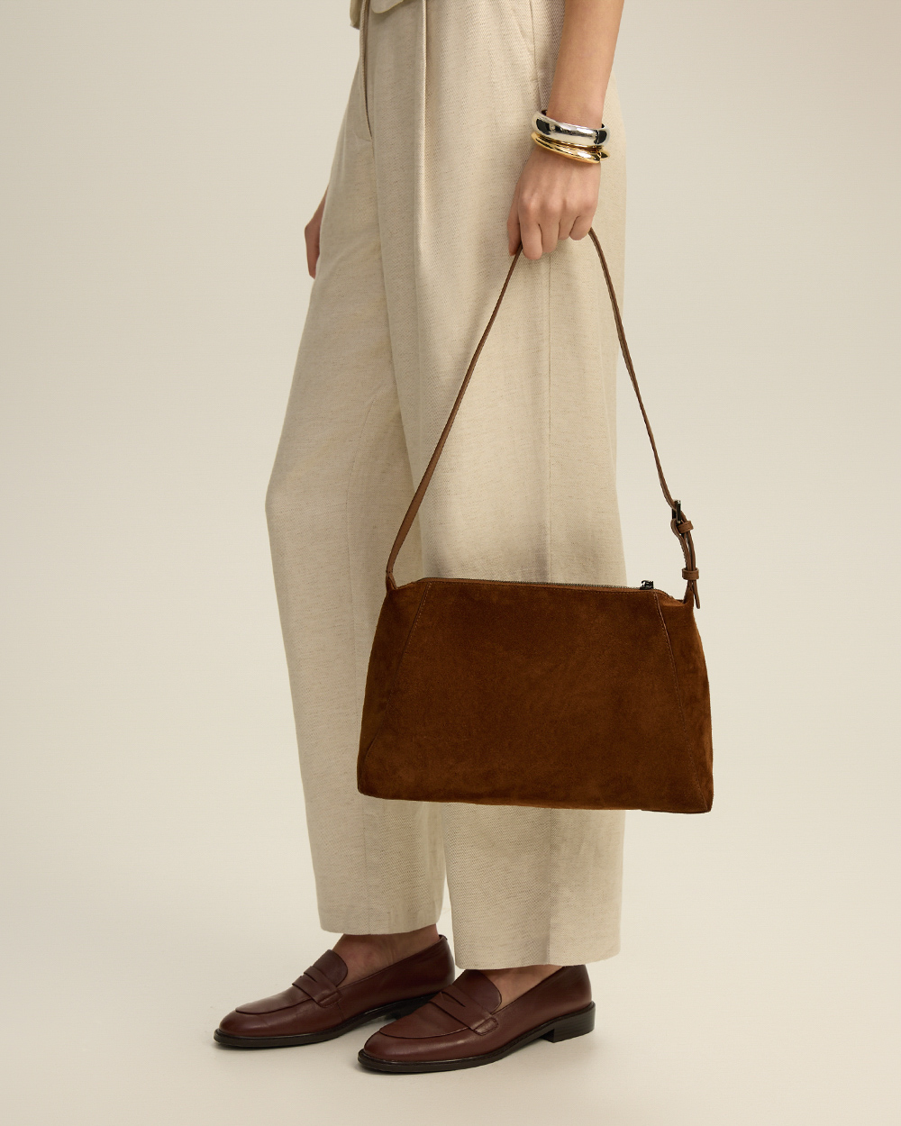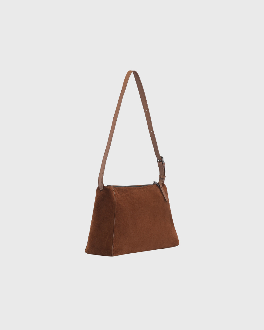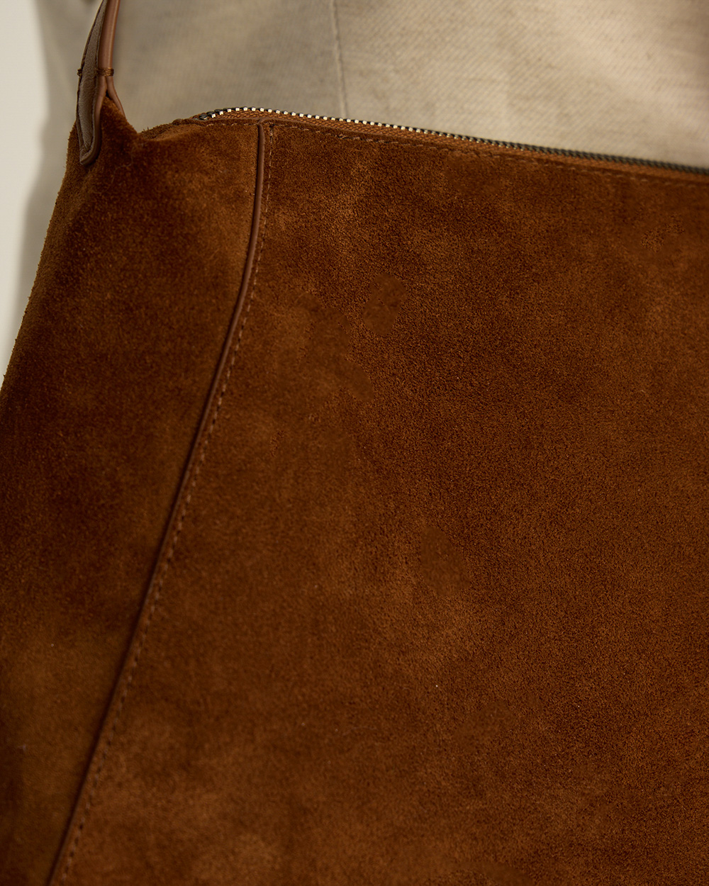 Натуральная замша может окрашивать светлые вещи, особенно во влажную погоду, поэтому ручка-ремень выполнена из гладкой кожи.