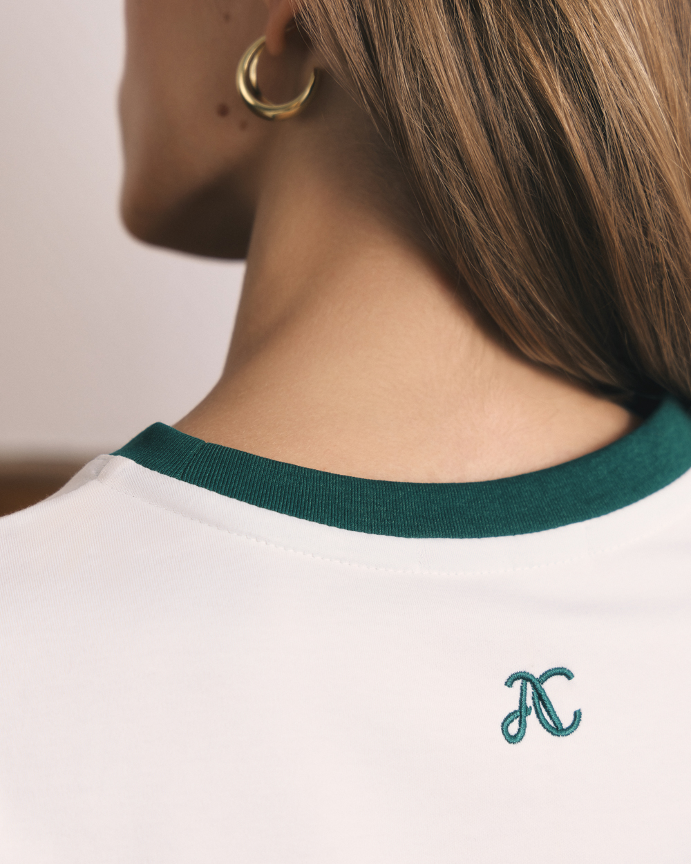 Футболка приталенного кроя в ретро-стиле из эластичного материала с контрастными деталями. Выполнена из хлопка с добавлением спандекса. Сзади вышивка AC (монограмма Abrau Club).