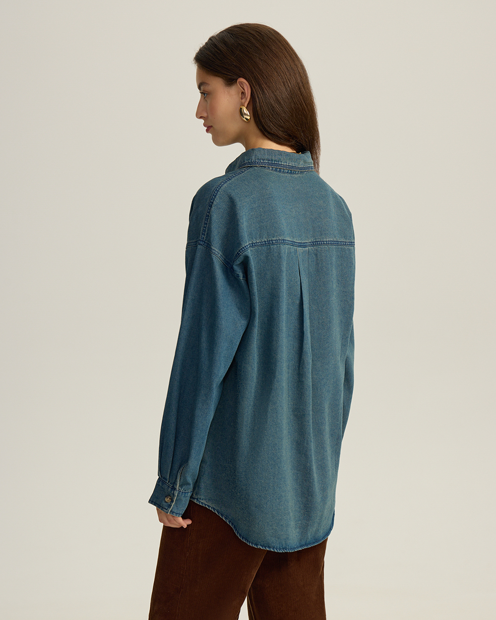 Джинсовая рубашка прямого кроя Отложной воротник, длинные рукава с манжетами. Застежка на пуговицы. Карманы на груди.