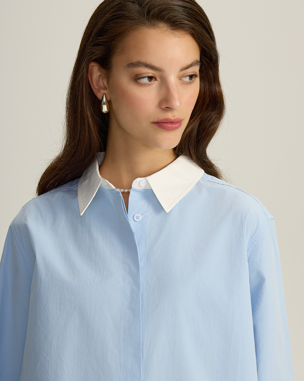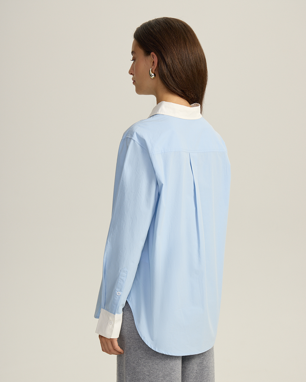 Рубашка объемного кроя выполнена из дышащего 100% хлопка, что обеспечит вам максимальный комфорт и свободу движений в течение всего дня. Спущенная линия плеча и прямой силуэт придают образу расслабленную, но элегантную небрежность. Контрастные, отличающиеся по цвету, манжеты и воротник — интересное дизайн-решение для классической модели .