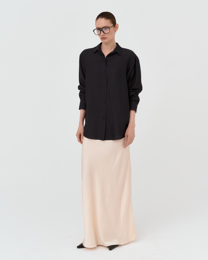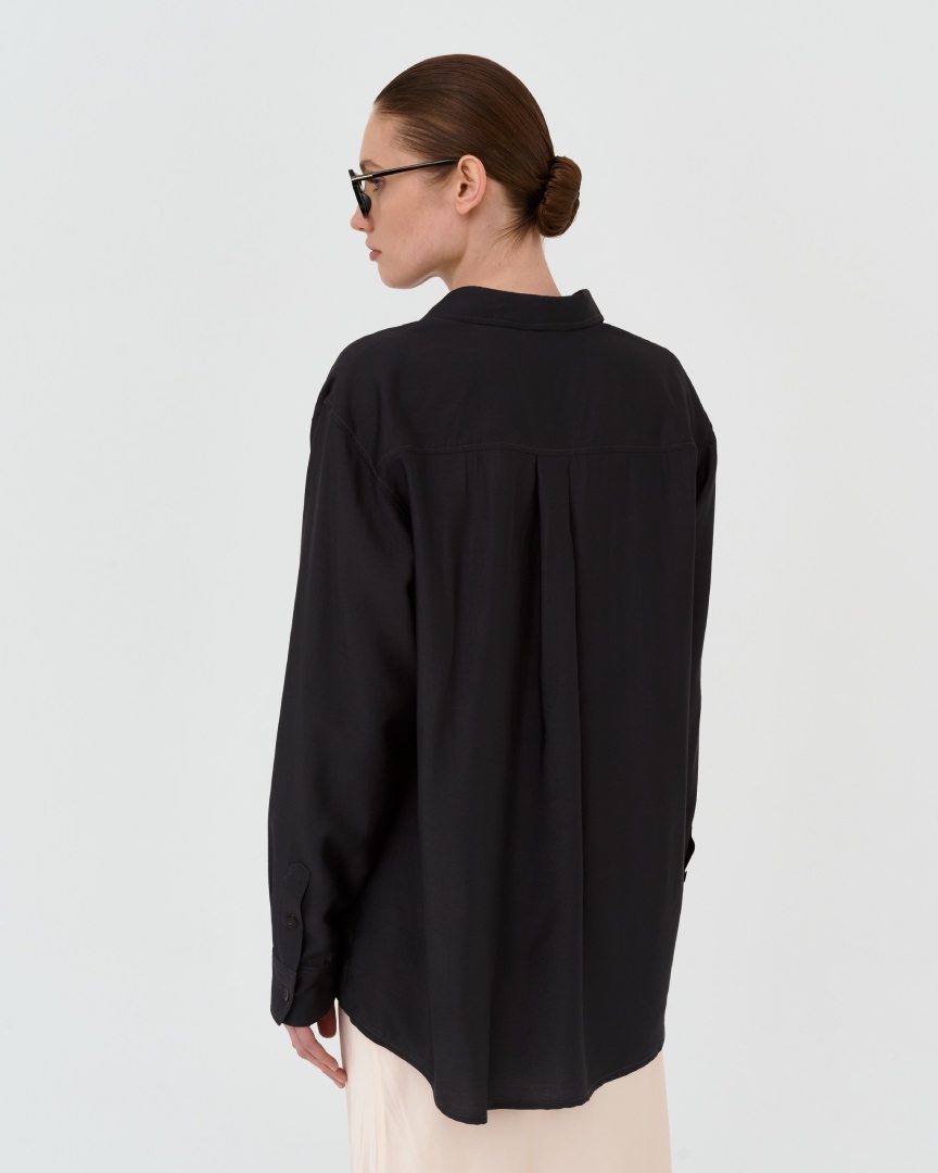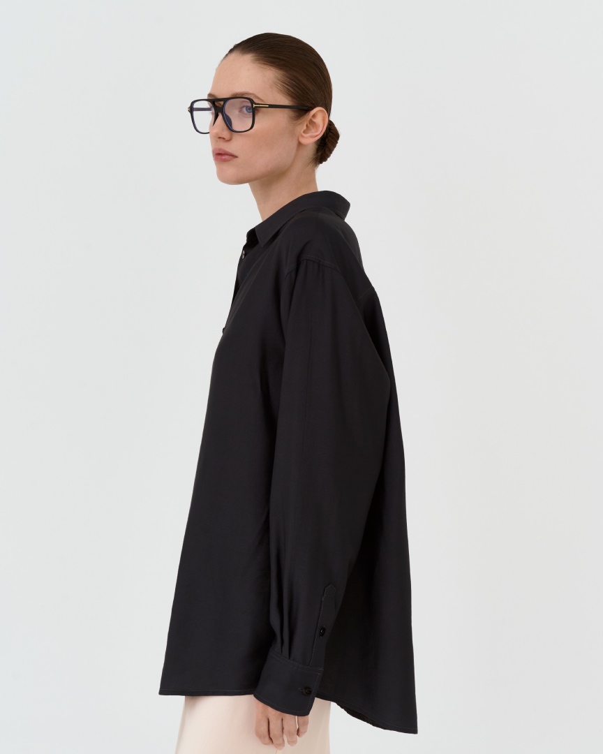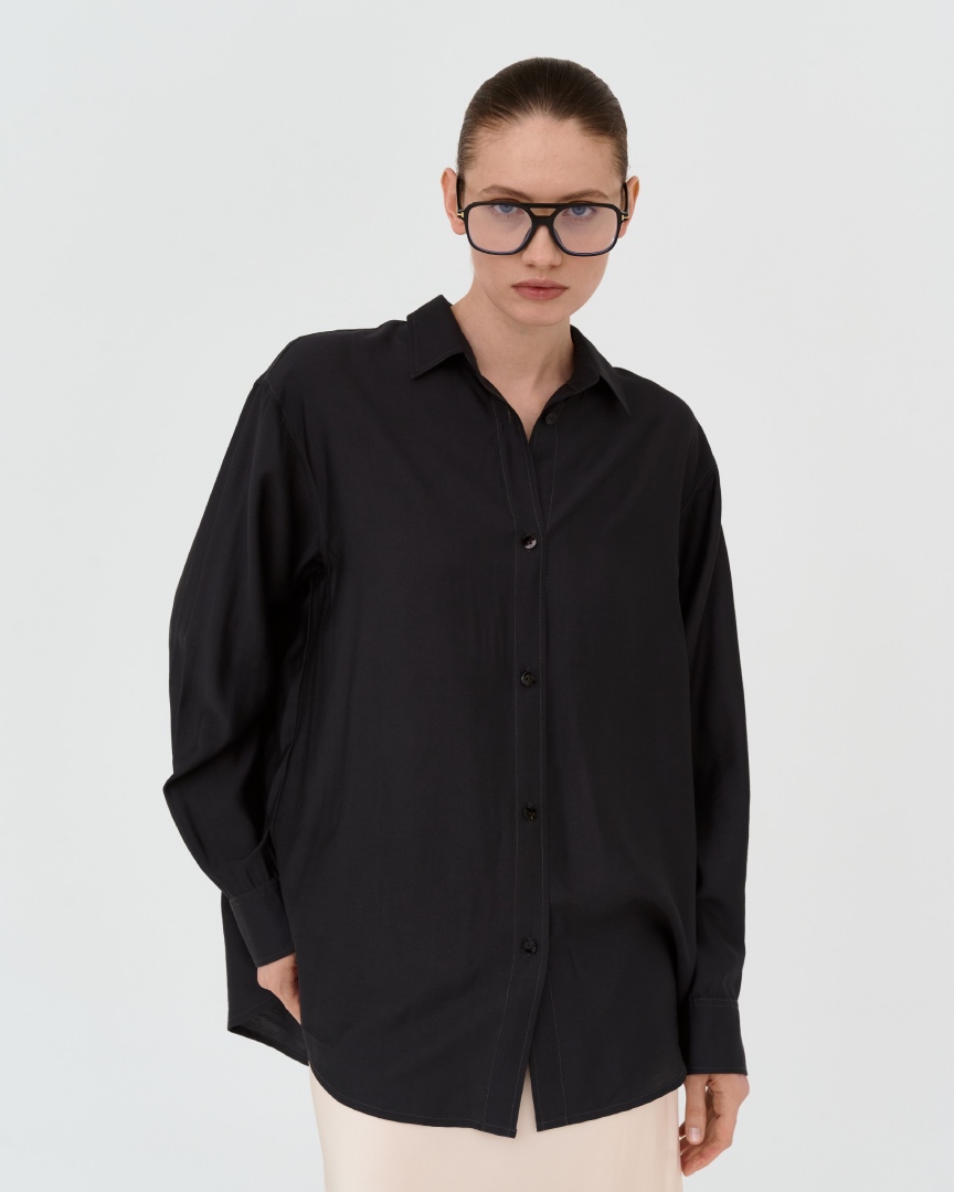 Классическая рубашка графитового оттенка из комфортной вискозы с легким блеском. Планка с пуговицами, отложной воротник, манжеты с пуговицами.