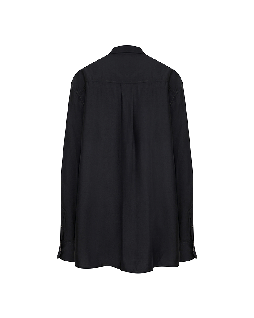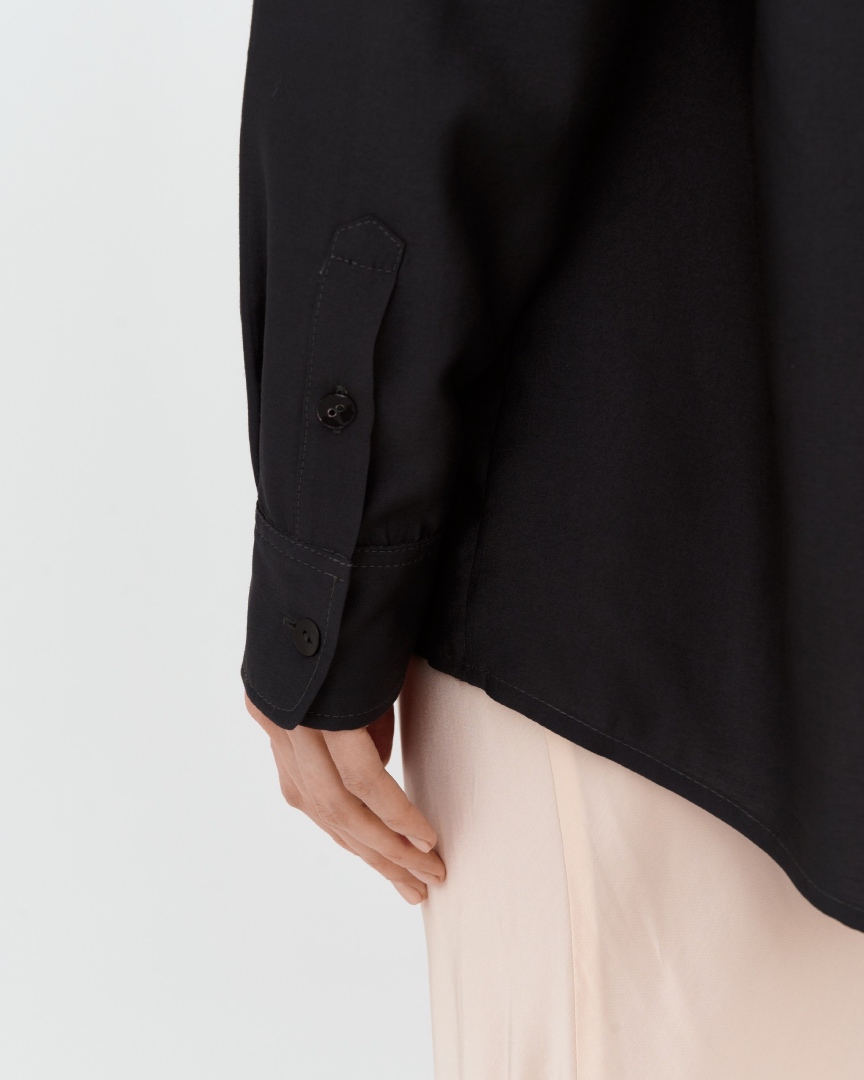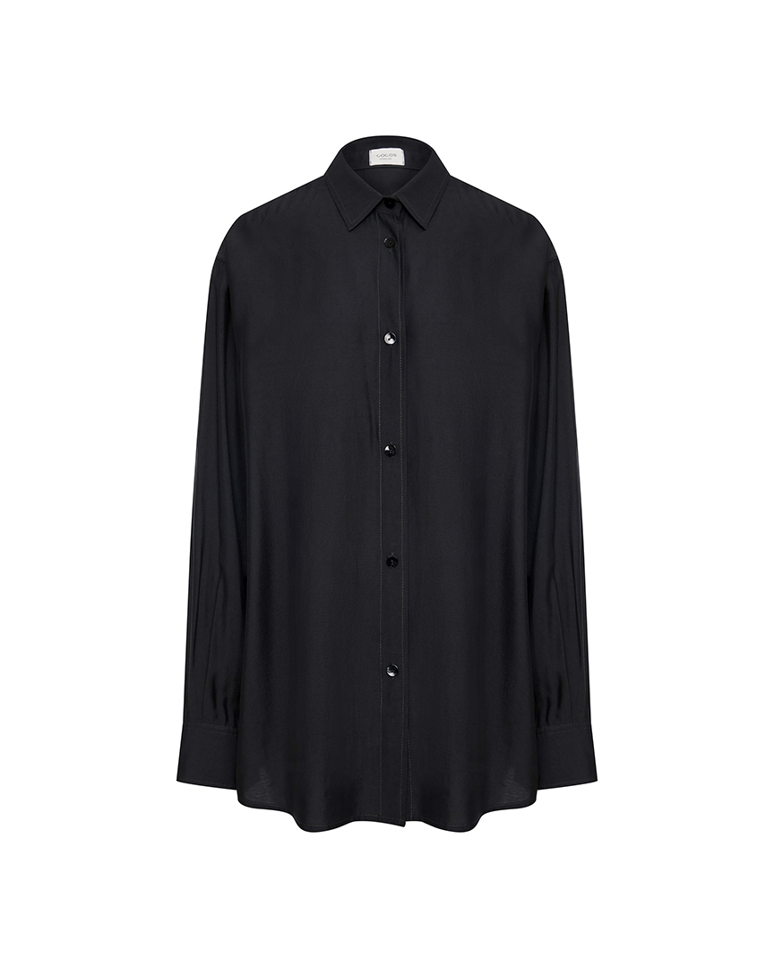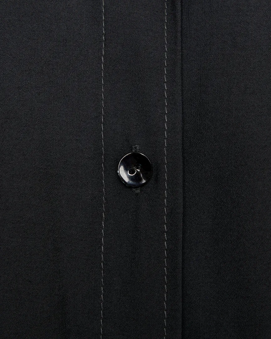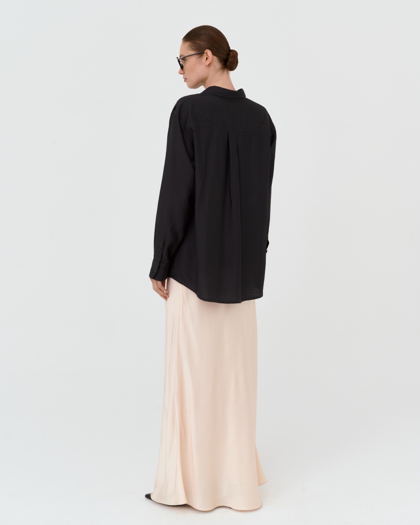 Классическая рубашка графитового оттенка из комфортной вискозы с легким блеском. Планка с пуговицами, отложной воротник, манжеты с пуговицами.