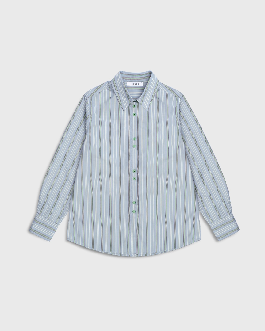 Рубашка свободного кроя в полоску. Отложной воротник. Длинные рукава с манжетами. Закругленный низ. Застежка на акцентные пуговицы.