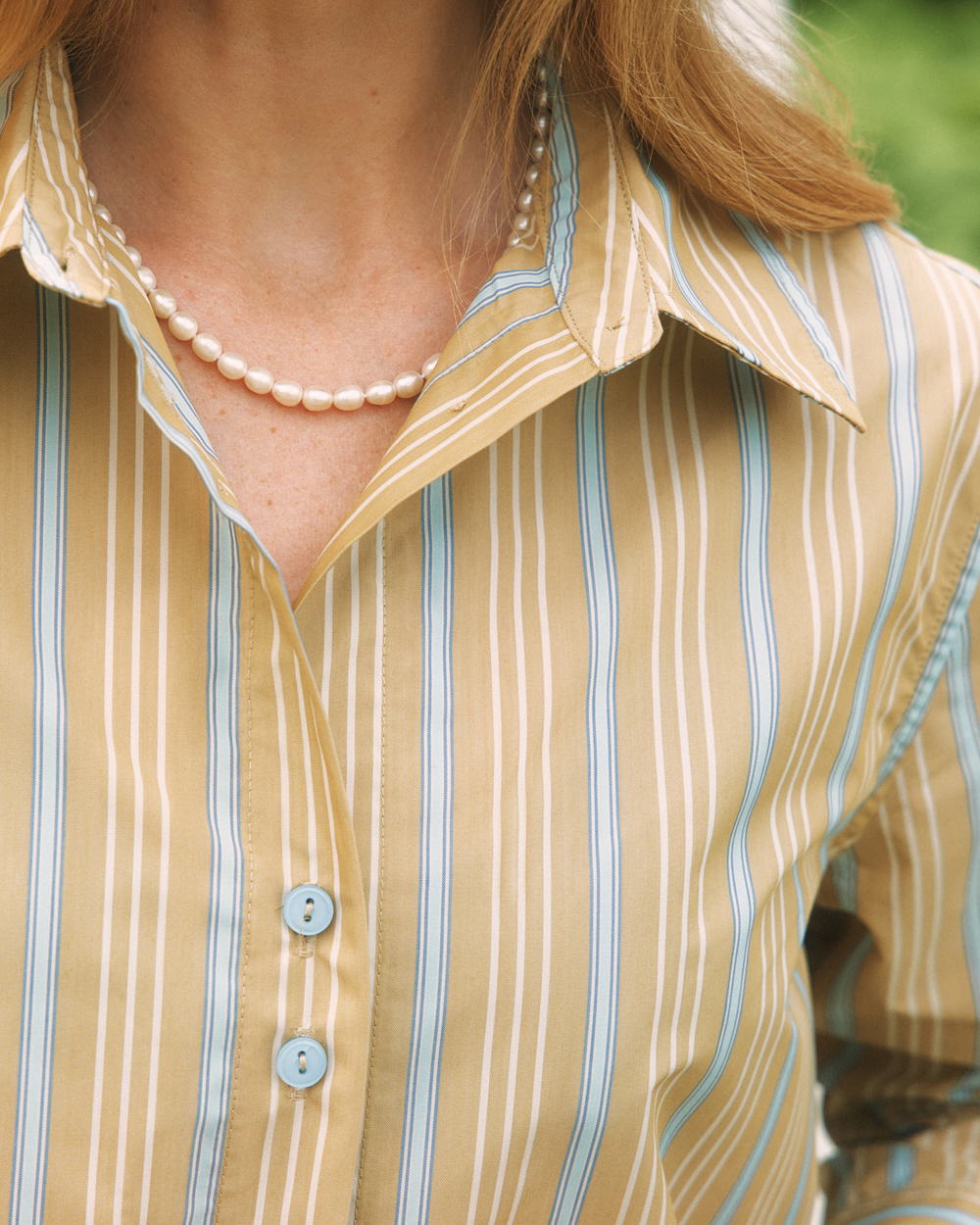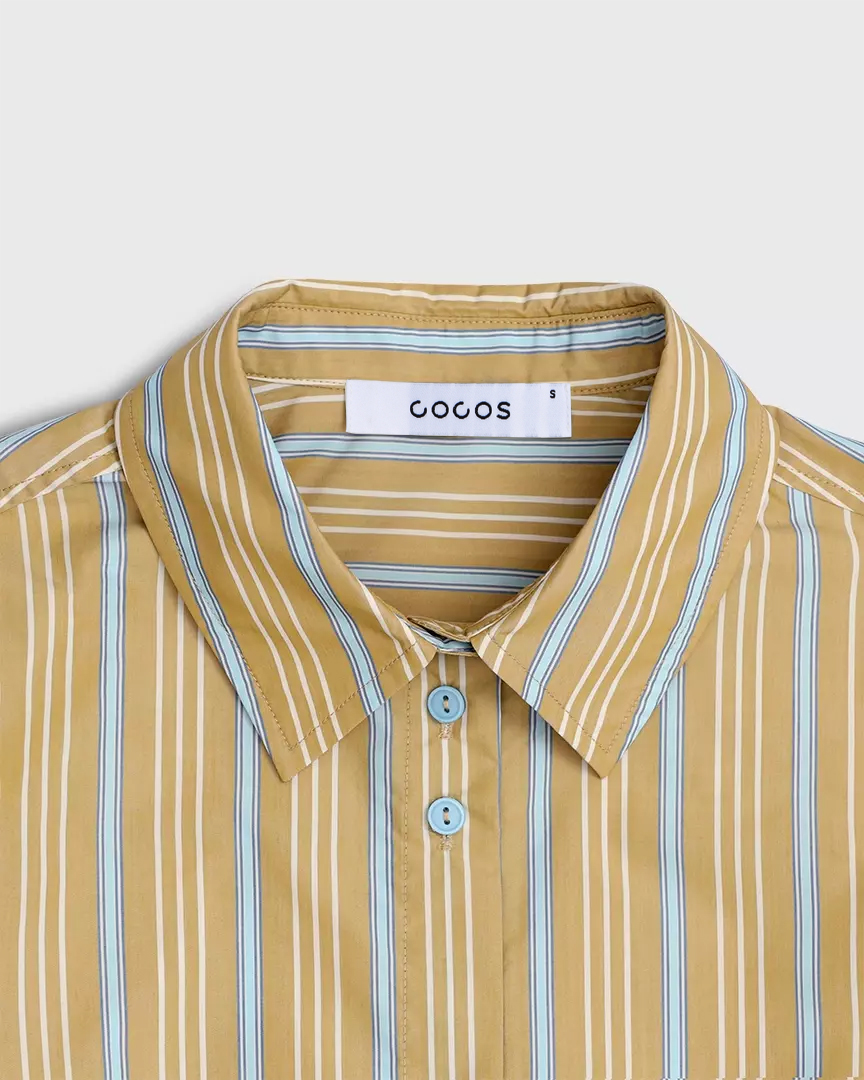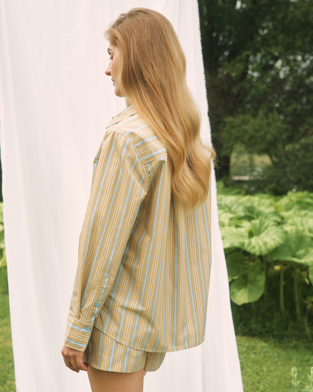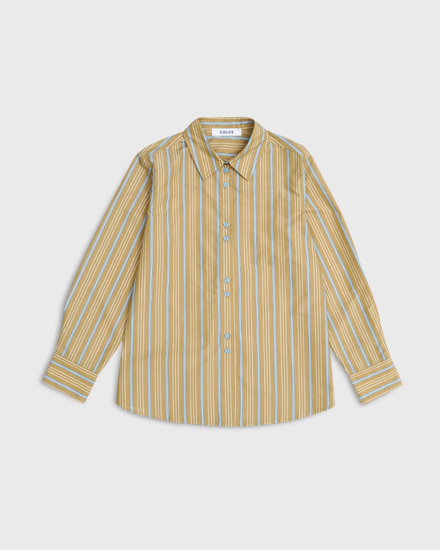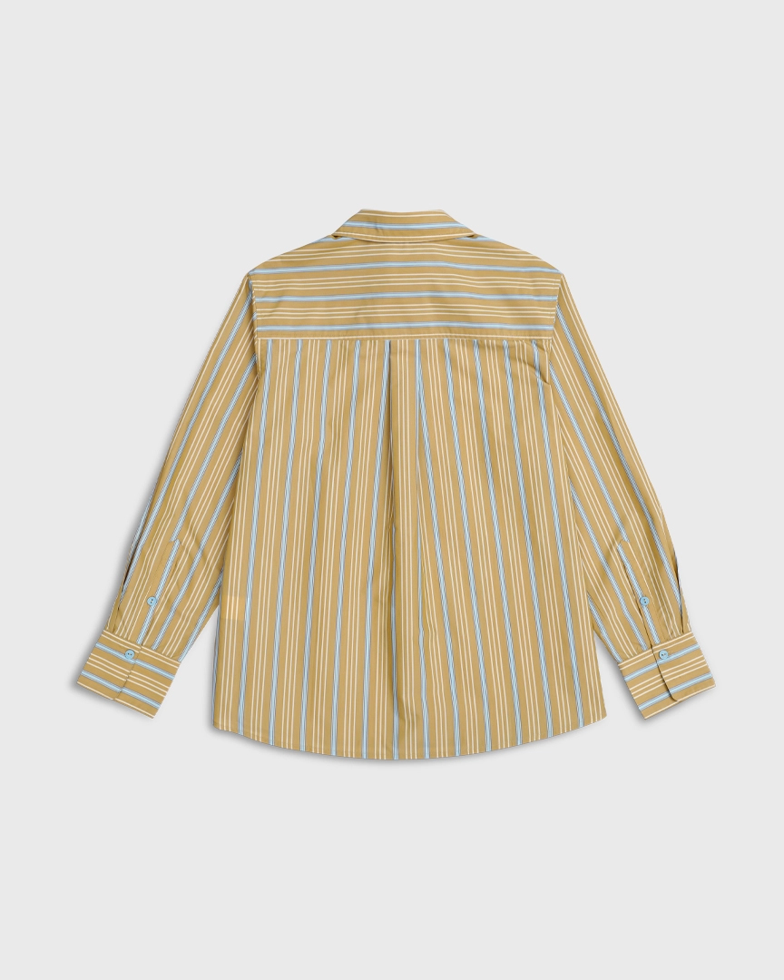 Рубашка свободного кроя в полоску. Отложной воротник. Длинные рукава с манжетами. Закругленный низ. Застежка на акцентные пуговицы.