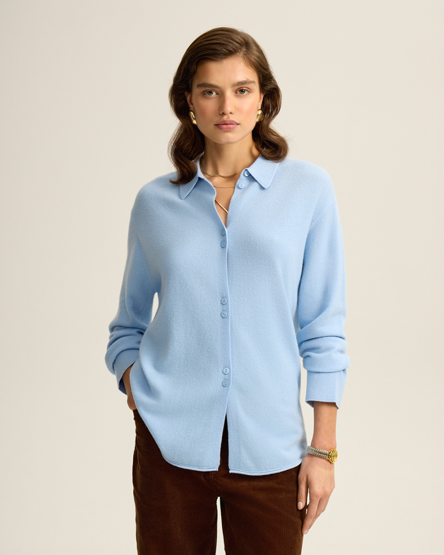 Трикотажная рубашка и кардиган в одном изделии — универсальная модель из мягкой шерсти мериноса. Нежный, тактильно приятный материал и свободный крой обеспечивают комфорт и свободу движений. Отложной воротник и пуговицы в тон, нестандартно расставленные парами, делают образ элегантным и выразительным.