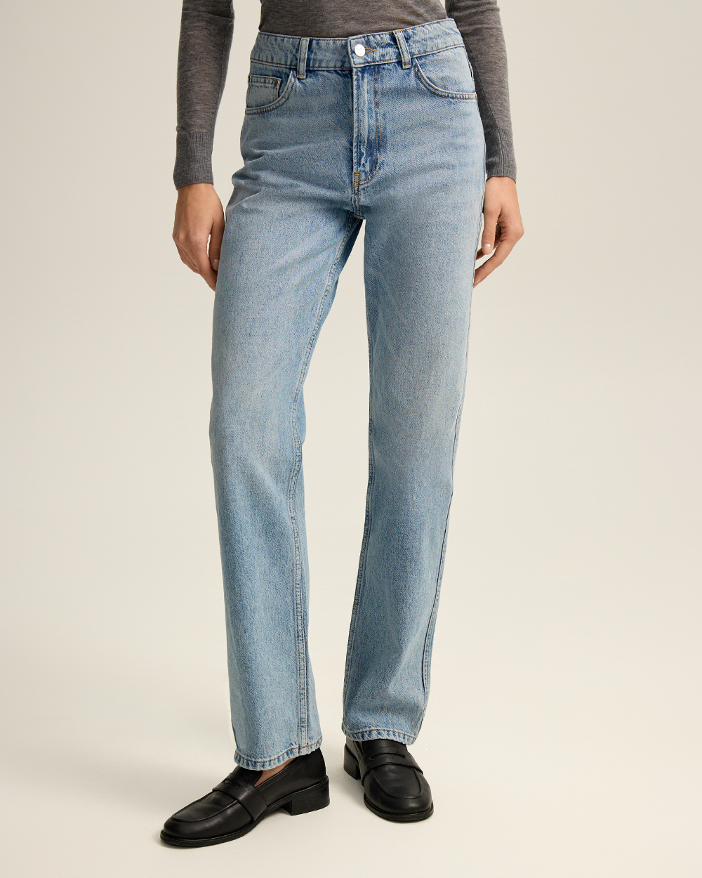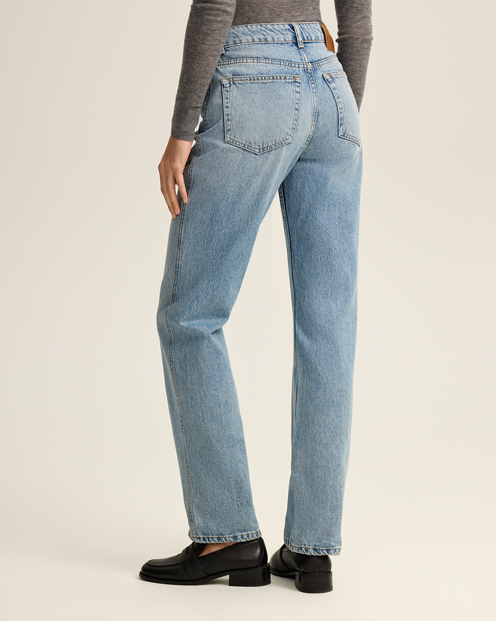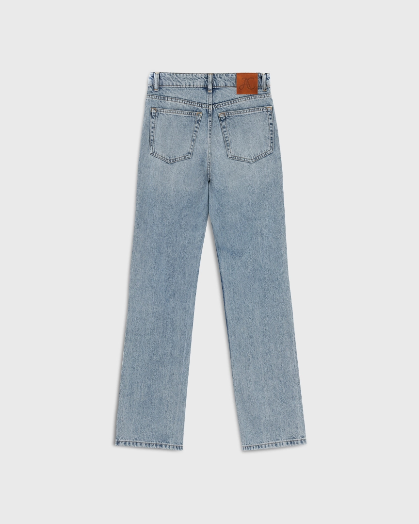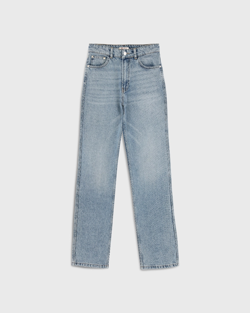 Джинсы прямого кроя классической посадки. Комфортный деним из 100% хлопка светло-голубого оттенка с легким эффектом потертостей. Округлые карманы спереди, карманы сзади.