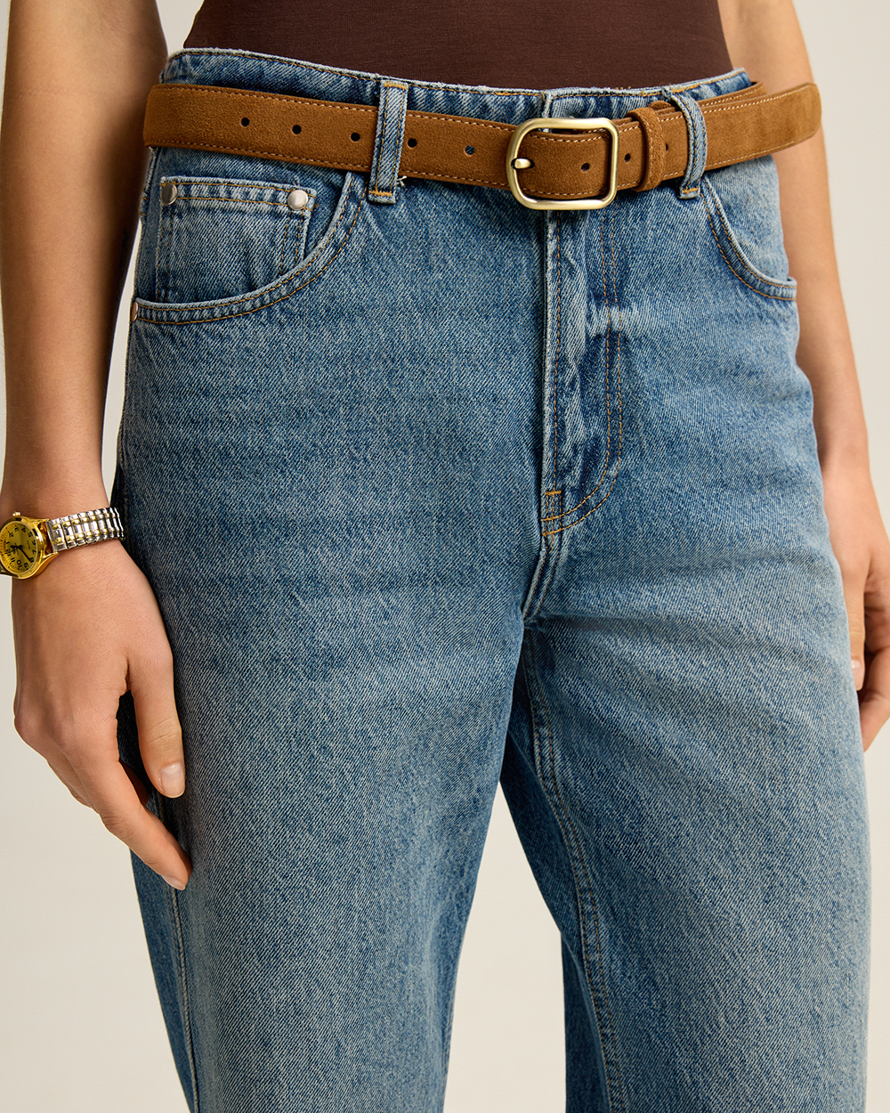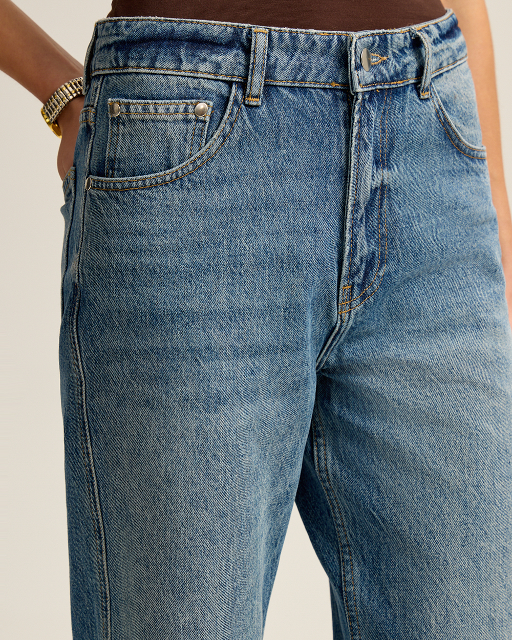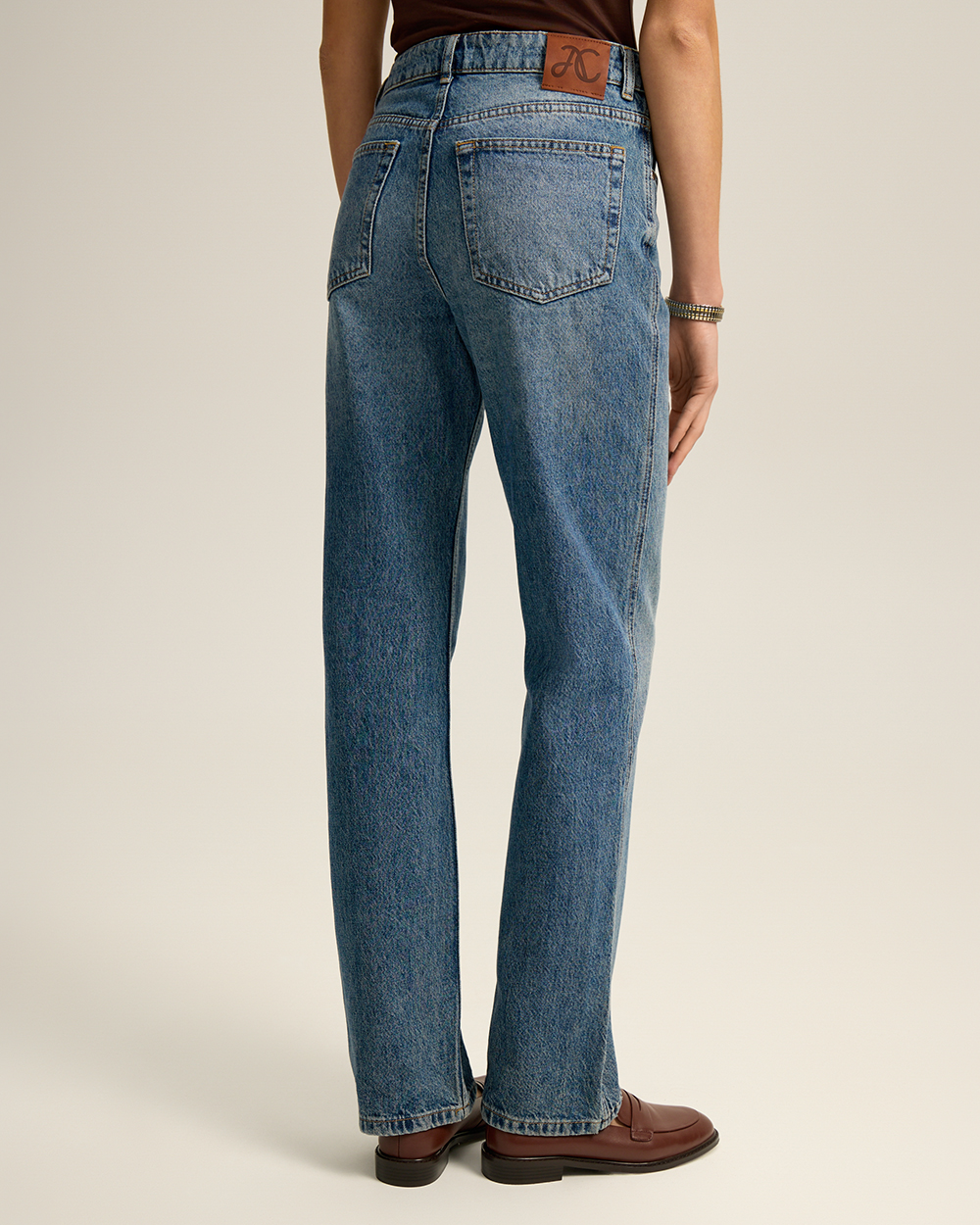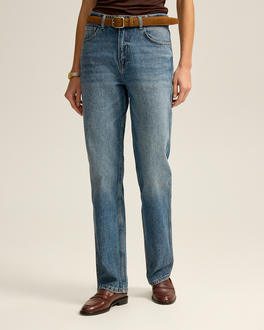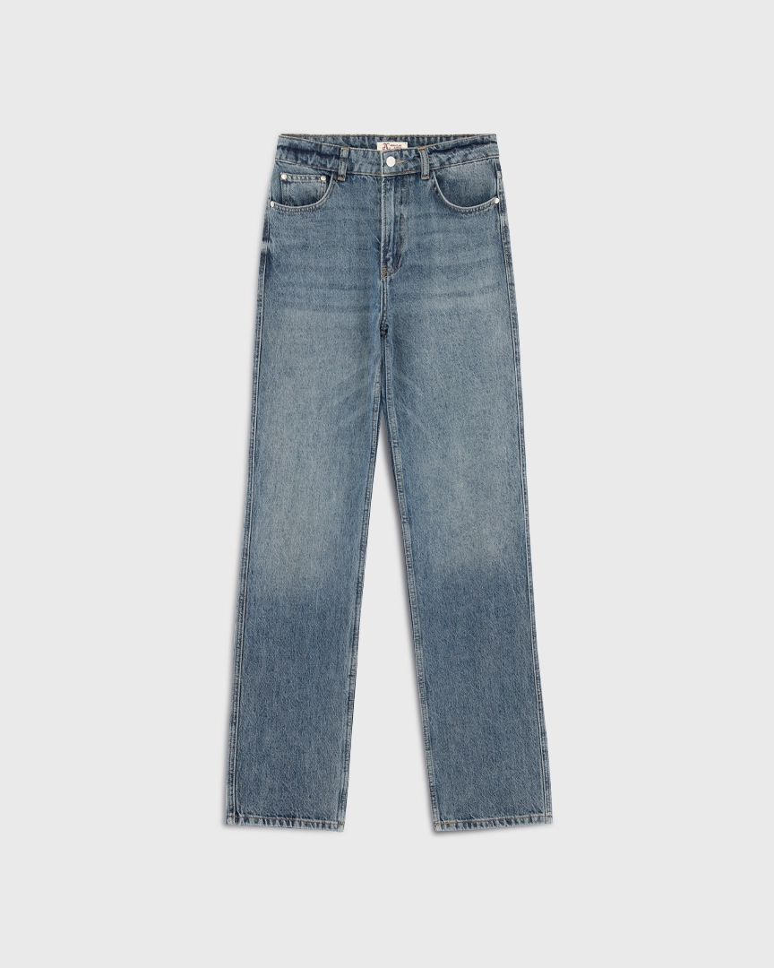 Джинсы прямого кроя классической посадки. Комфортный деним из 100% хлопка с легким эффектом потертостей. Округлые карманы спереди, карманы сзади.