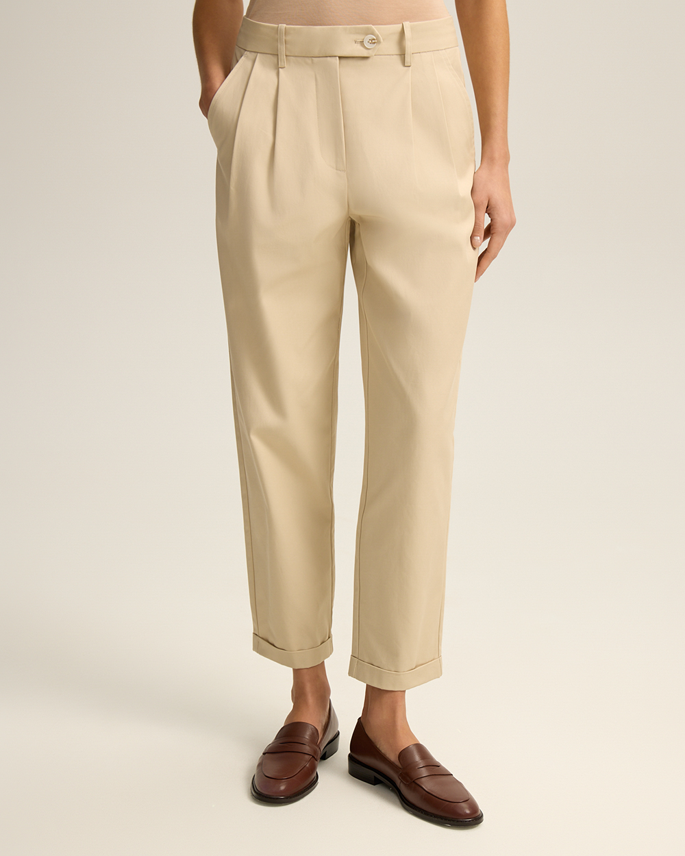 Чиносы из лёгкого гладкого хлопкового твила в светло-бежевом оттенке — универсальная база с характером. Зауженный крой с отворотами придаёт образу аккуратность и завершённость. Средняя посадка сочетает удобство и классическую элегантность.