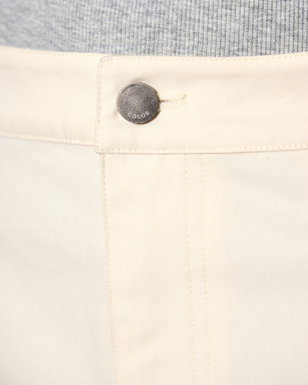 Светлые хлопковые брюки с отворотами — комфортная база с акцентом на форму. Объёмный крой с заужением к низу создает актуальный овальный силуэт, а плотный хлопок держит форму и добавляет структуру.