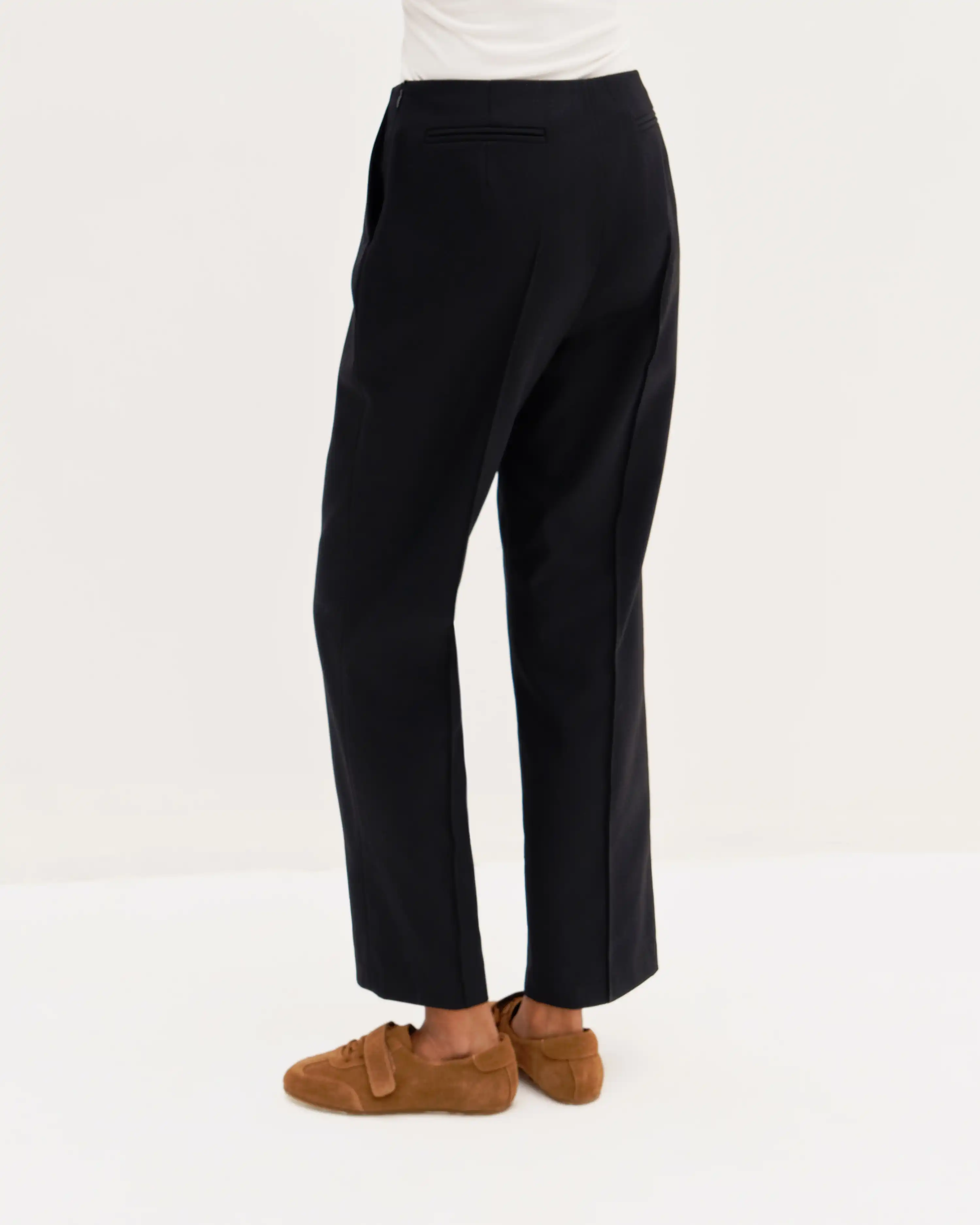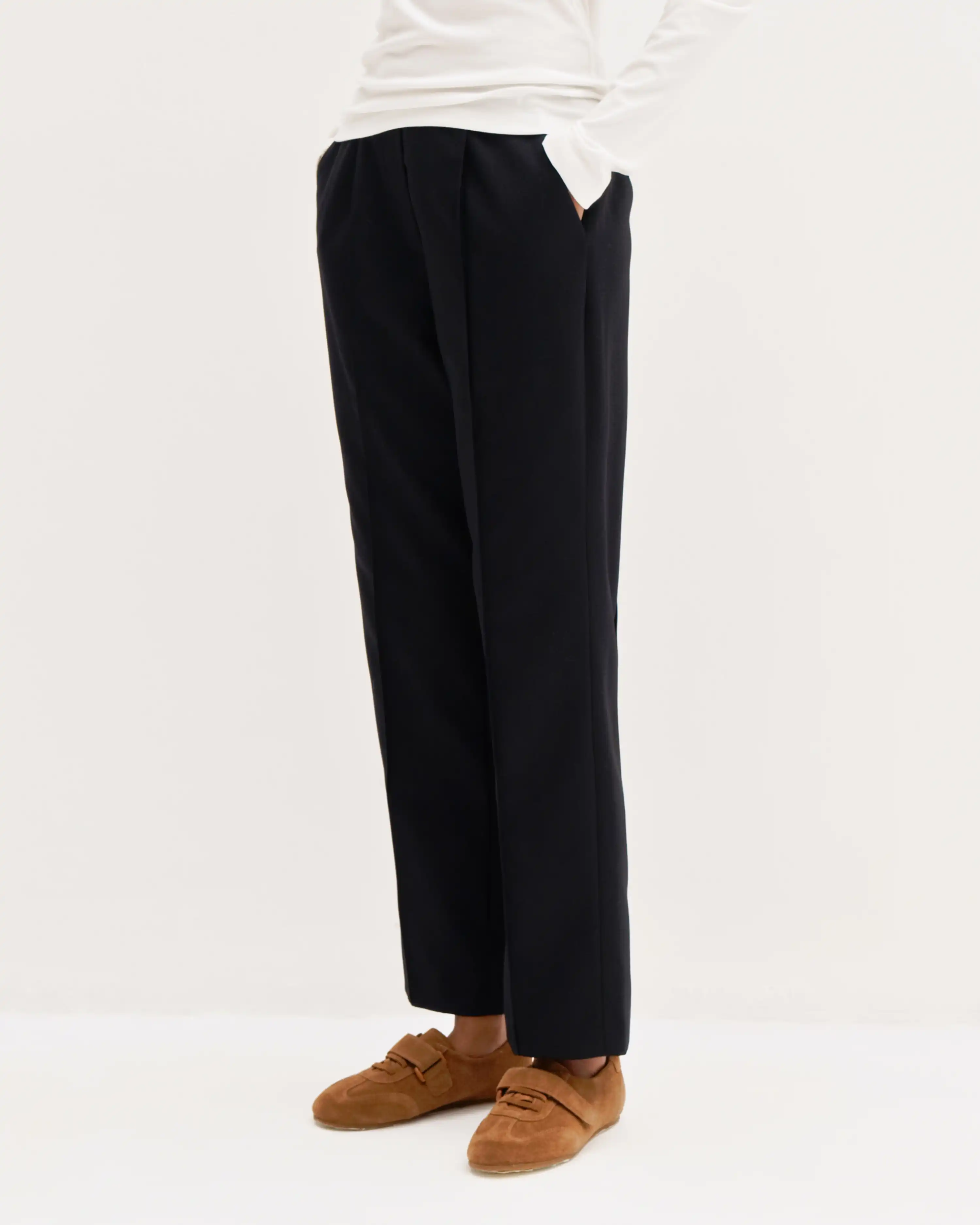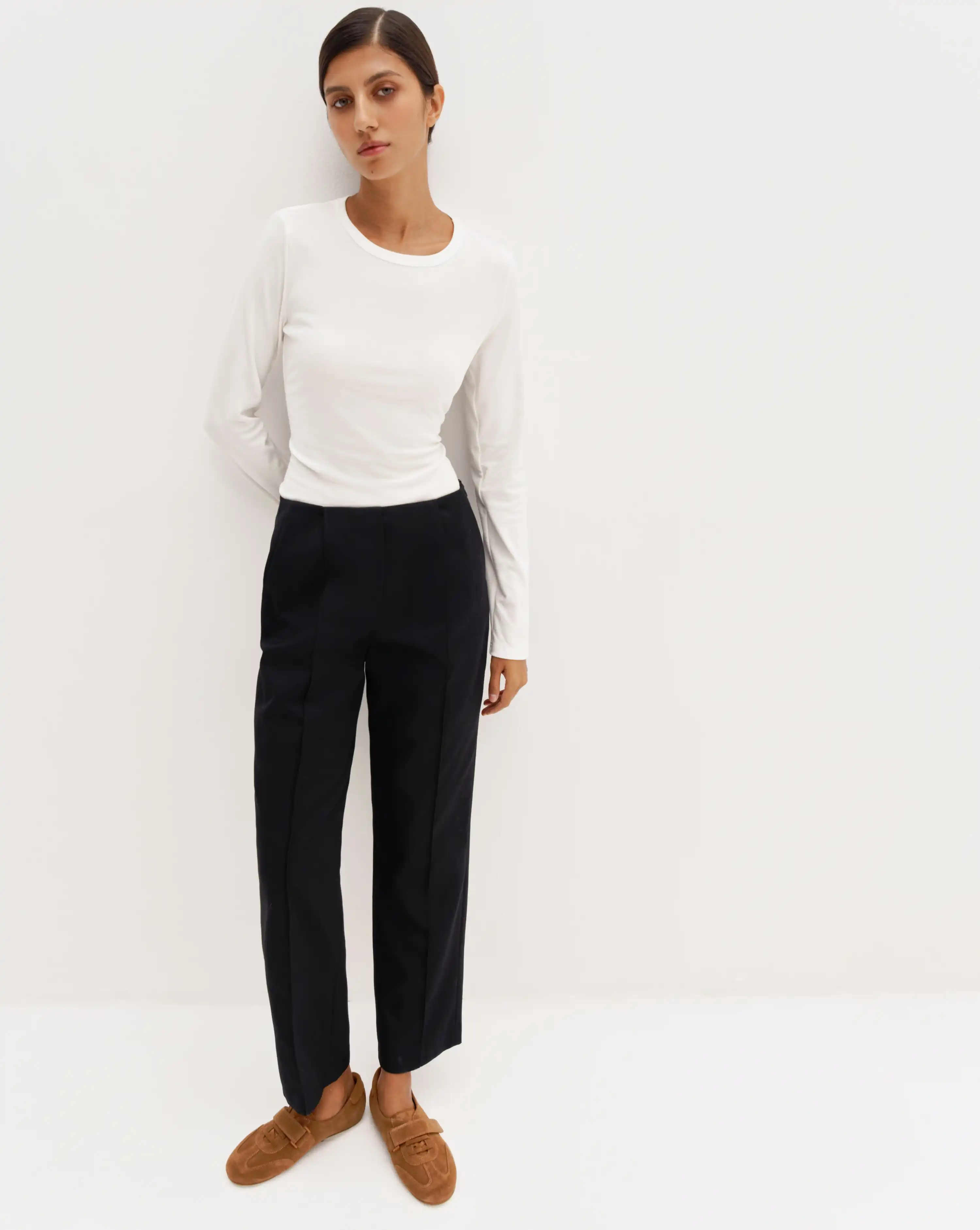 Комфортная базовая модель брюк в классическом стиле. Благодаря простроченным стрелкам спереди и сзади брюки будут в любой момент готовы к выходу и помогут привнести четкость и элегантность даже в расслабленные образы. Актуальный силуэт получится со свободными рубашками навыпуск, объемными свитерами и оверсайз жакетами.