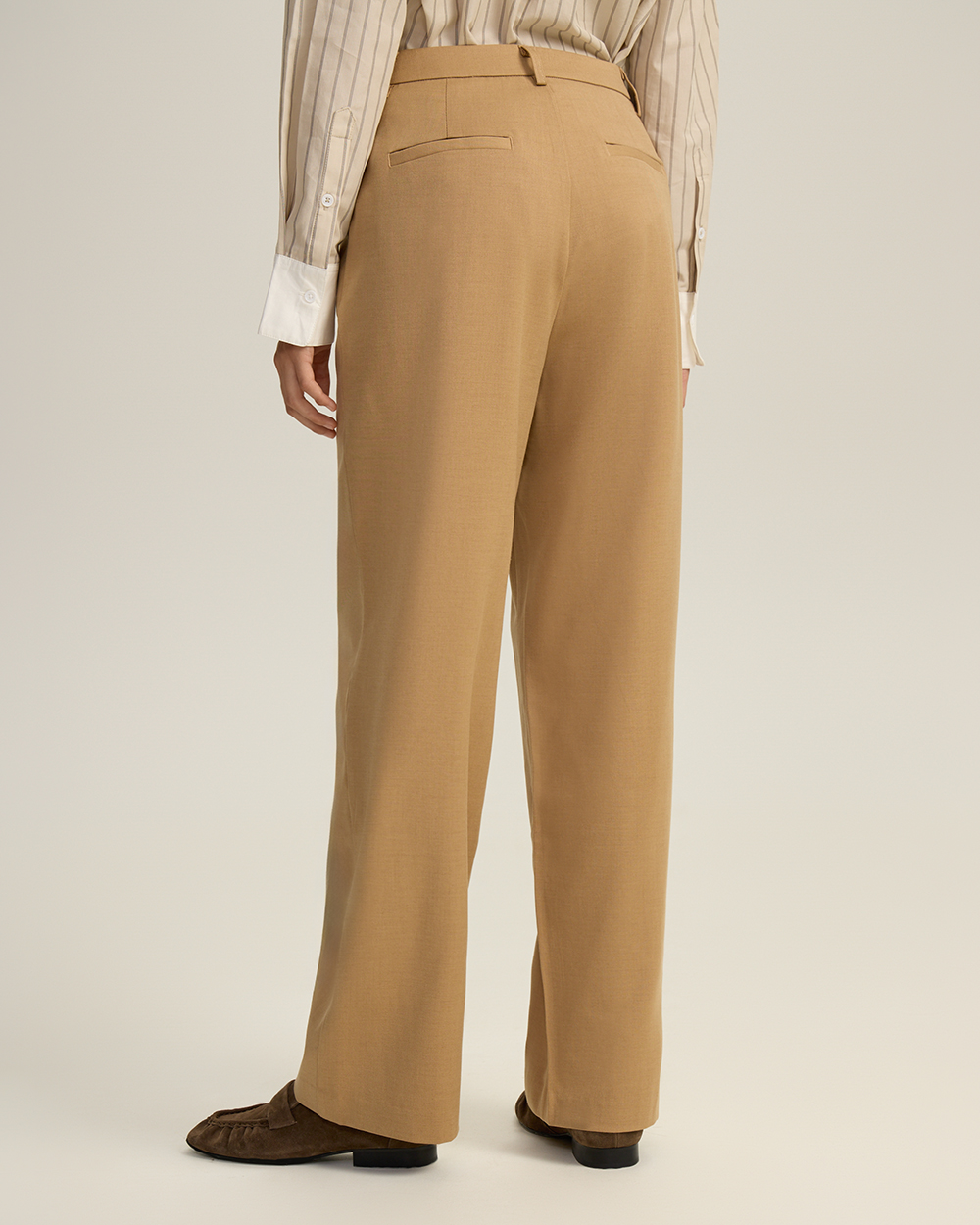 Прямые брюки средней посадки, с карманами спереди. Отстрочки спереди. Комфортный материал с районом и шерстью.