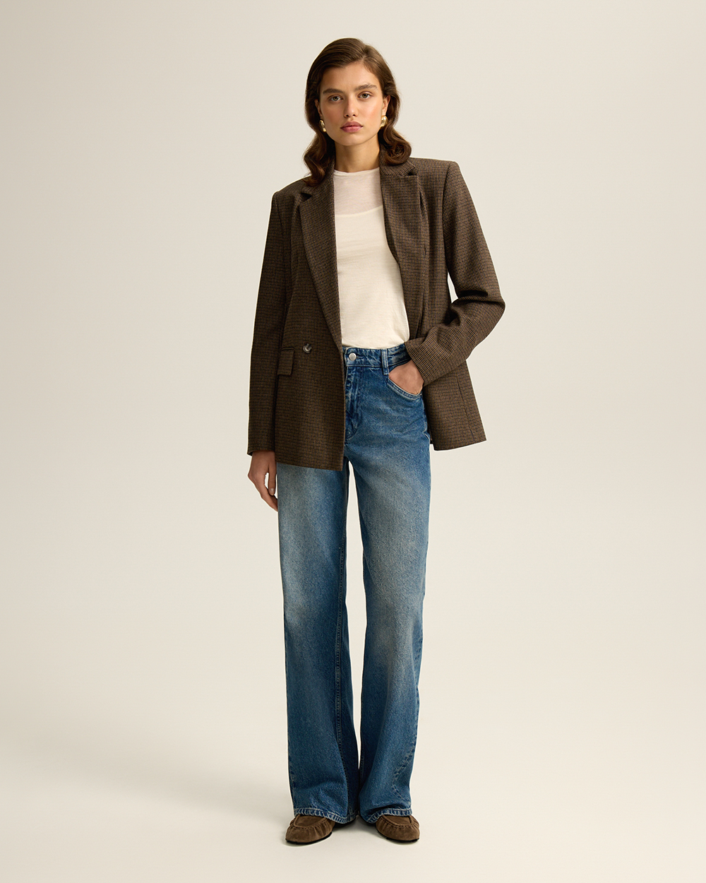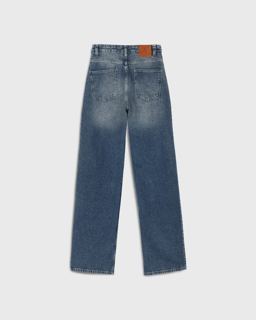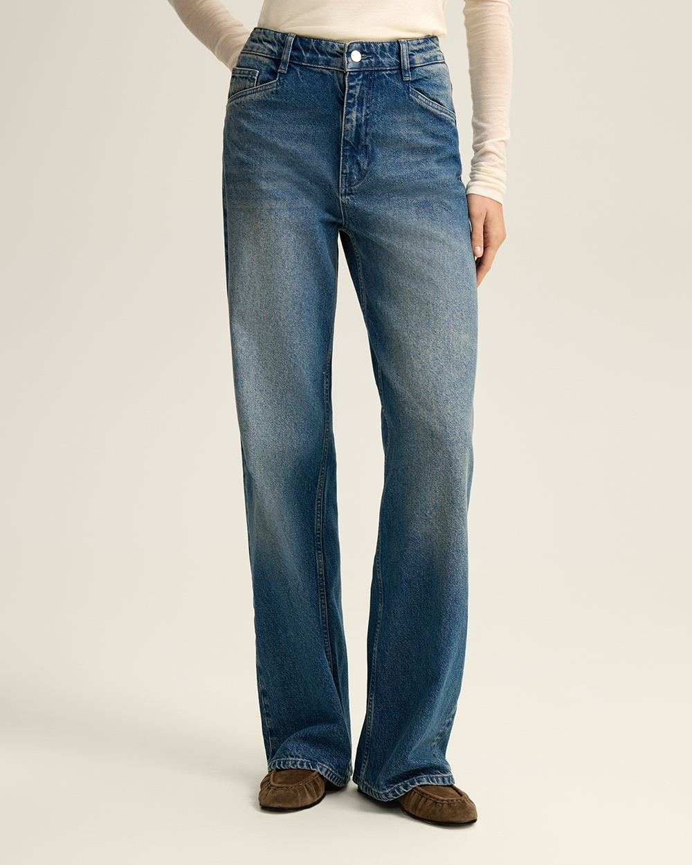 Джинсы прямого кроя с высокой посадкой. Комфортный деним из 100% хлопка с легким эффектом потертостей. “Скошенные” карманы спереди, карманы сзади.