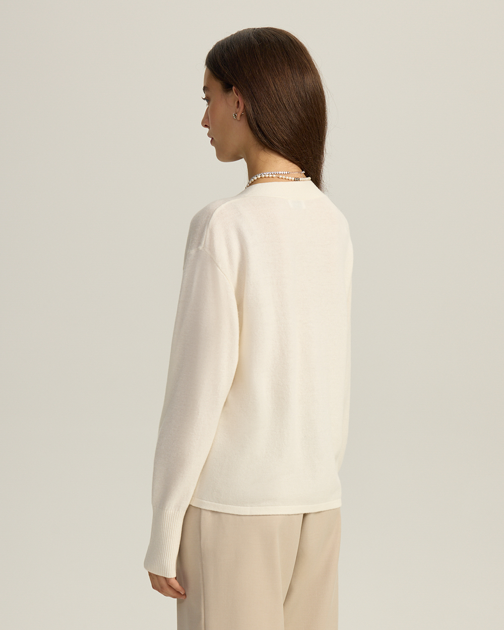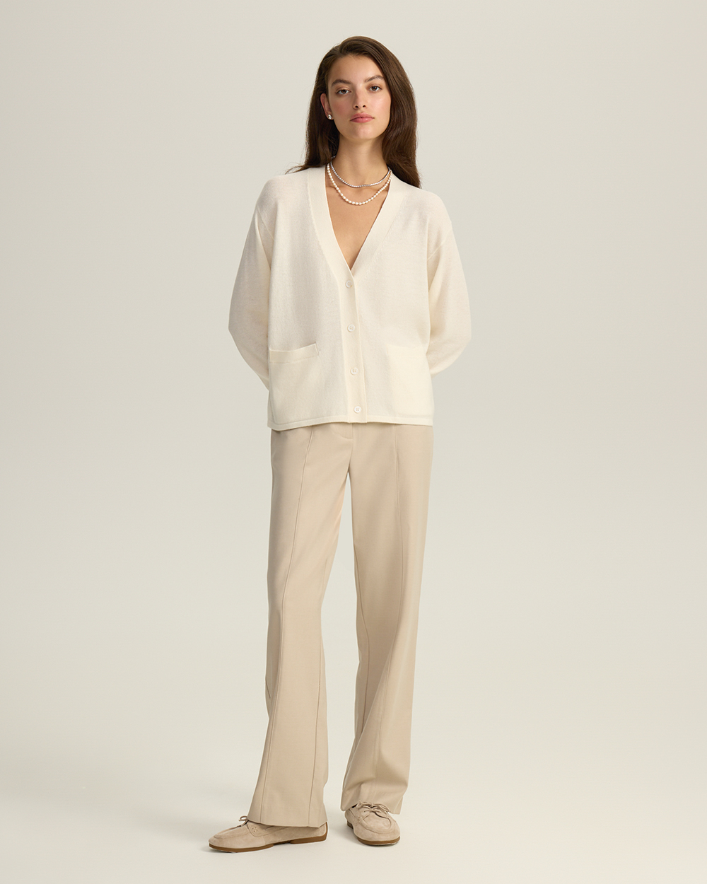 Кардиган на пуговицах с V-вырезом — идеальное решение для многослойных образов. При этом глубина выреза и комфортная пряжа позволяют носить его и на голое тело как самодостаточный верх.
