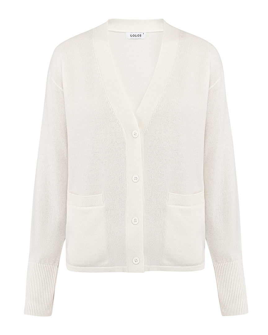 Прямой кардиган из 100% шерсти. Широкие манжеты, два передних кармана, пуговицы в тон, V-вырез.