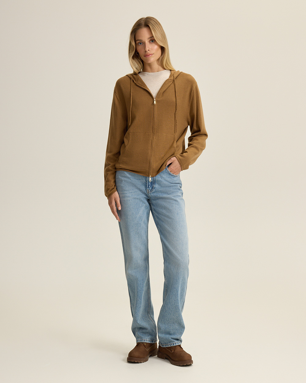 Шерстяной кардиган на молнии с капюшоном, карамельный