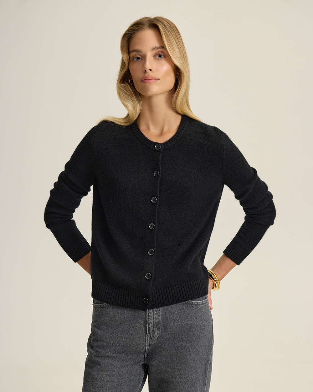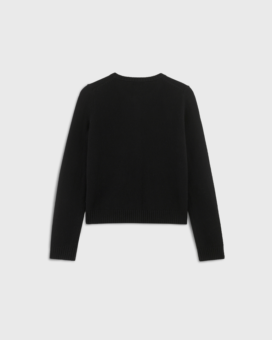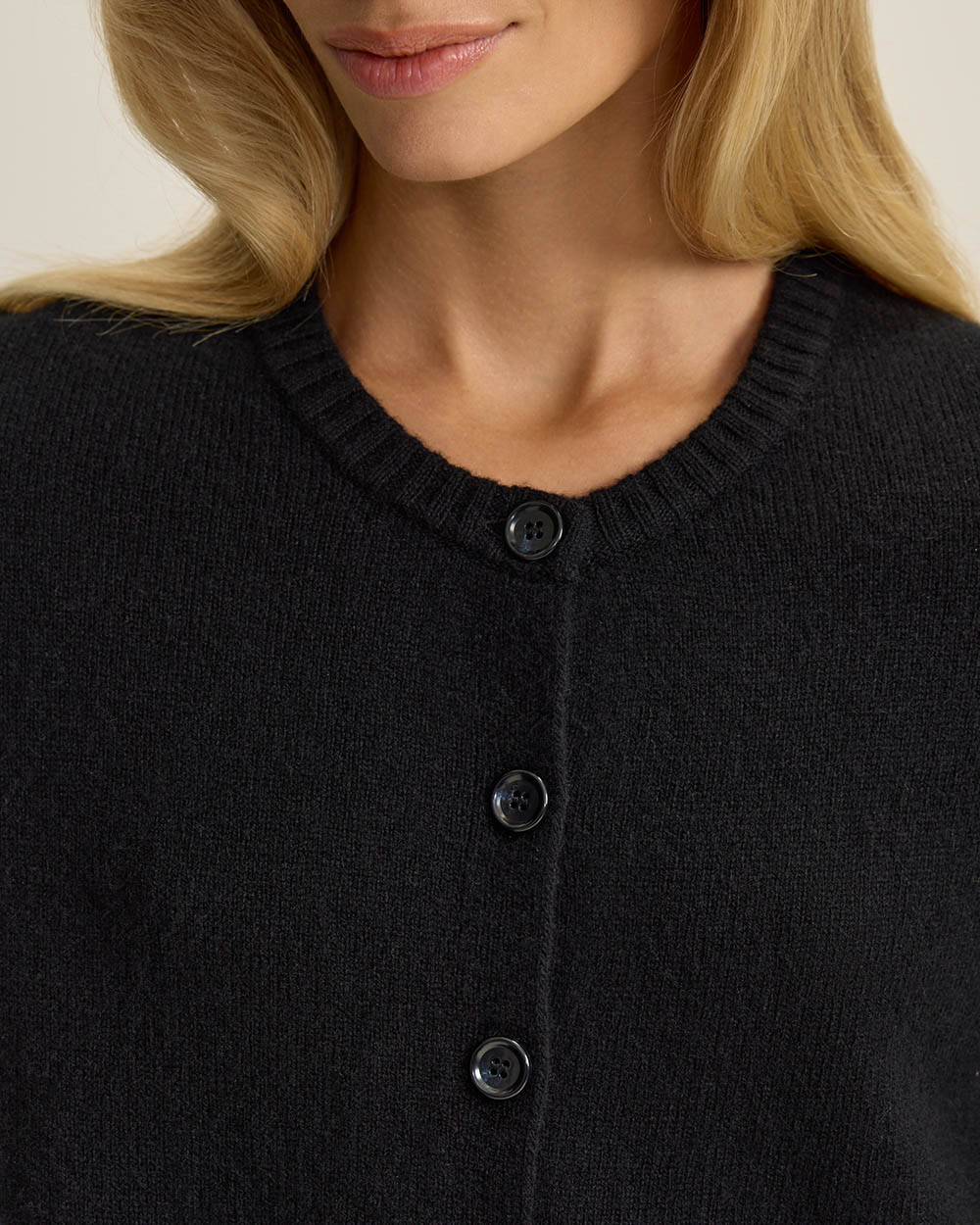 Кардиган из 100% шерсти плотной вязки с круглым вырезом и застёжкой на пуговицы. Тёплый, мягкий и универсальный — можно носить застегнутым как джемпер или как кардиган поверх лаконичных топов.