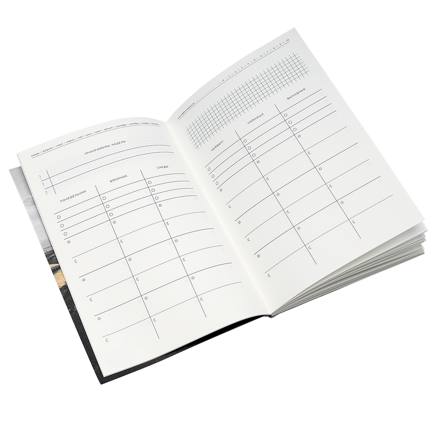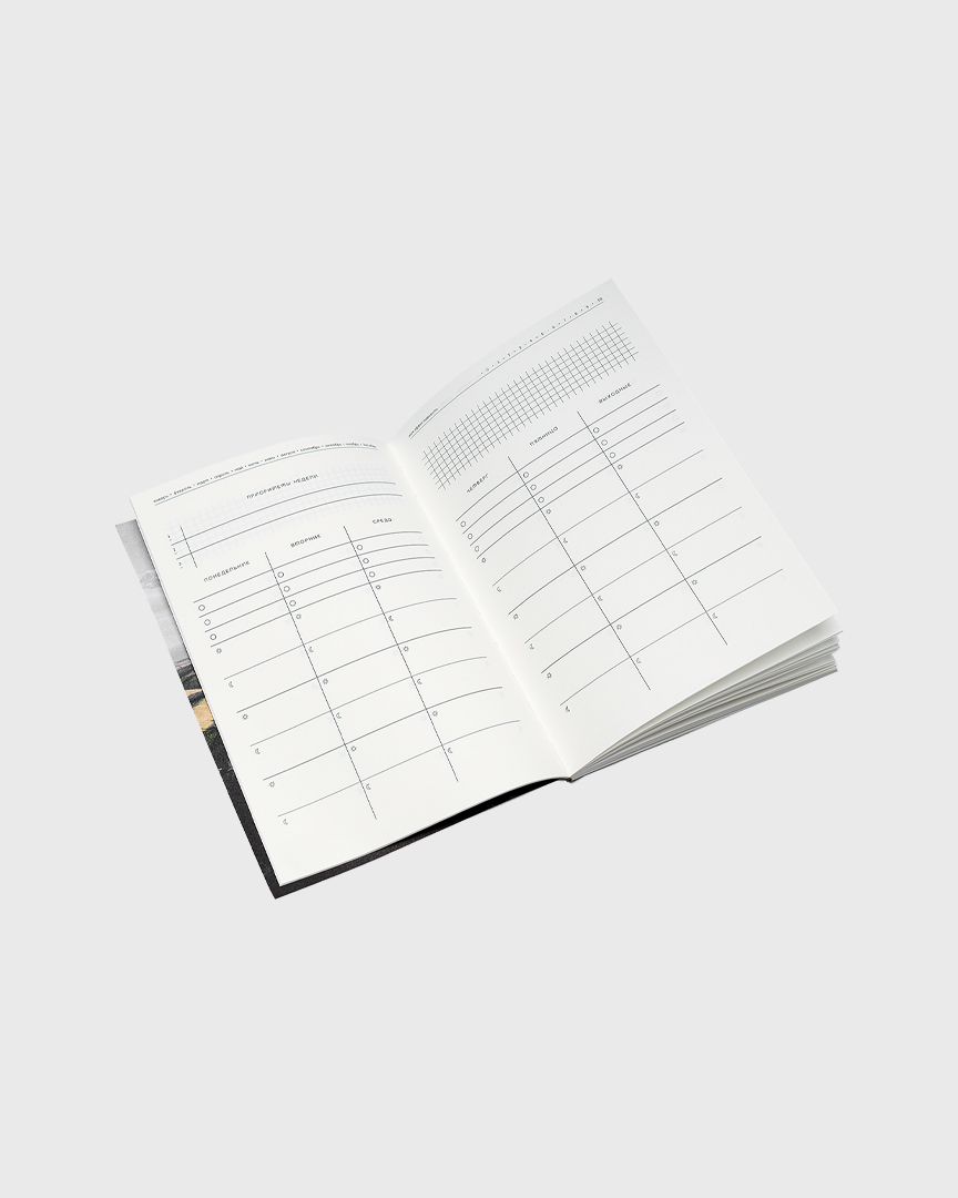Блокнот формата А5, 58 страниц, недатированный еженедельник, с обложкой из дизайнерского картона. Каждый разворот — ваш наглядный план на неделю.