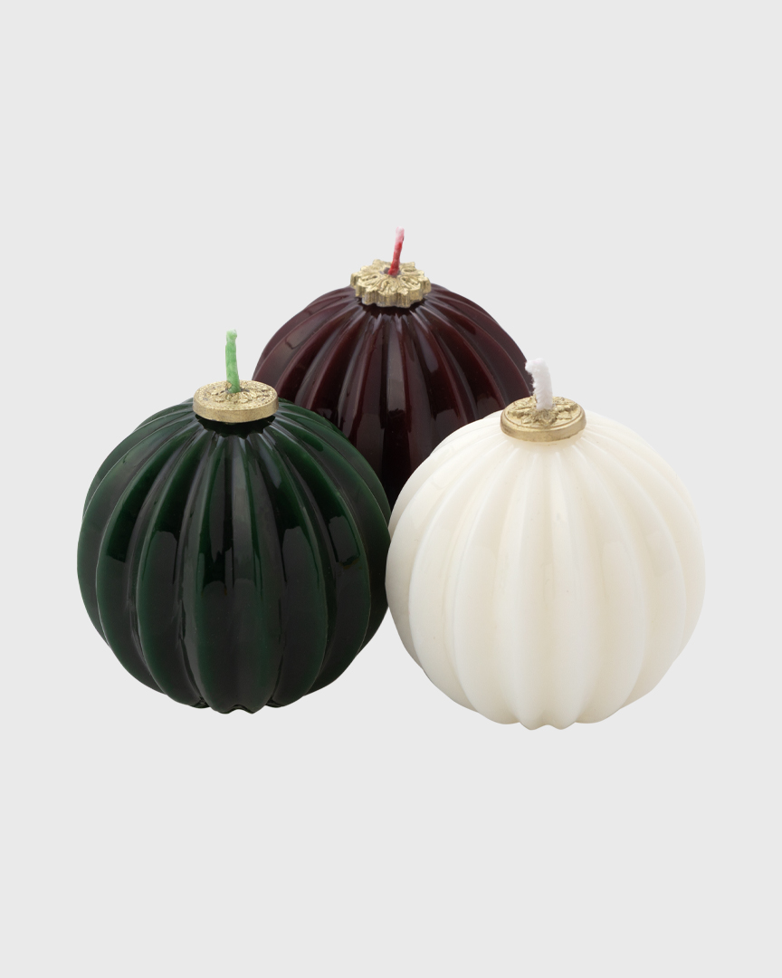 Набор свечей с праздничным настроением, в фирменной коробке Abrau Club, с тишью, перевязанной лентой с золотым кантом. Стильные лаконичные свечи из пчелиного воска в виде елочных игрушек-шаров разного цвета.