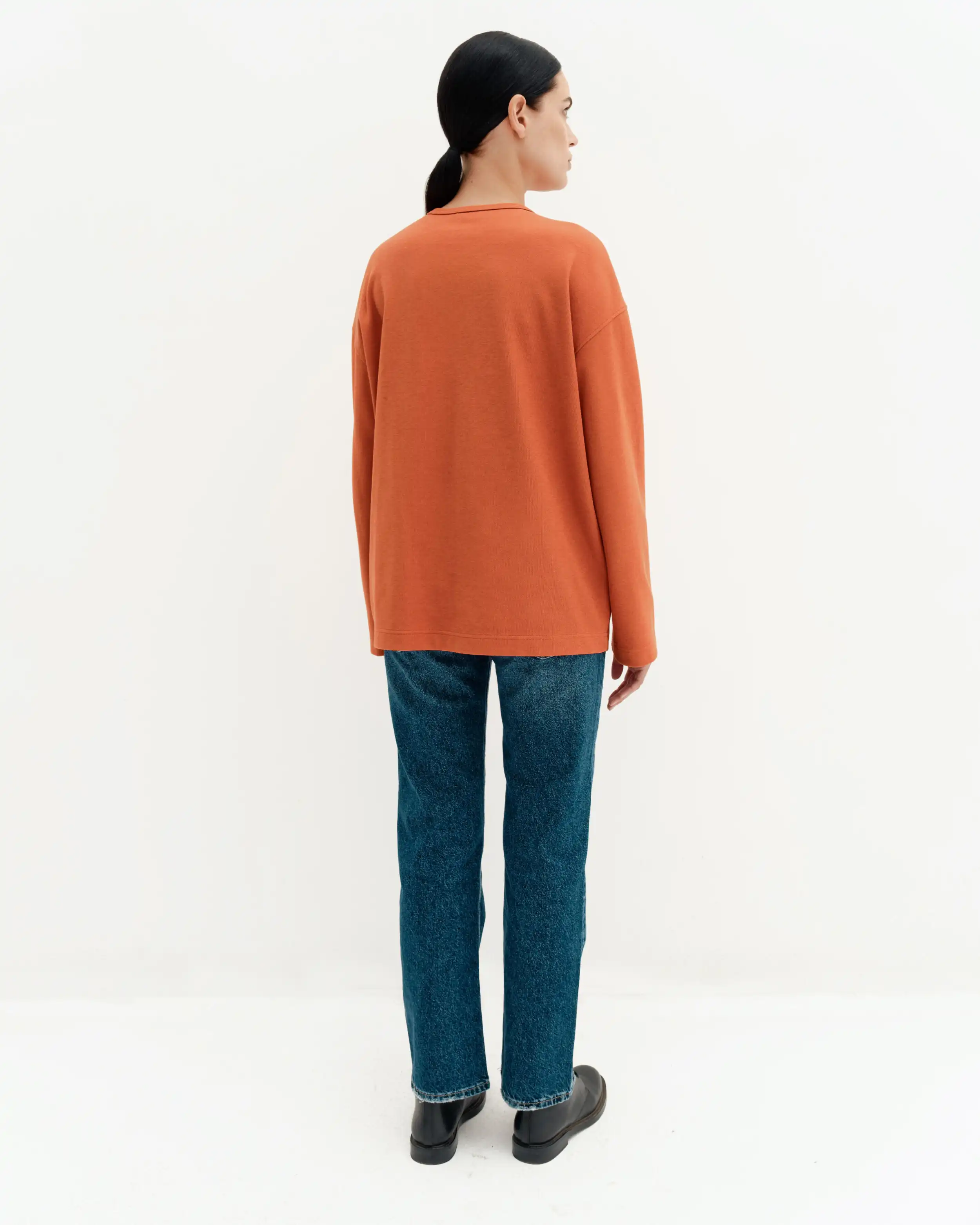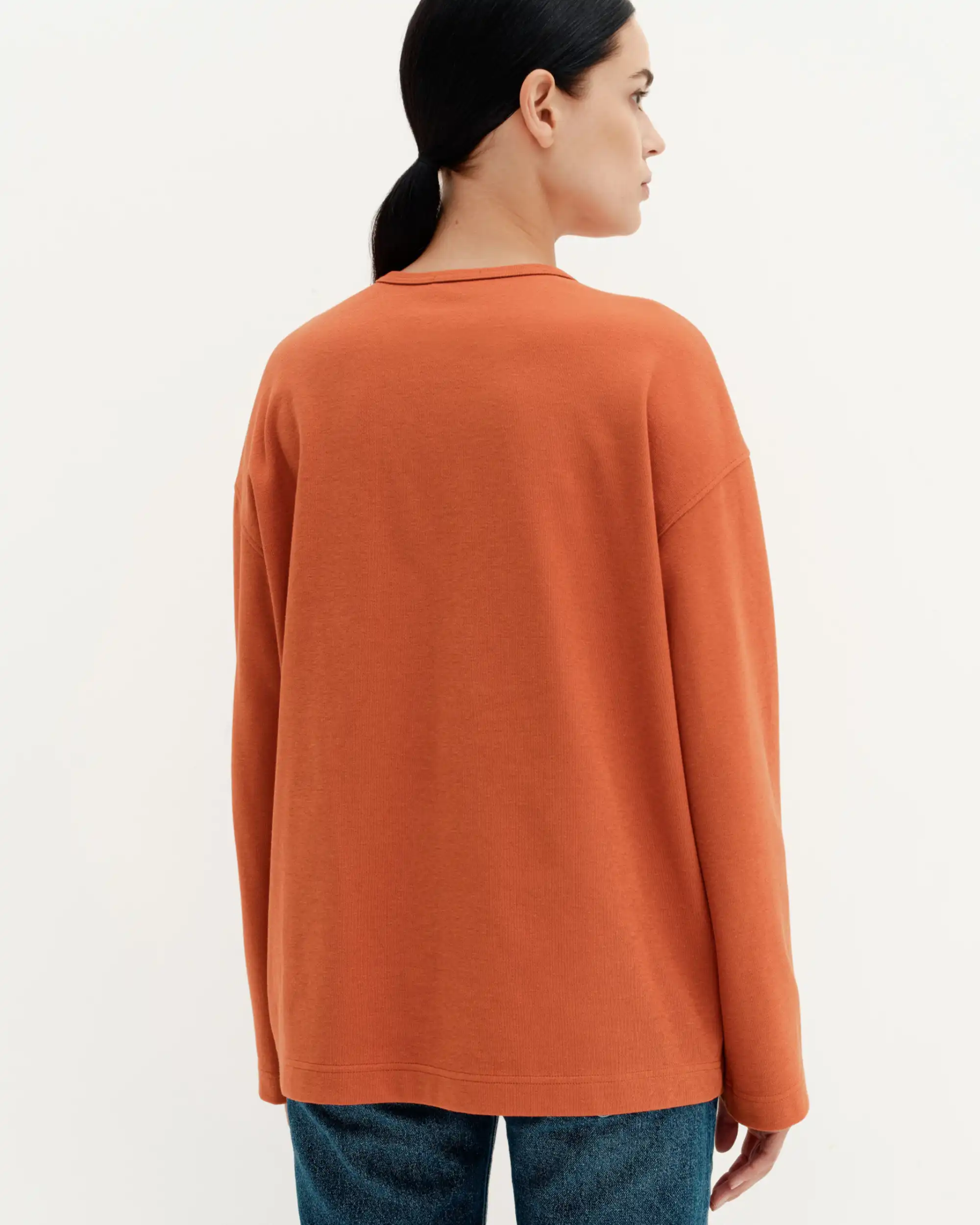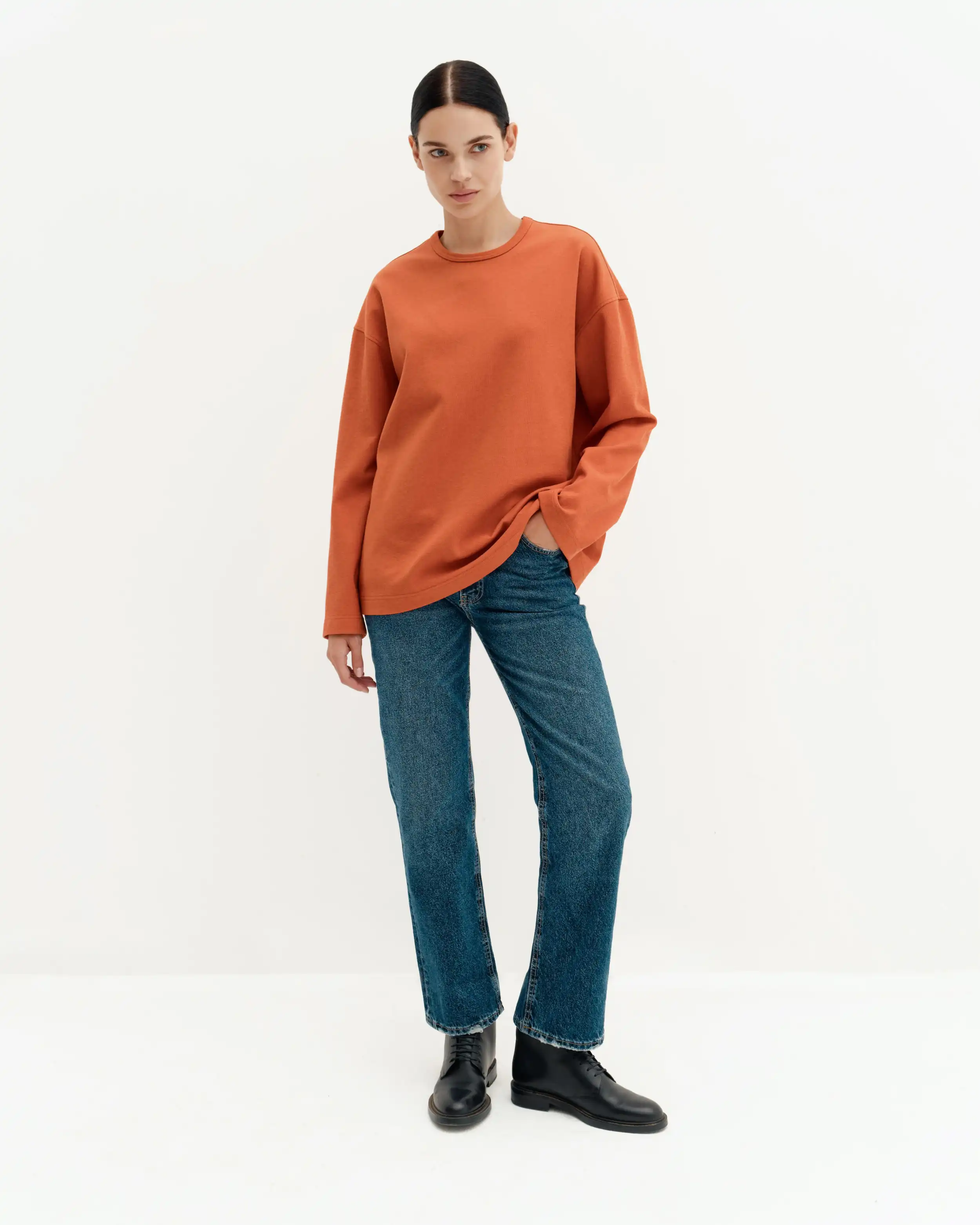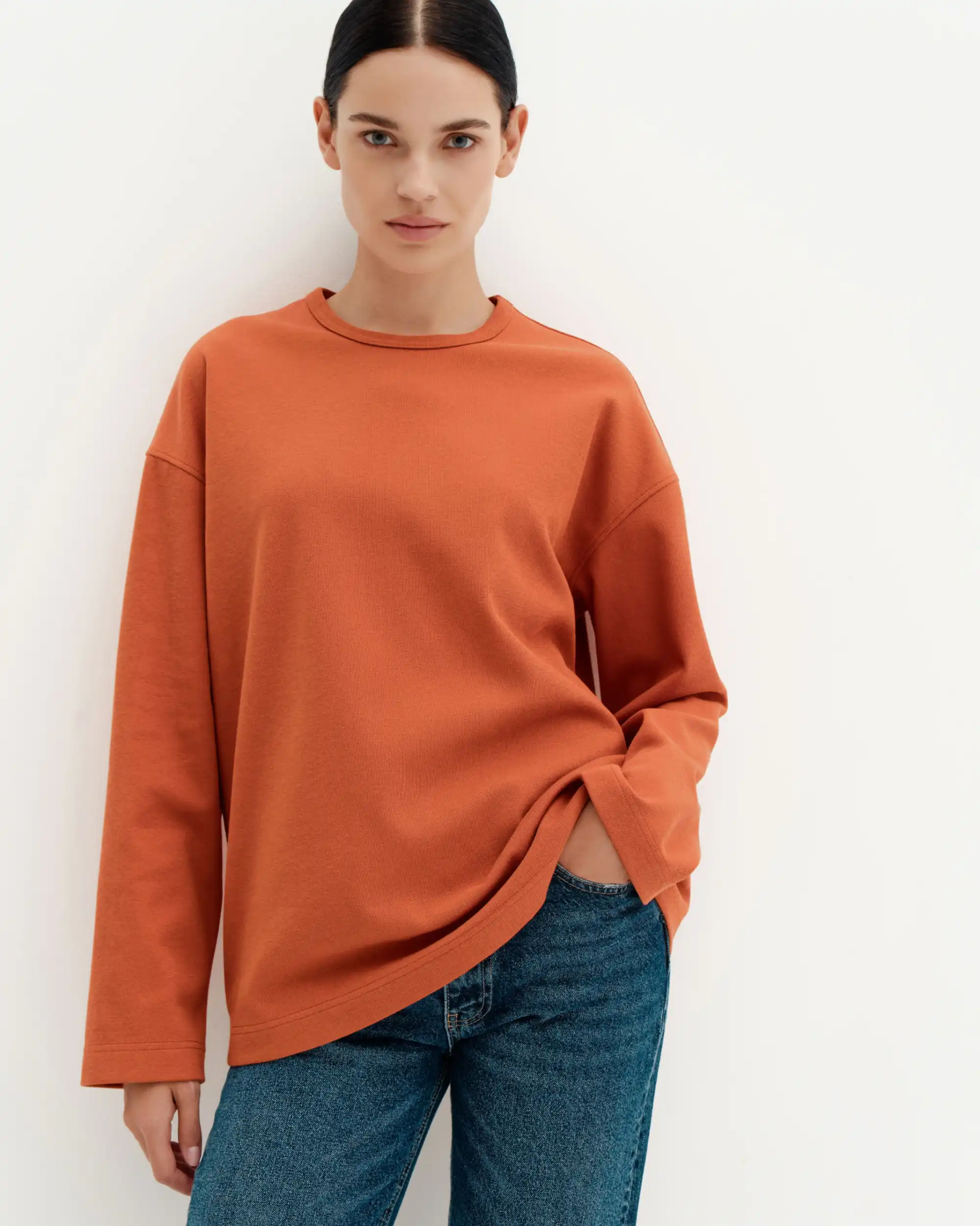 Лонгслив свободного прямого кроя. Спущенная линия плеча. Красивый акцентный оттенок.