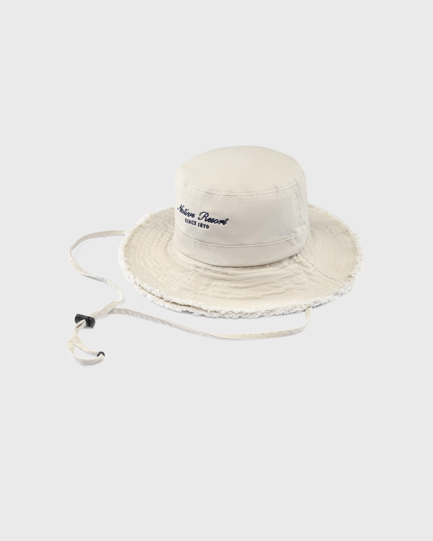 Панама женская из вареного бежевого хлопка с вышивкой Native Resort темно-синего цвета и бахромой по краям полей. Материал с полотняным переплетением и эффектом помятости, не требует глажения и придает изделию удобную посадку и актуальный образ