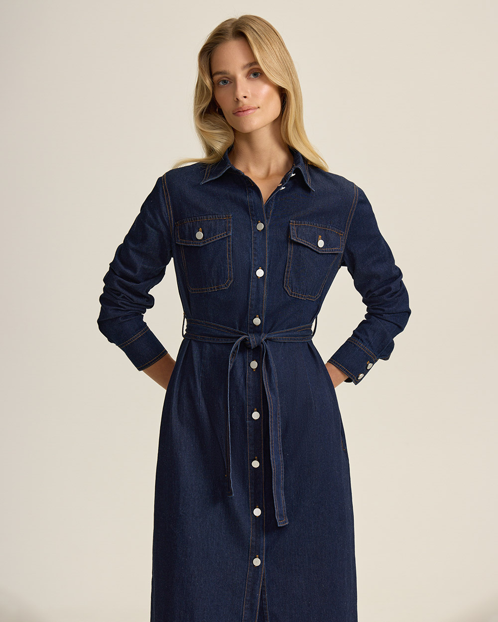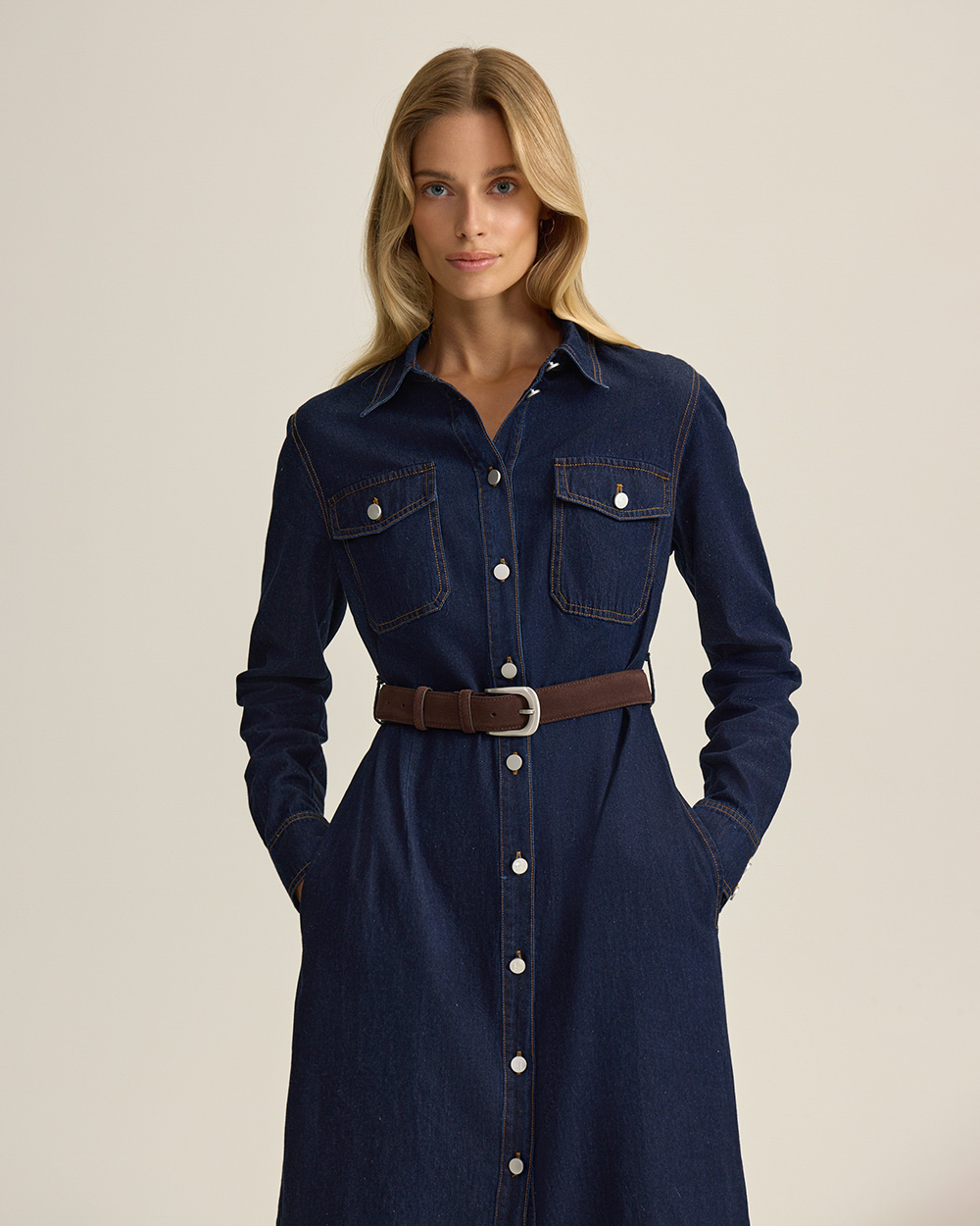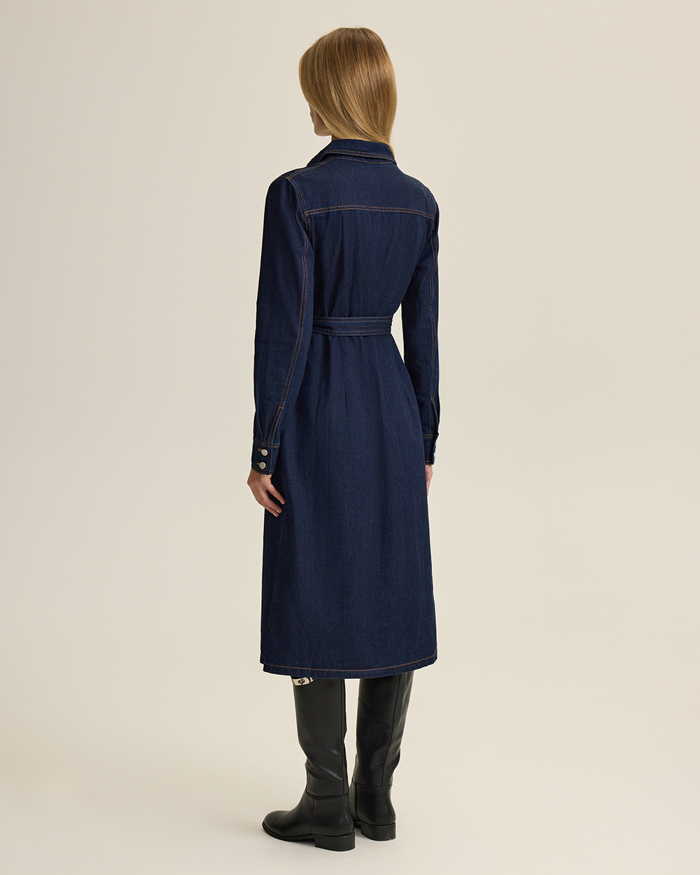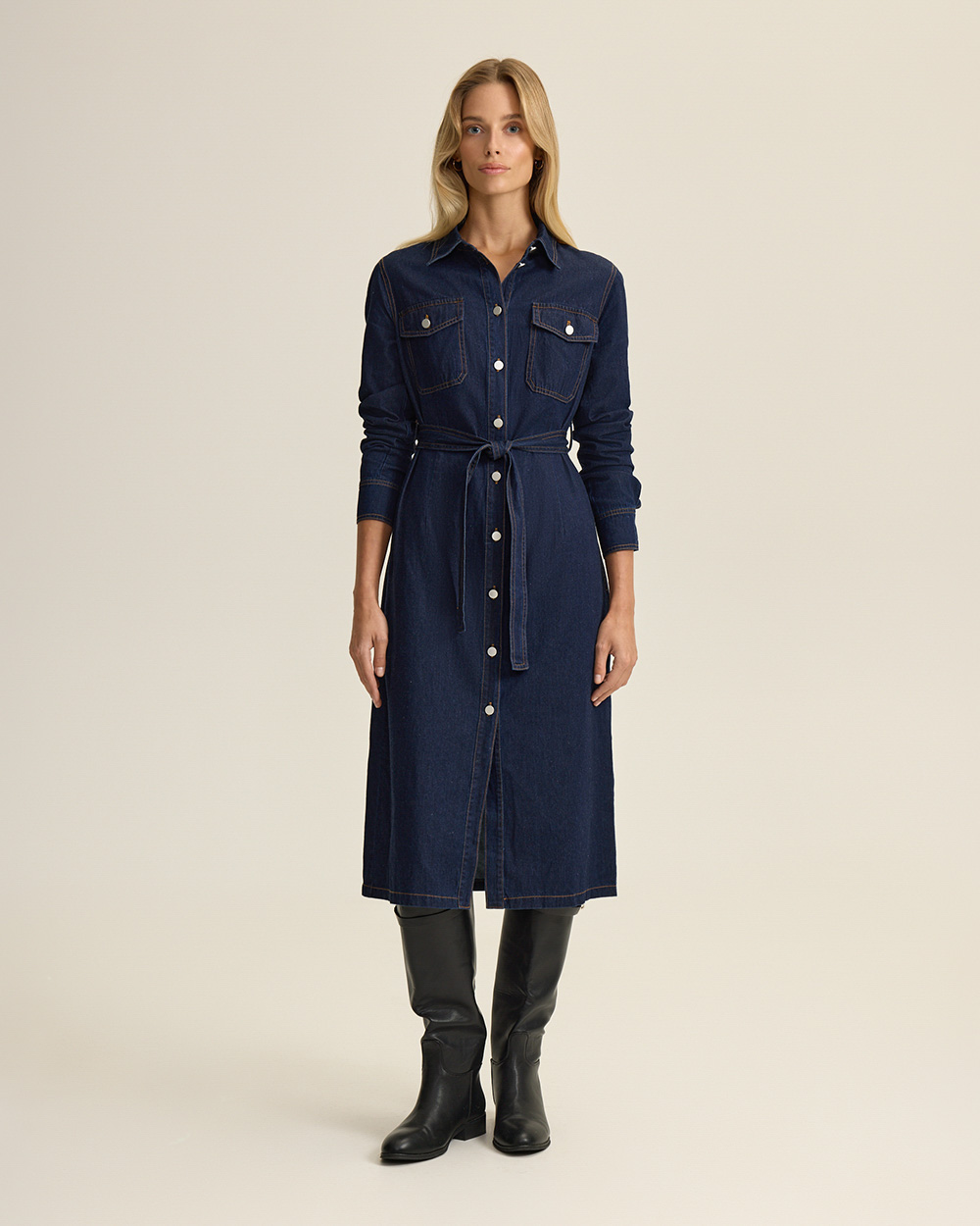 Платье из мягкого хлопкового денима — современная интерпретация классического женственного кроя, без лишней строгости. Приталенный силуэт, длинные рукава, застежка на пуговицы по всей длине.