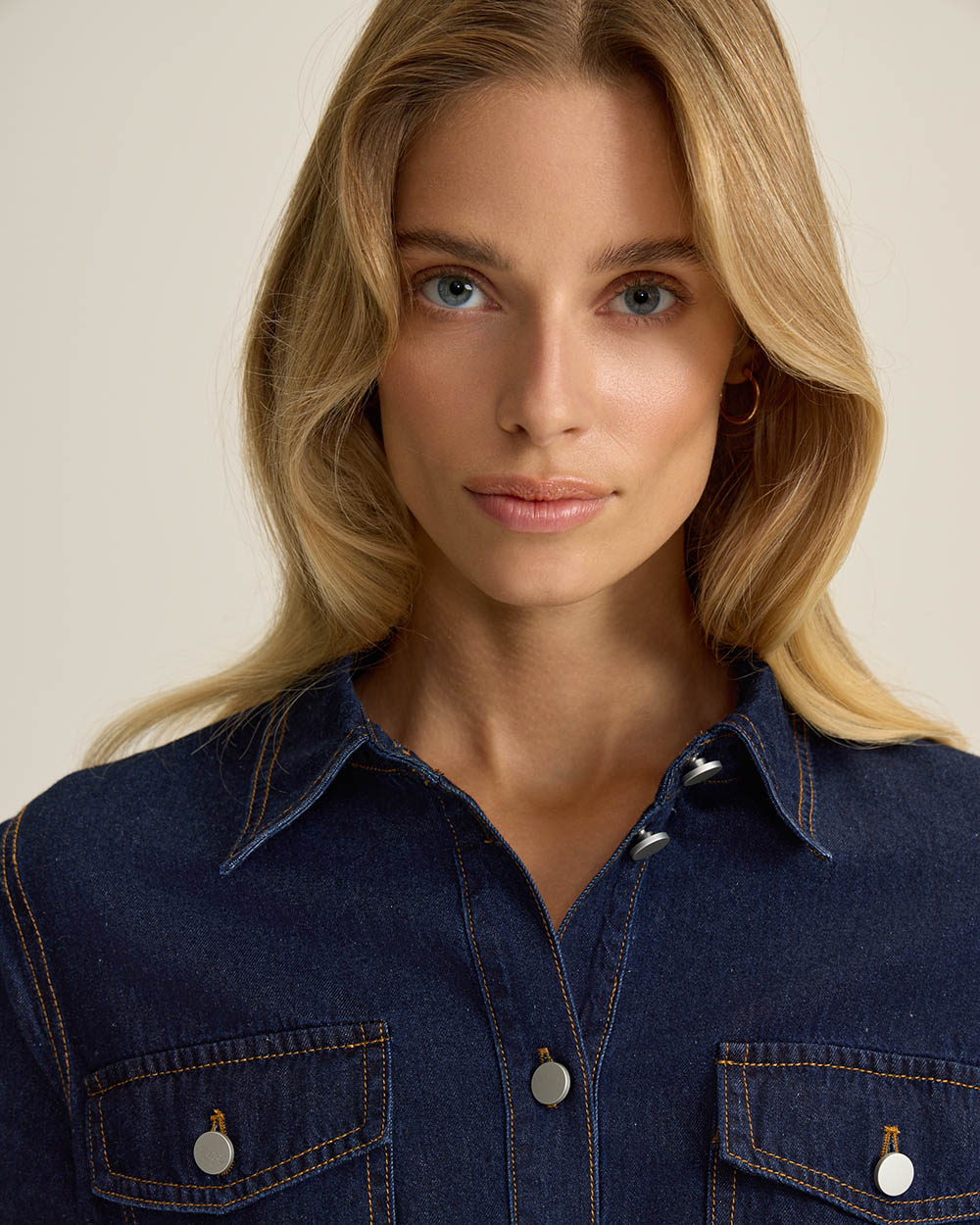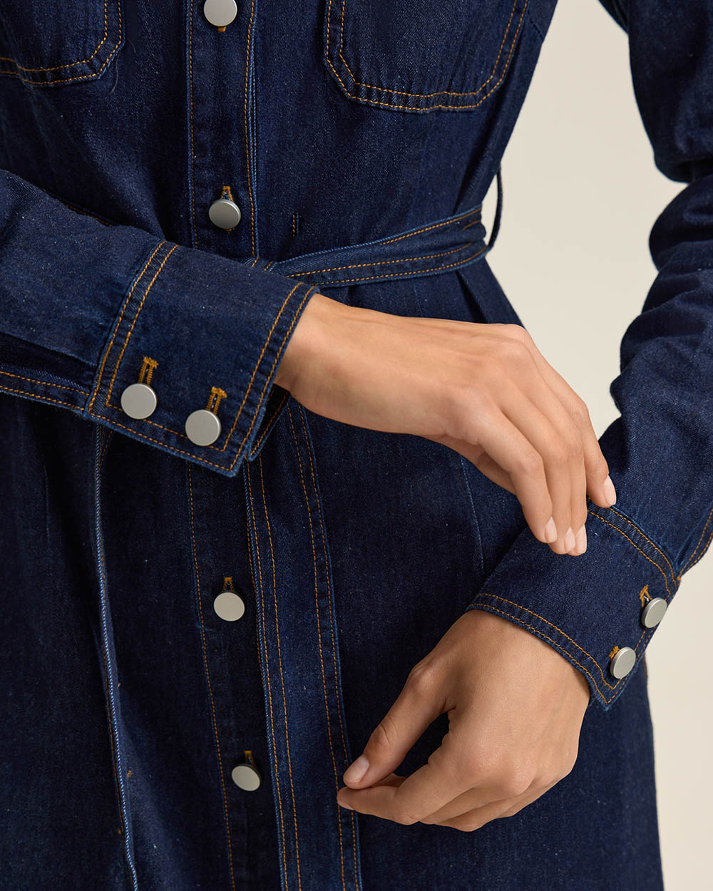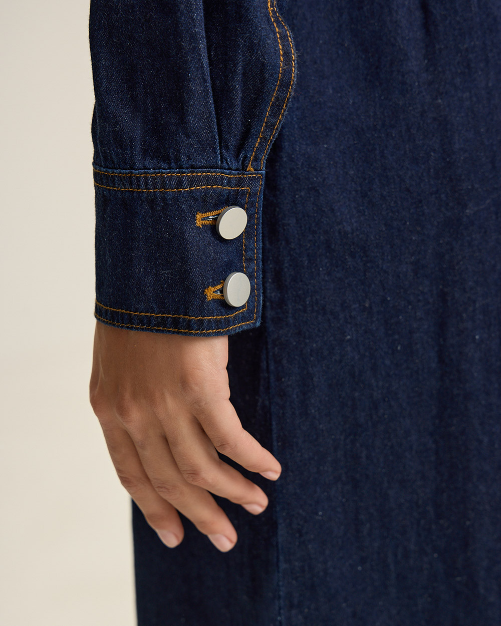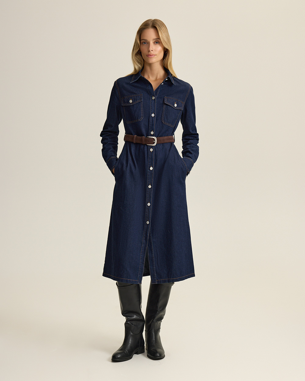 Платье из мягкого хлопкового денима — современная интерпретация классического женственного кроя, без лишней строгости. Приталенный силуэт, длинные рукава, застежка на пуговицы по всей длине.