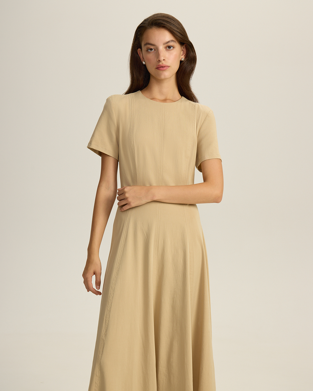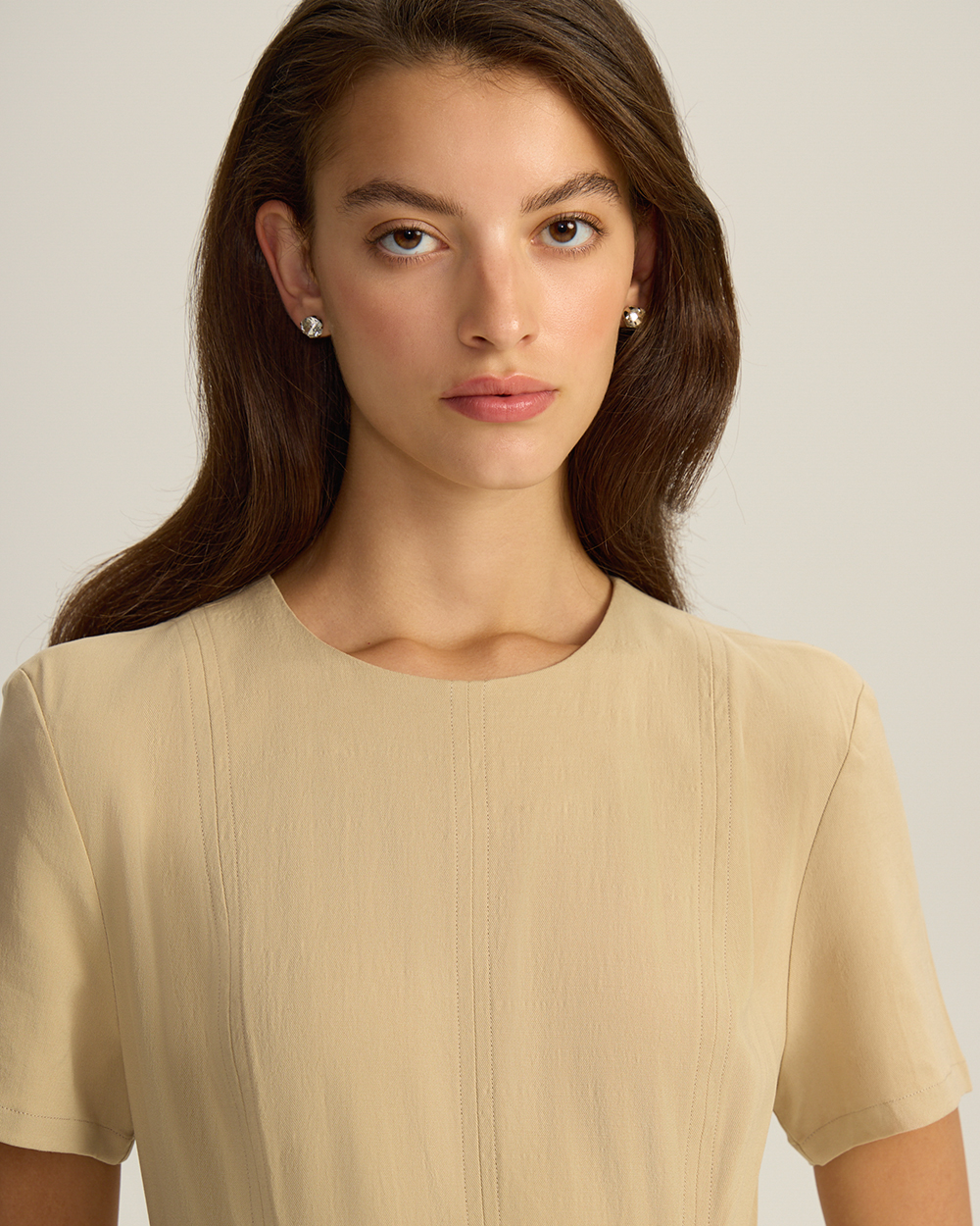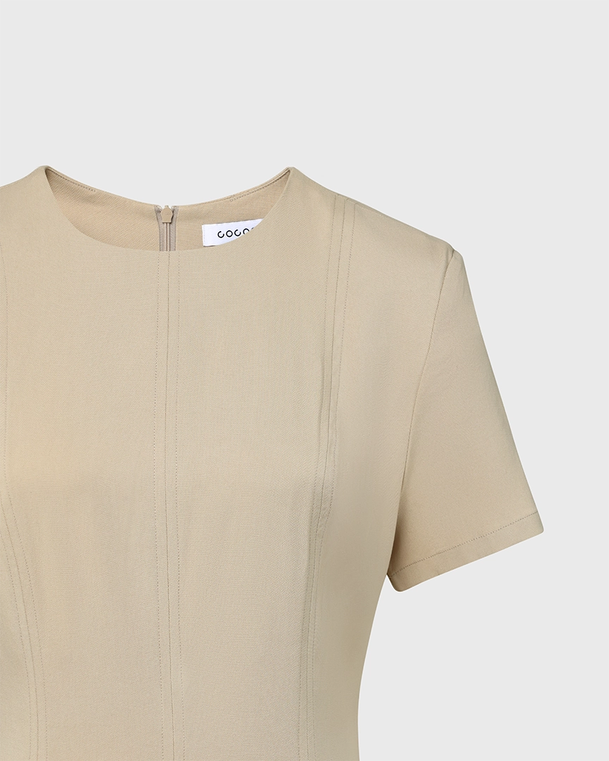 Платье приталенного кроя из лиоцелла и района. Круглый вырез. Короткие рукава. Застежка на молнию.