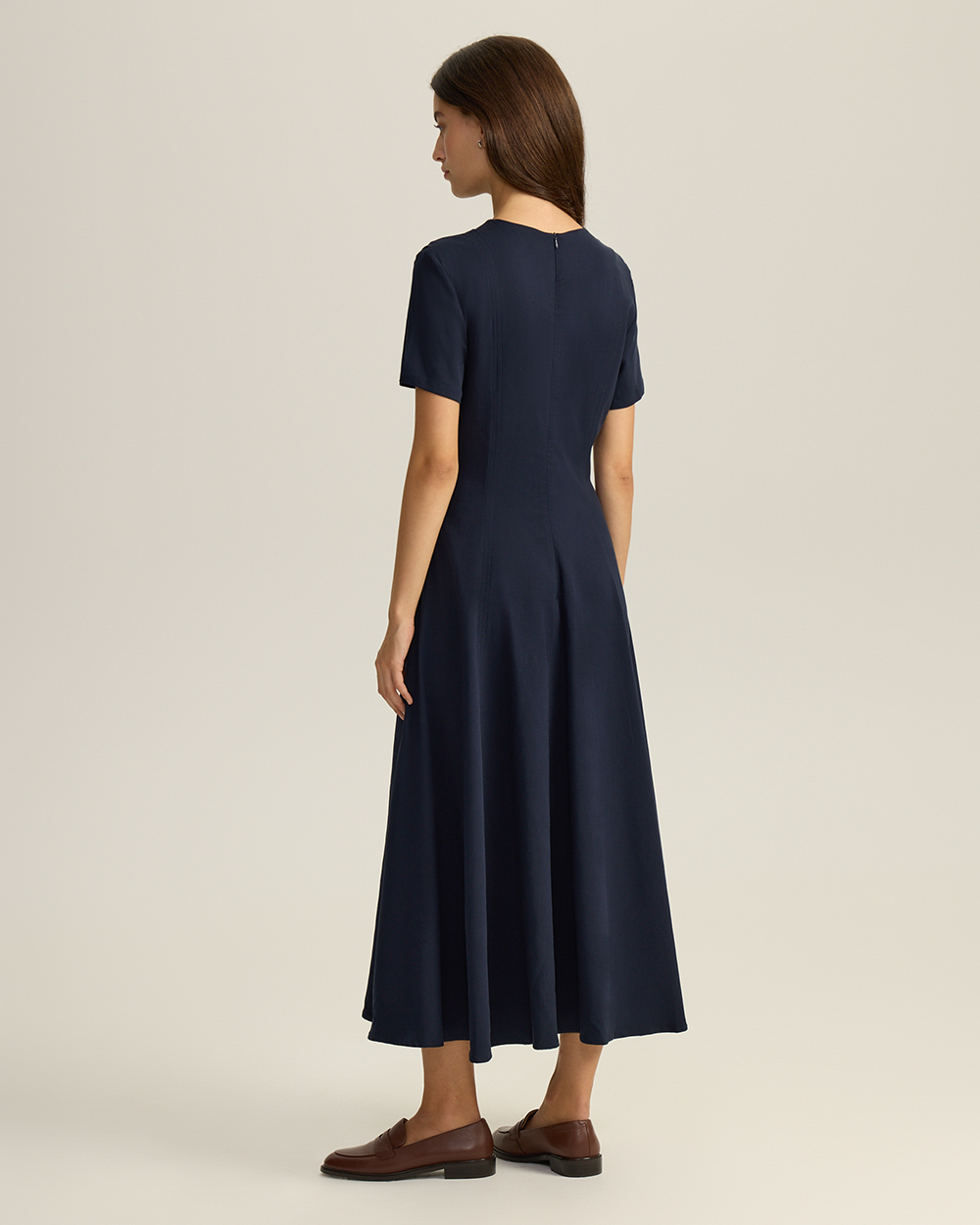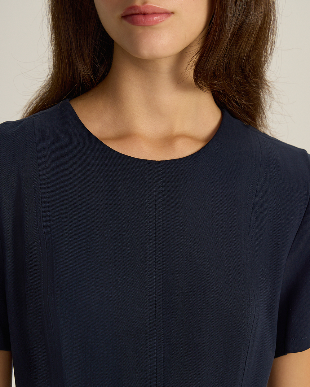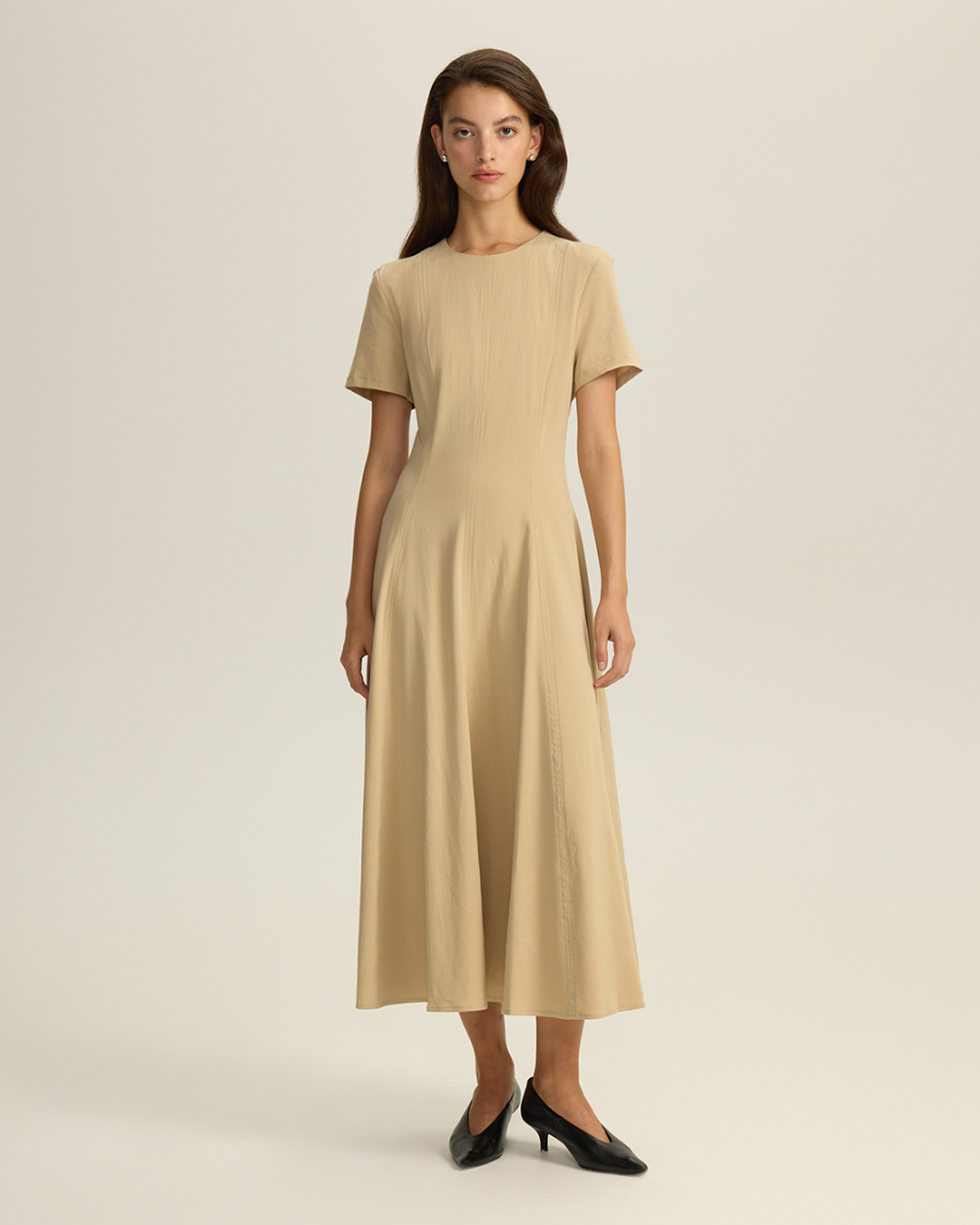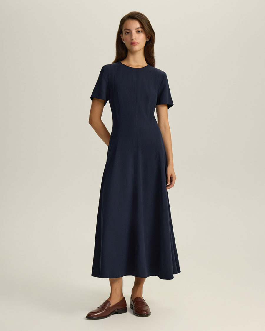 Платье приталенного кроя из лиоцелла и района. Круглый вырез. Короткие рукава. Застежка на молнию.