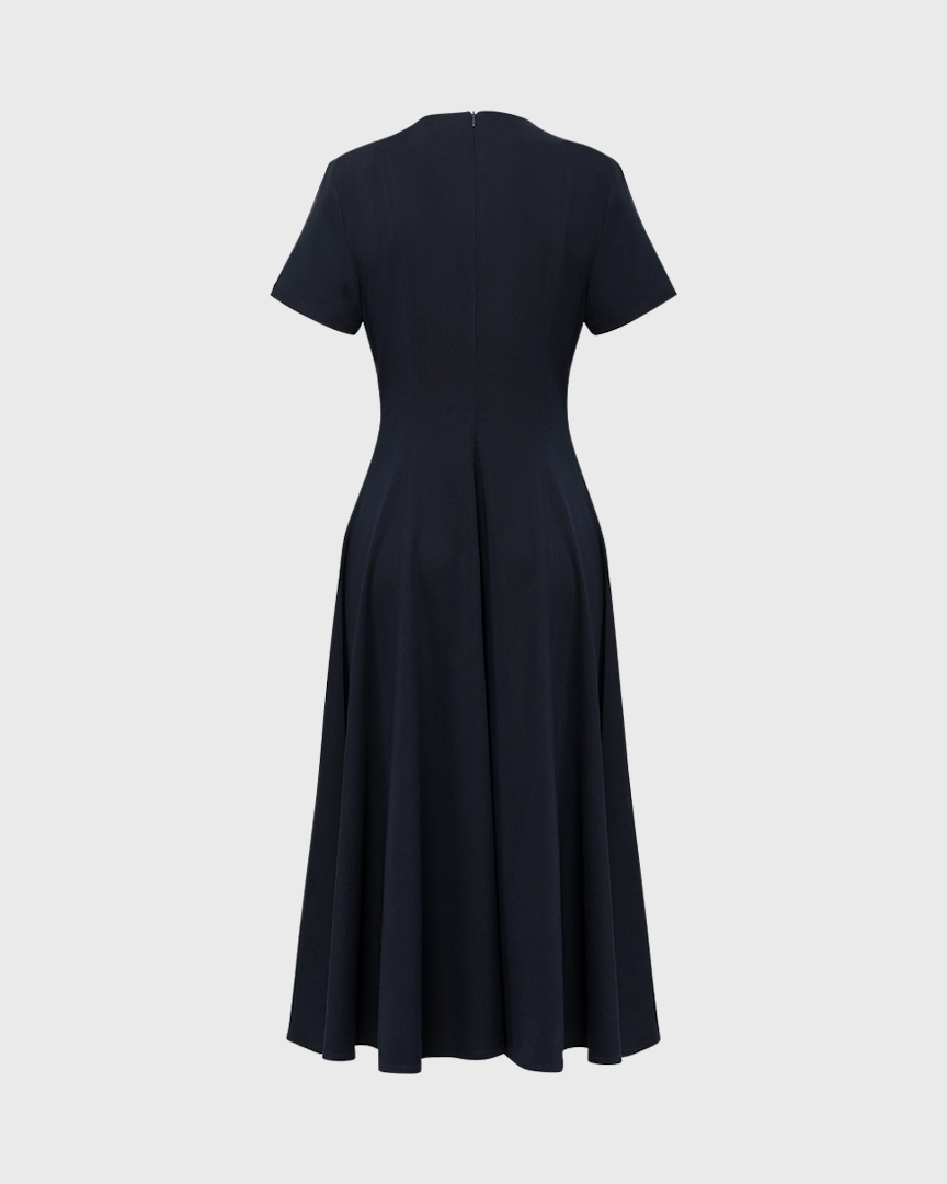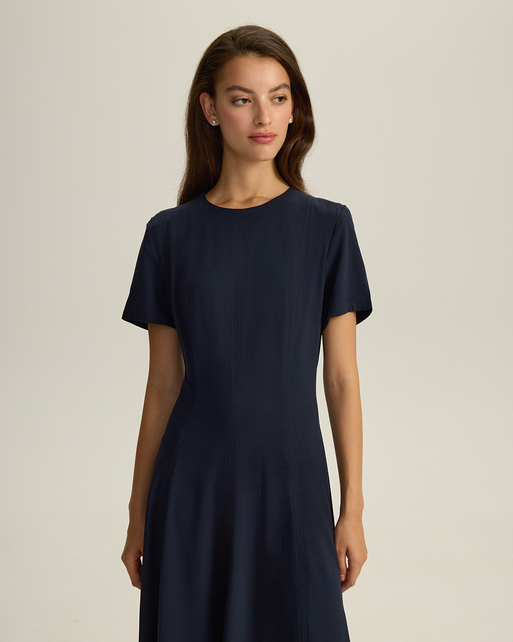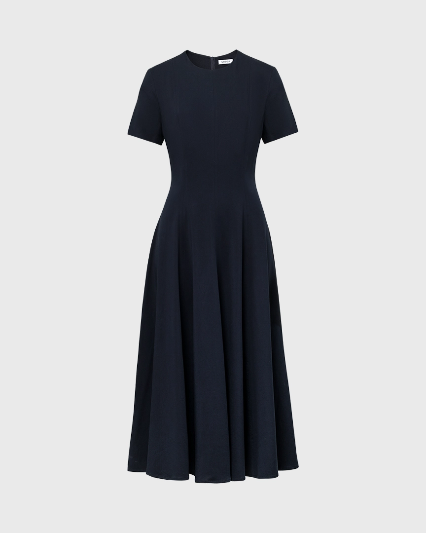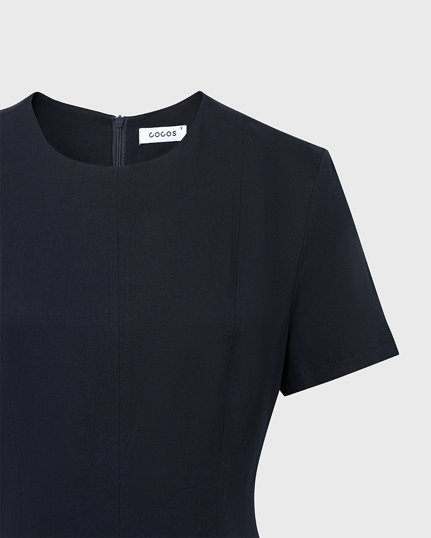 Платье приталенного кроя из лиоцелла и района. Круглый вырез. Короткие рукава. Застежка на молнию.