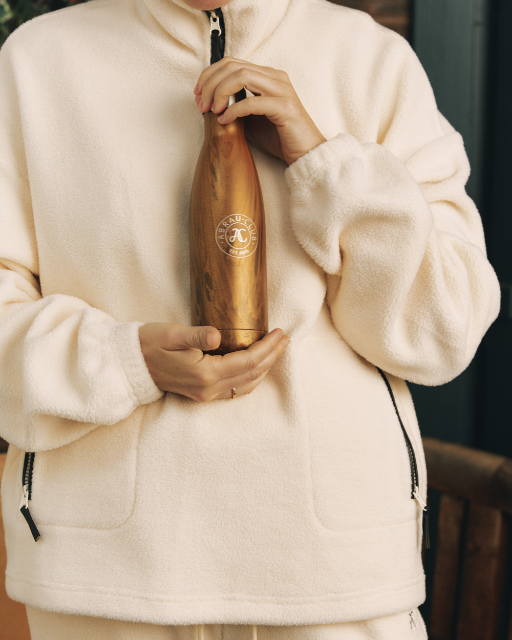 Мягкая флисовая толстовка из смесового хлопка. Воротник-стойка на молнии. Эластичные манжеты и пояс на кулиске. Передние карманы с застежкой на молнию для мелочей, которые нужны под рукой. Кожаная отделка. Вышивка монограммы Abrau Club спереди.