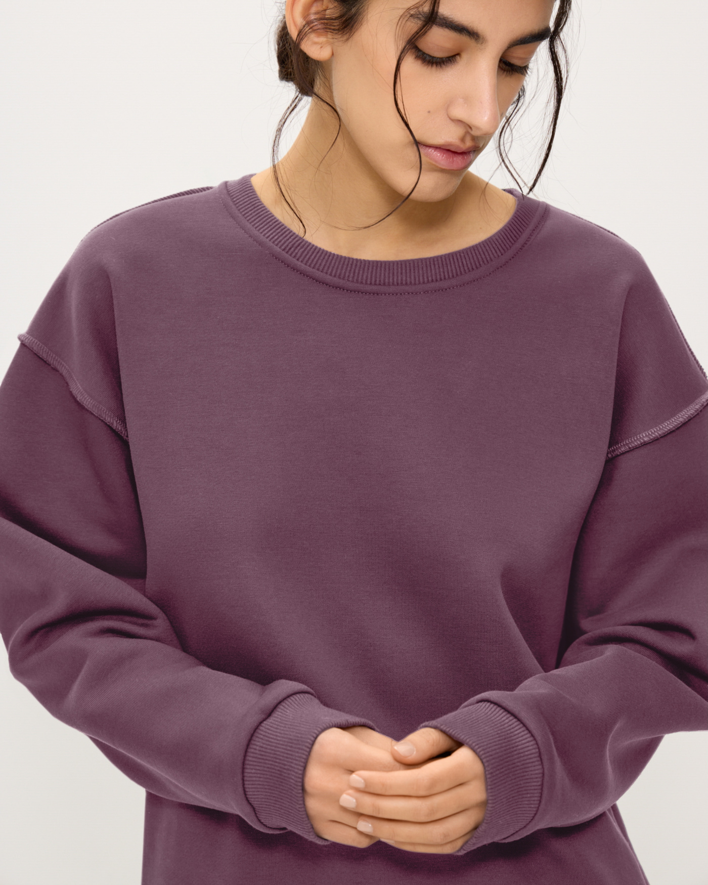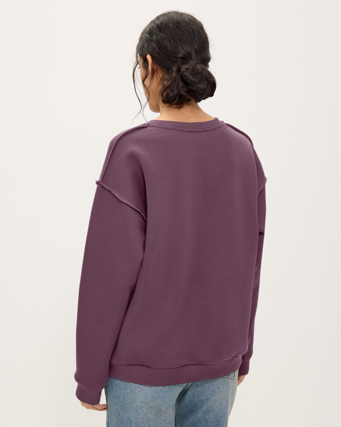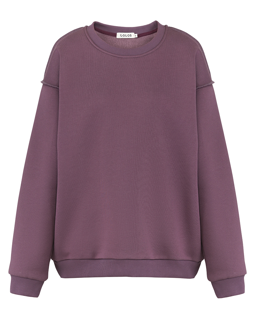 Базовая модель свитшота с интересной деталью — открытыми швами на рукавах. Толстовка свободной посадки из смесового хлопкового футера с мягкой изнанкой. Круглый вырез. Эластичные манжеты на рукавах и нижний край.