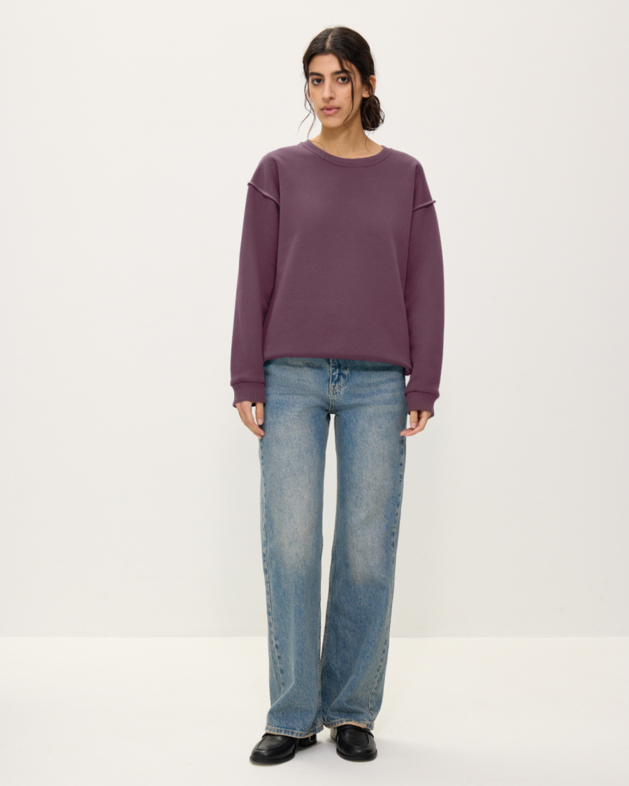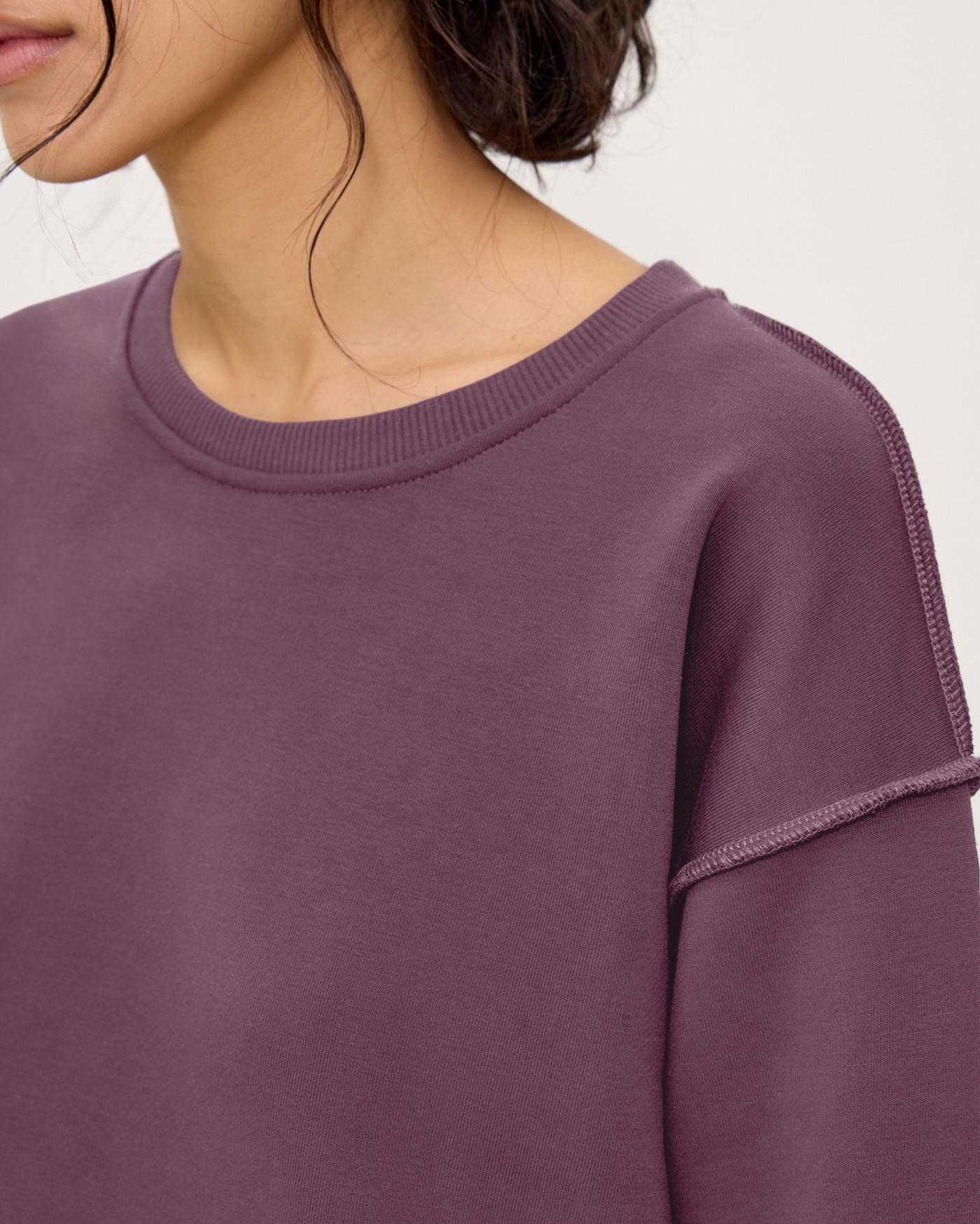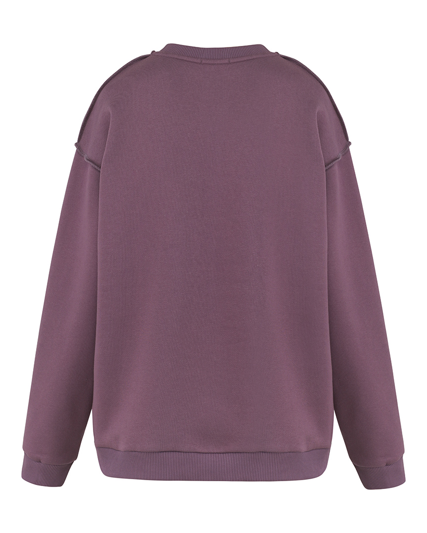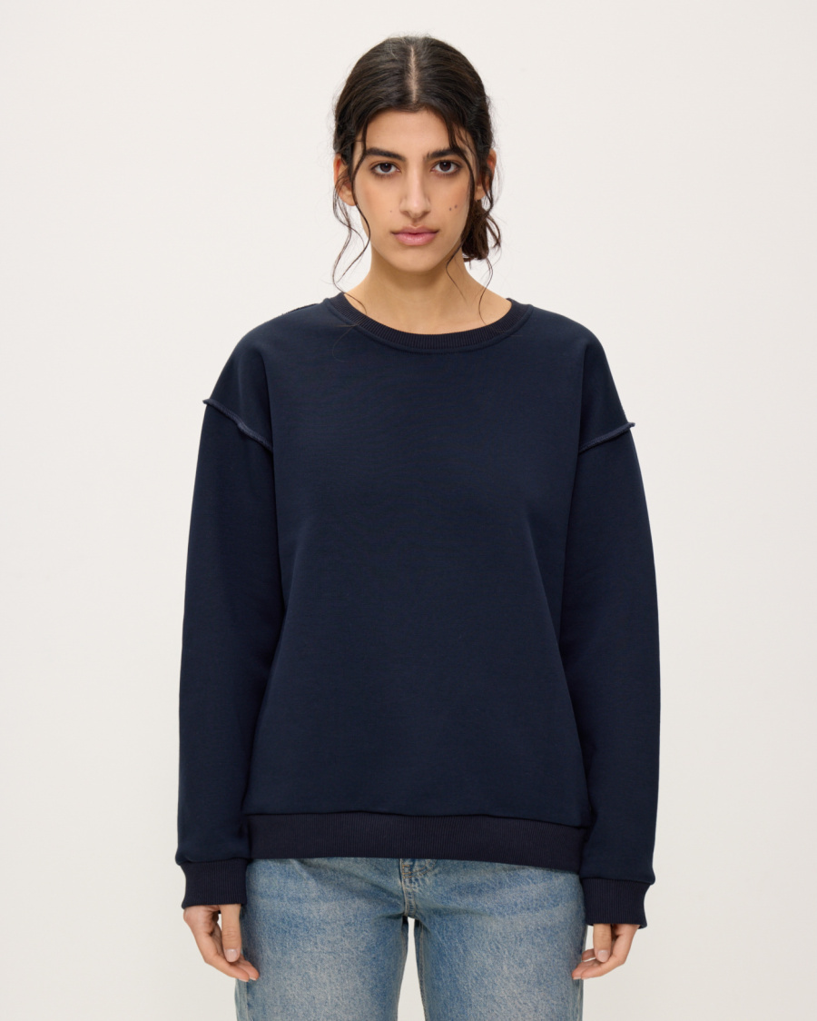 Базовая модель свитшота с интересной деталью — открытыми швами на рукавах. Толстовка свободной посадки из смесового хлопкового футера с мягкой изнанкой. Круглый вырез. Эластичные манжеты на рукавах и нижний край.