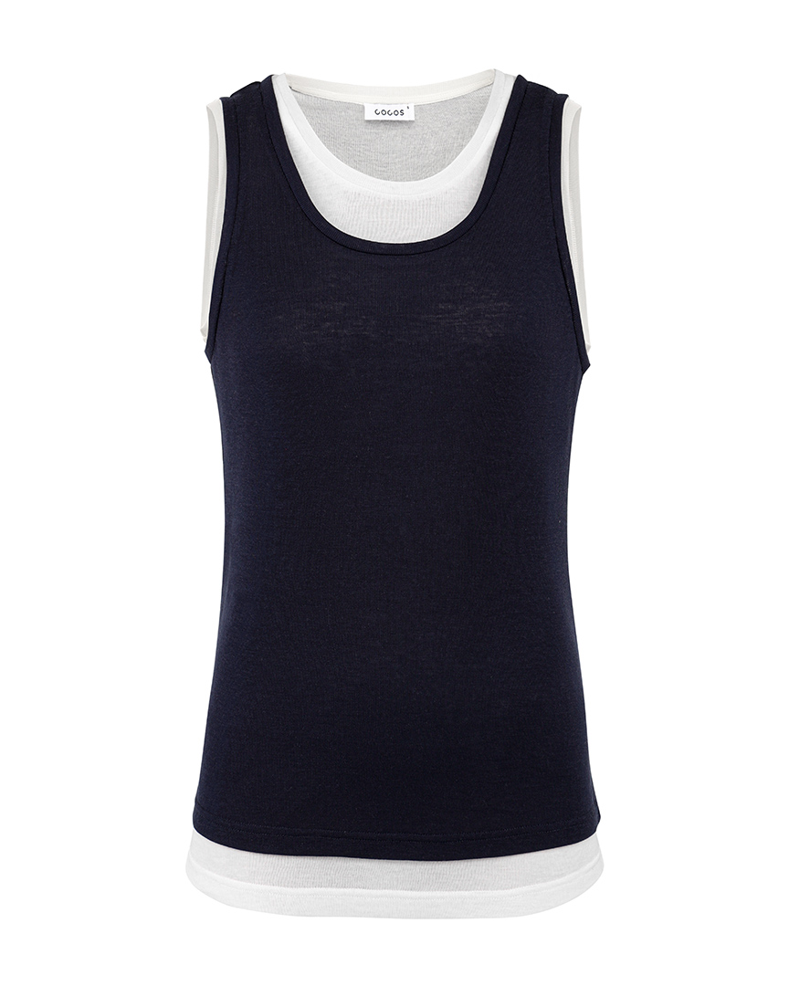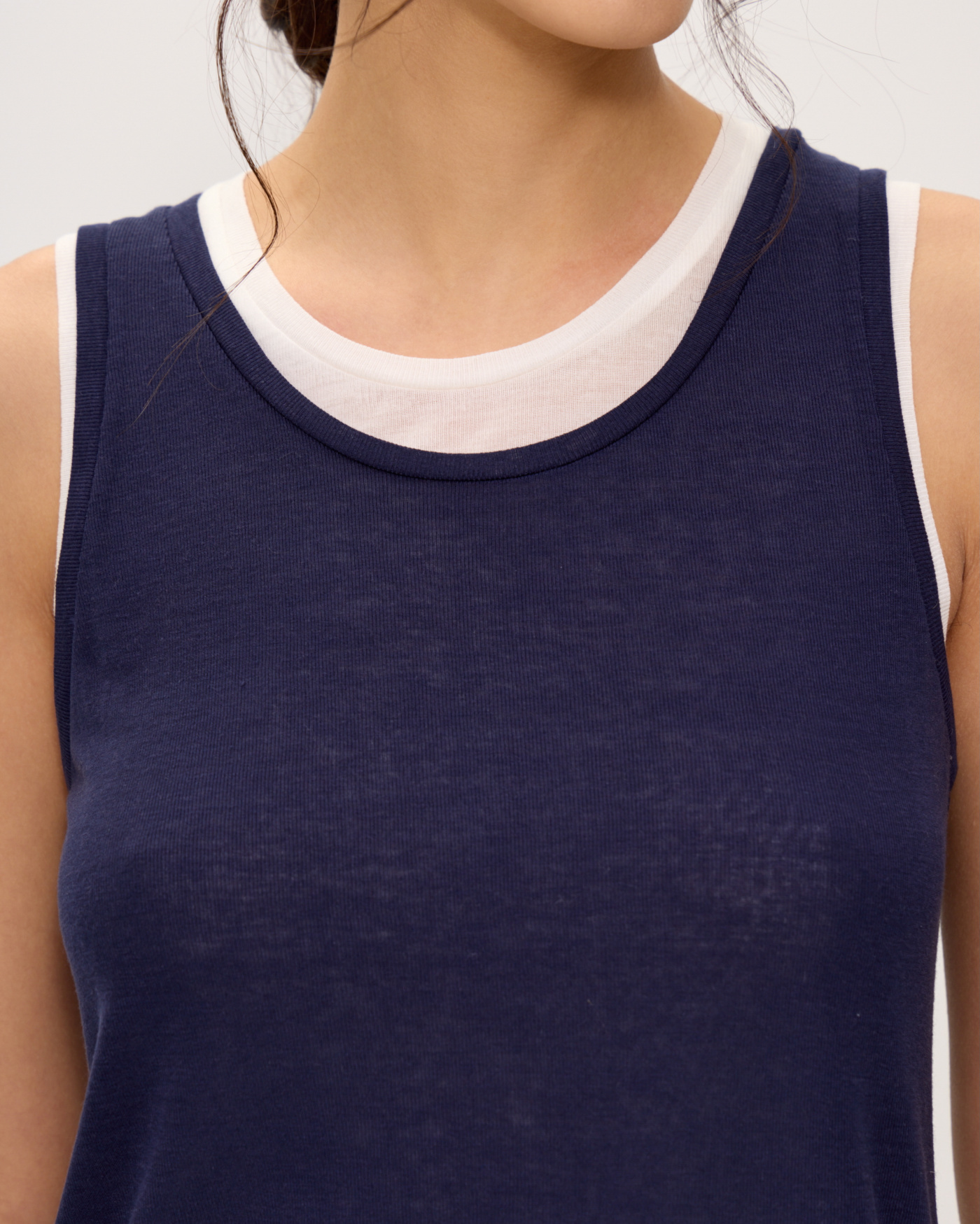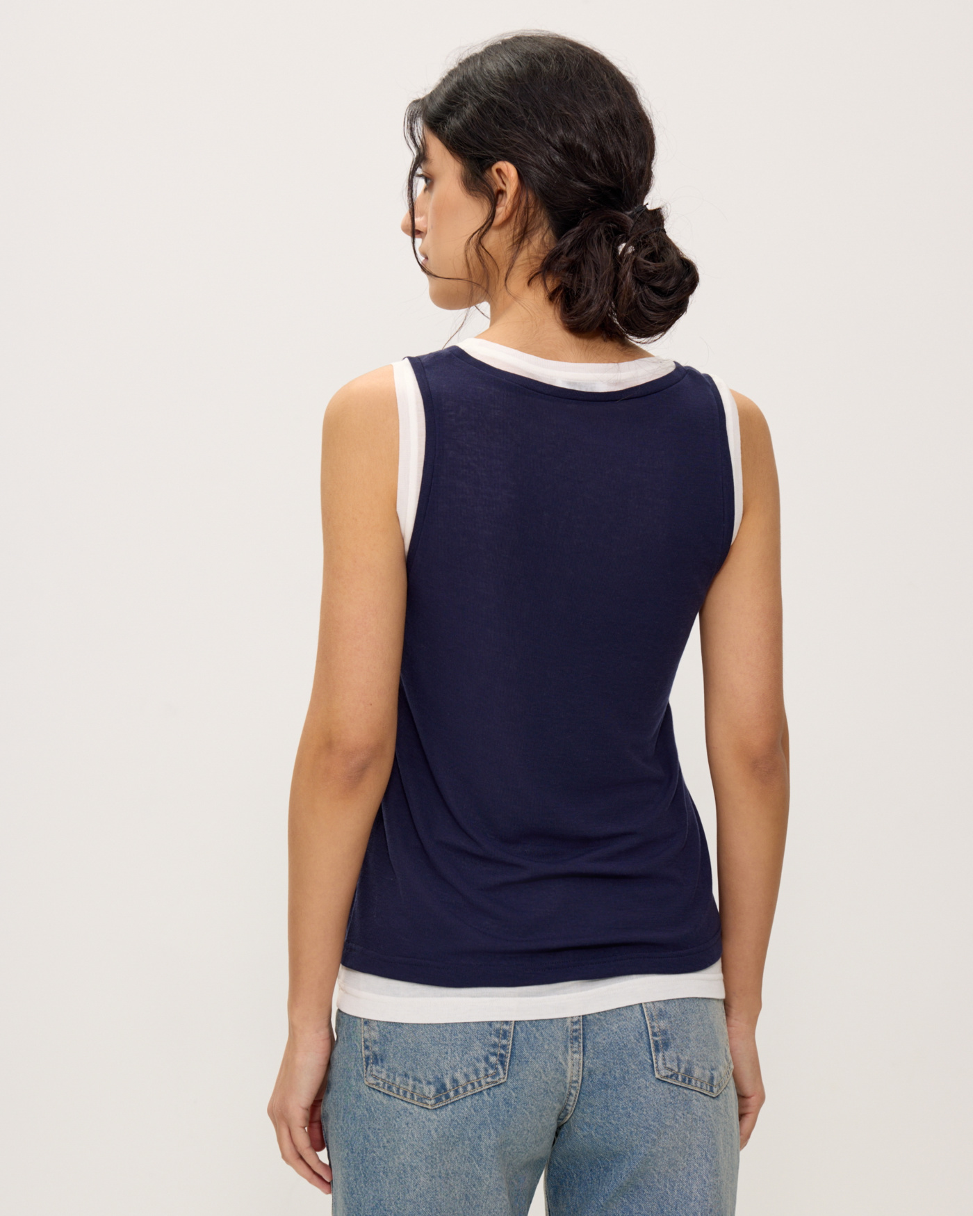 Иногда бывает сложно подобрать два топа так, чтобы эффект многослойности смотрелся стильно. Они должны различаться по длине и глубине выреза, но не слишком. В этом сезоне мы уже всё продумали за вас и соединили белую и темно-синюю майки нужных форм в одной. Правильный эффект многослойности готов.