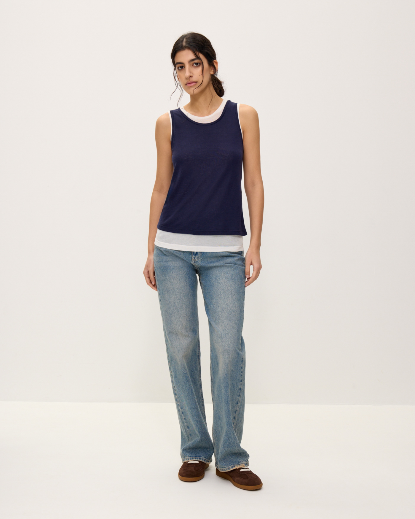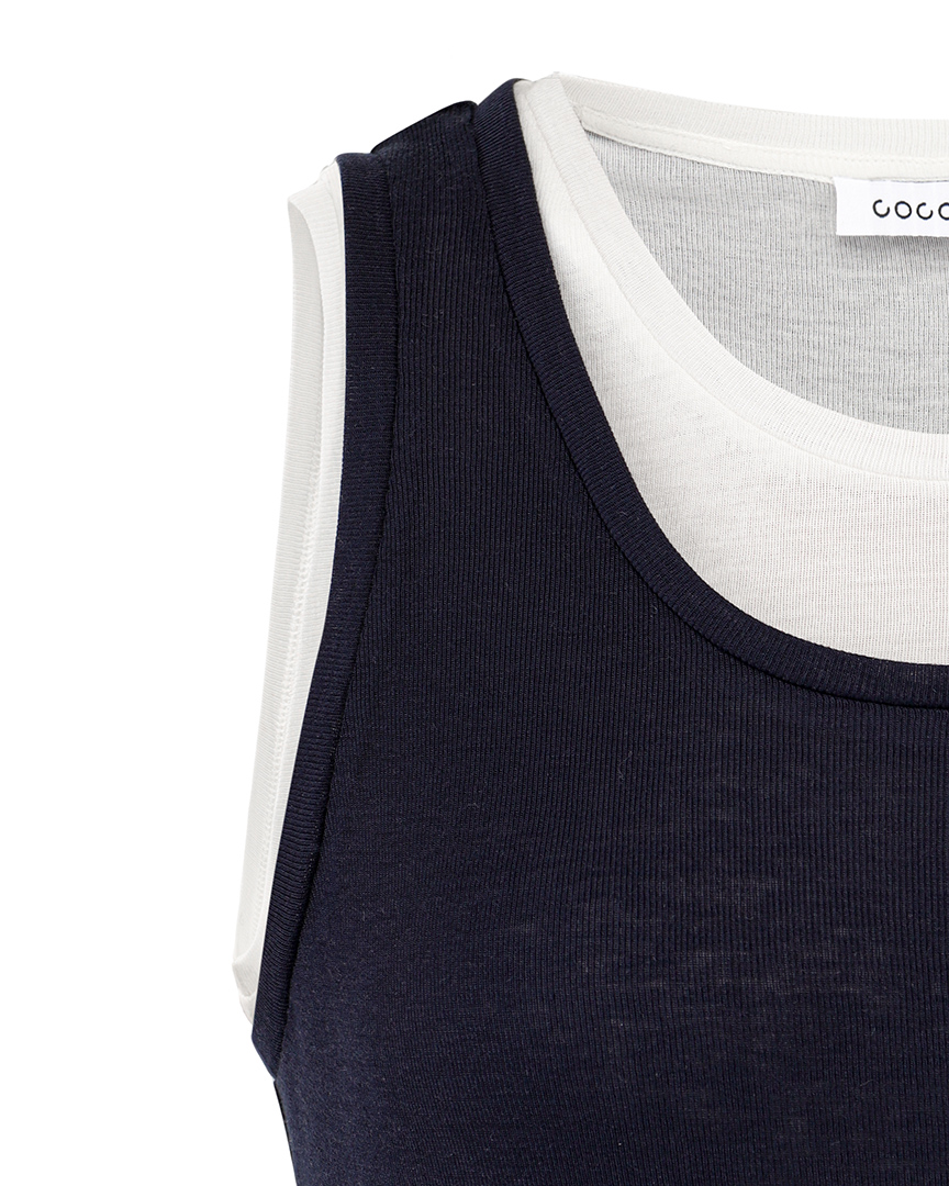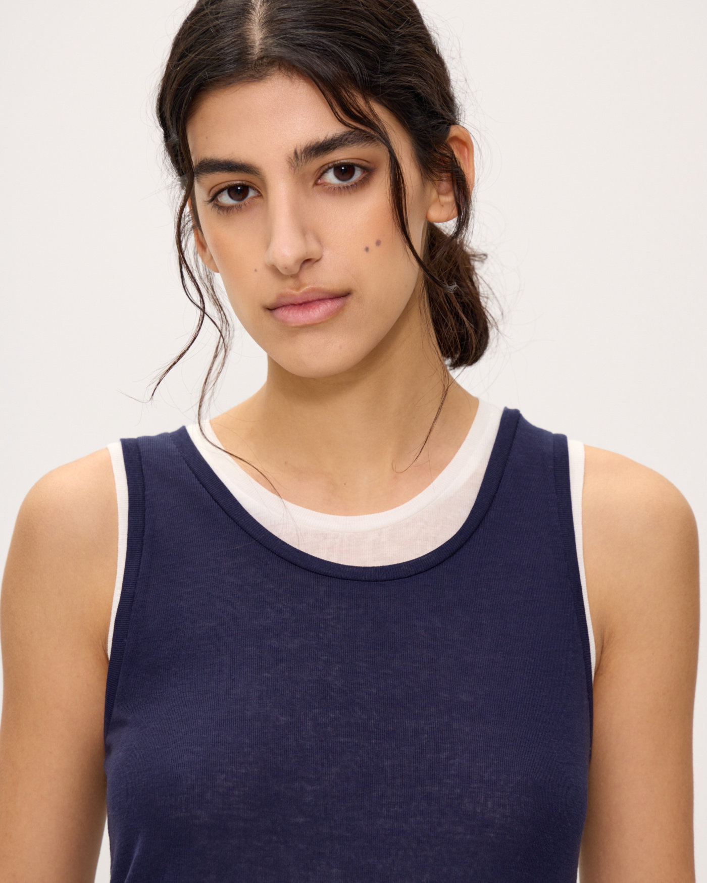 Иногда бывает сложно подобрать два топа так, чтобы эффект многослойности смотрелся стильно. Они должны различаться по длине и глубине выреза, но не слишком. В этом сезоне мы уже всё продумали за вас и соединили белую и темно-синюю майки нужных форм в одной. Правильный эффект многослойности готов.