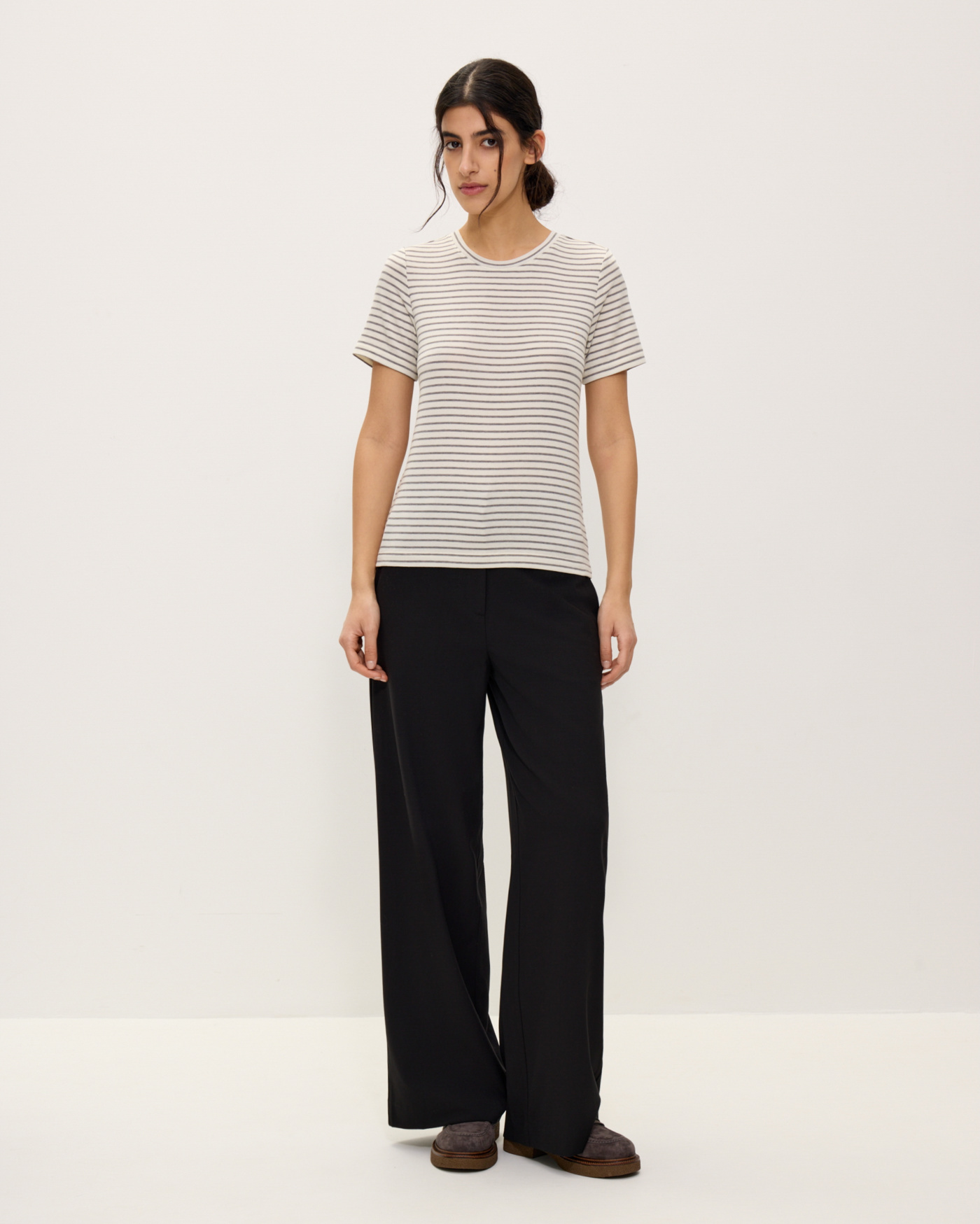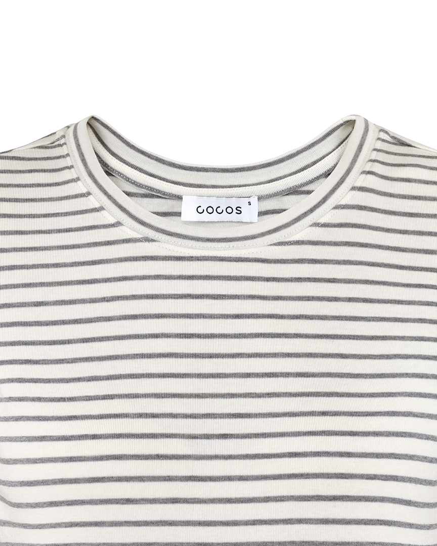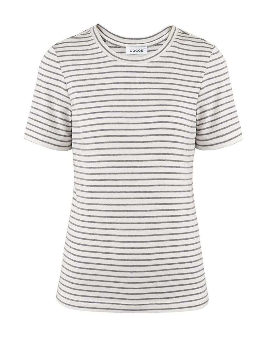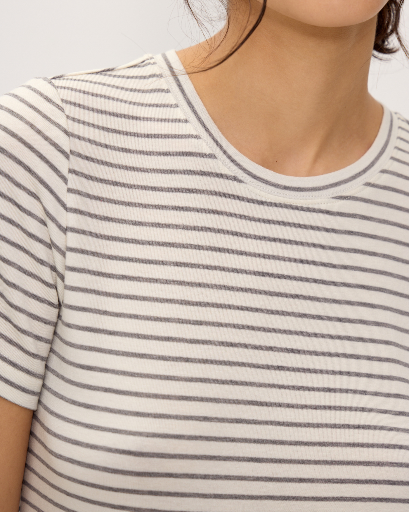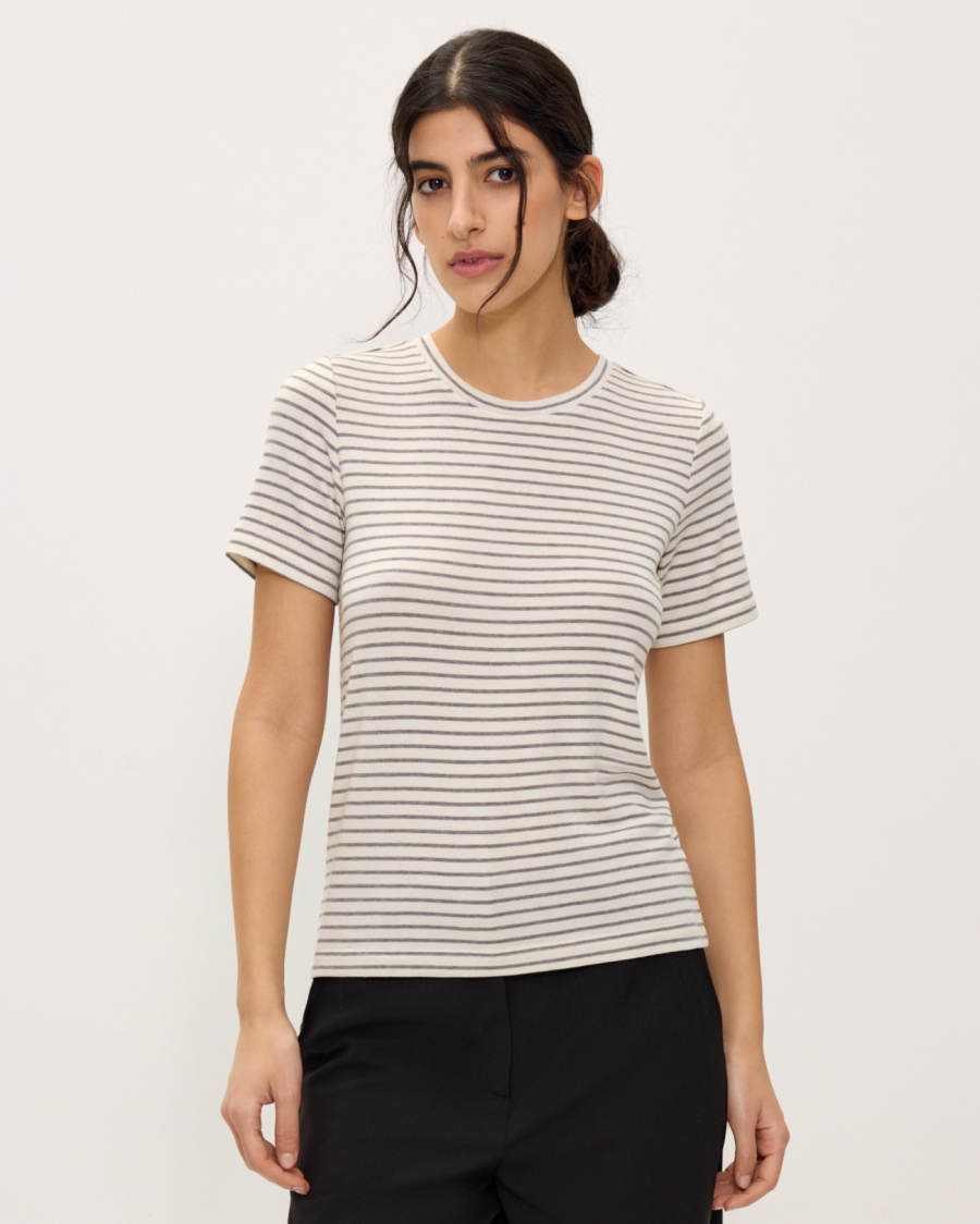 Футболка в не крупную полоску, из комфортного дышащего материала на основе тенселя (из волокна эвкалипта). Круглый вырез. Короткие рукава. Футболка классической посадки, приталенного кроя, без оверсайз эффекта, с аккуратной линией ворота. Отлично подойдет как база под жакеты, кардиганы, плотные однотонные рубашки, а также будет стильно смотреться сама по себе как топ к классическим однотонным брюкам, юбкам миди и джинсам, особенно в молочном оттенке.