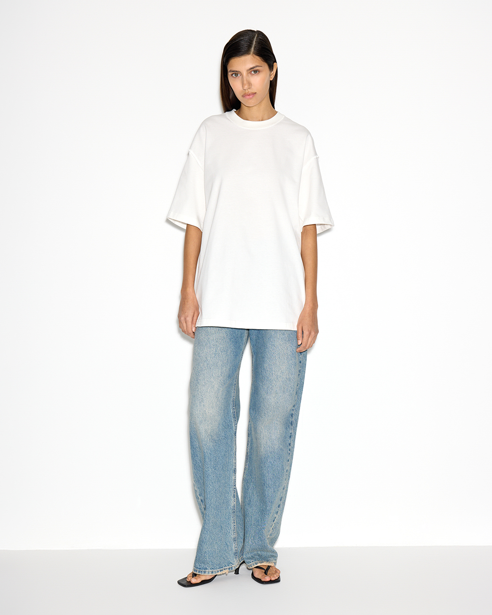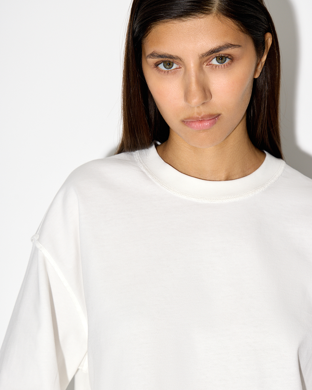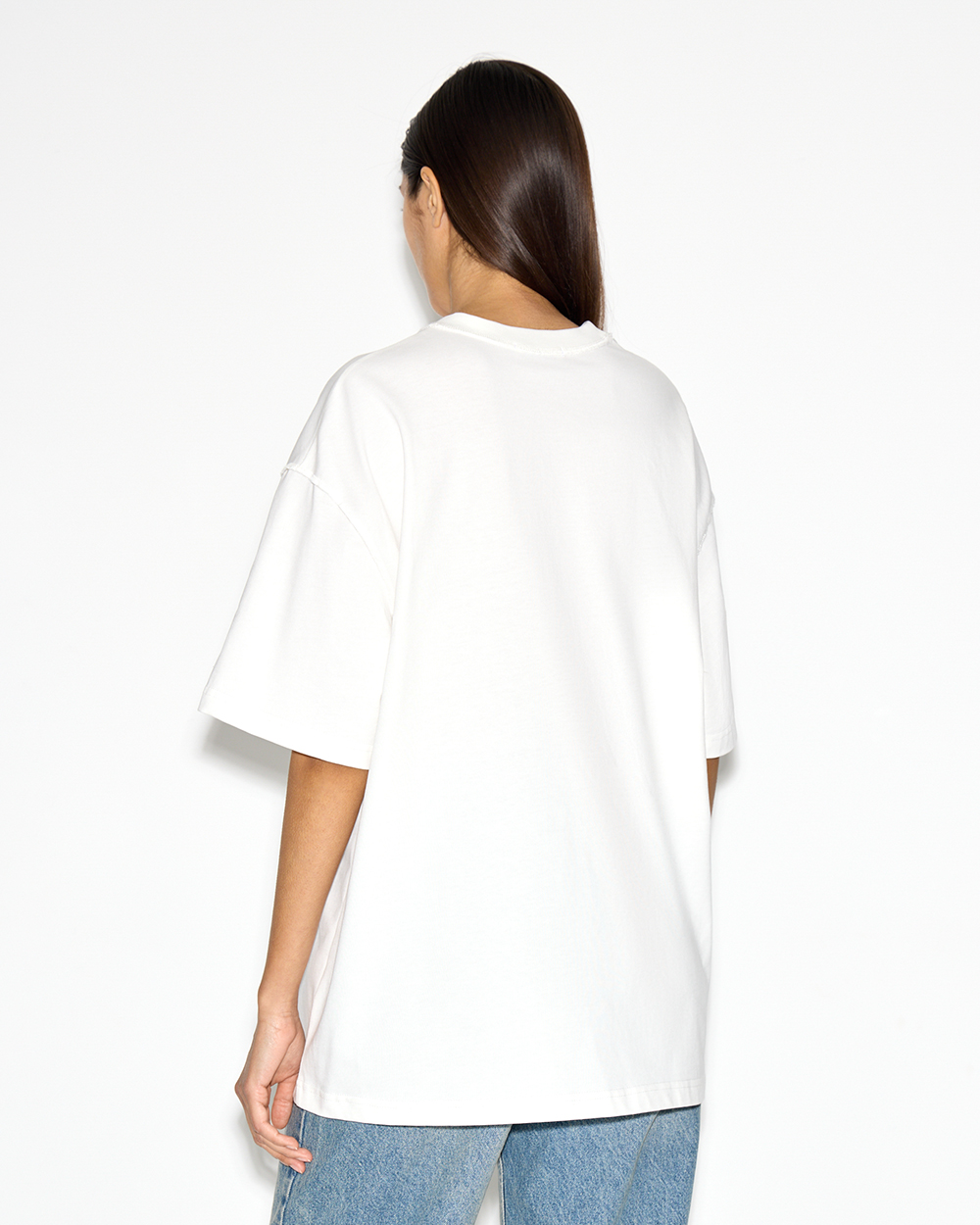 Есть ли предел у любви к оверсайзу? Эту футболку мы выполнили в новой посадке, с супер-оверсайз эффектом. Спущенная линия плеча и акцентные швы.