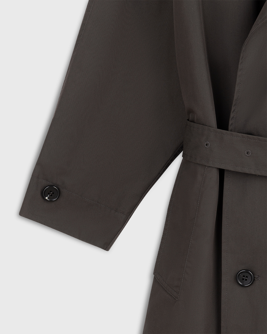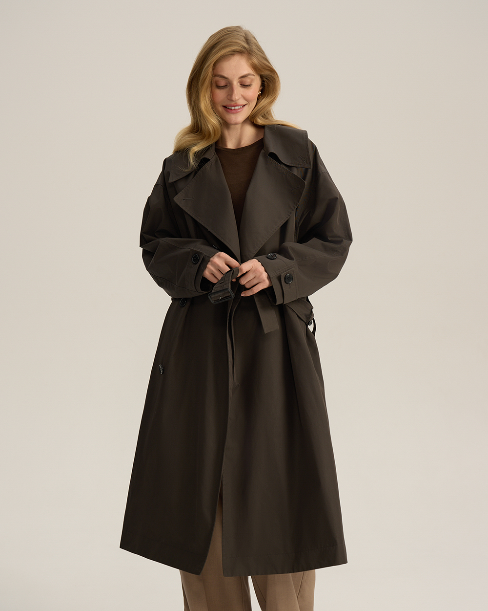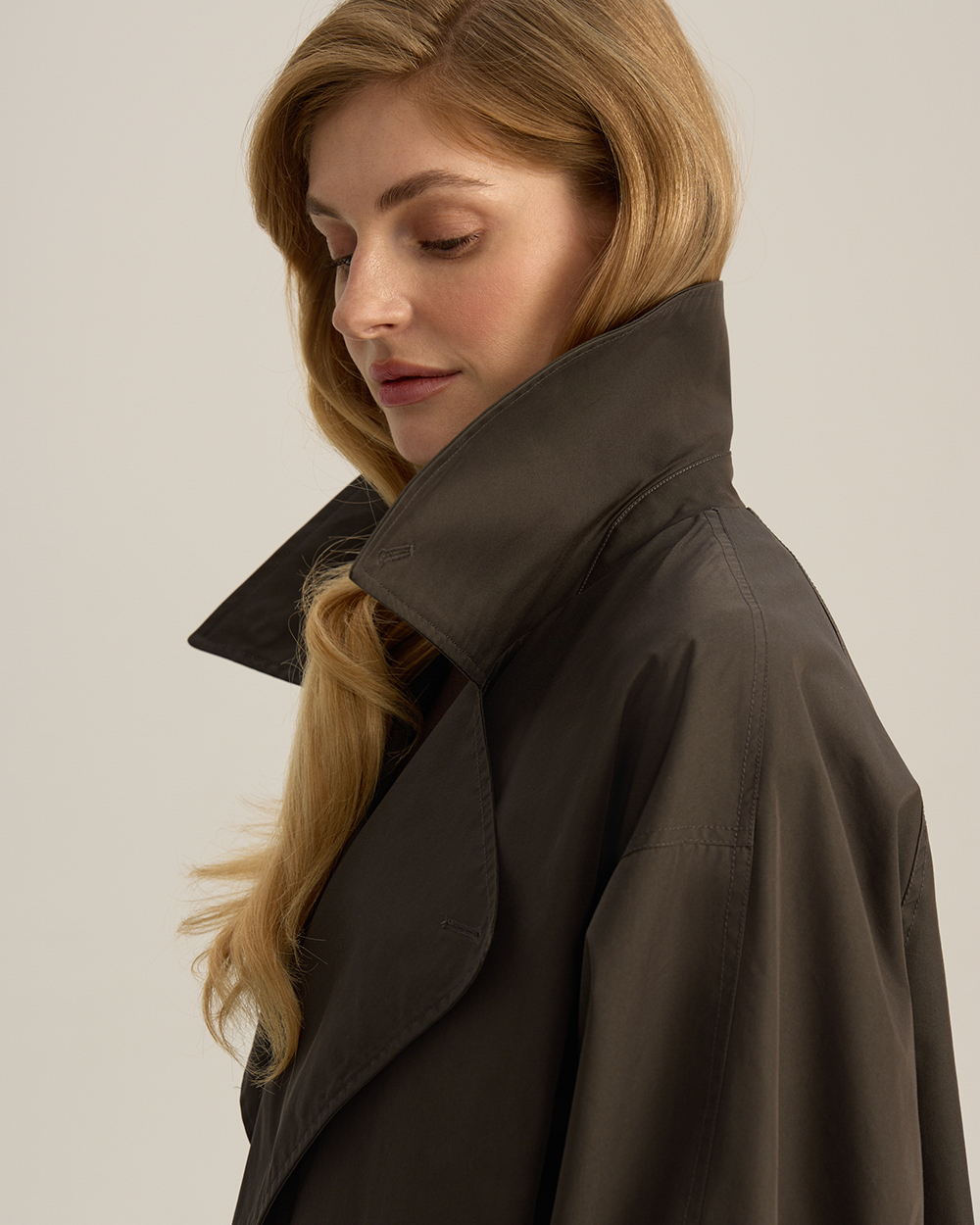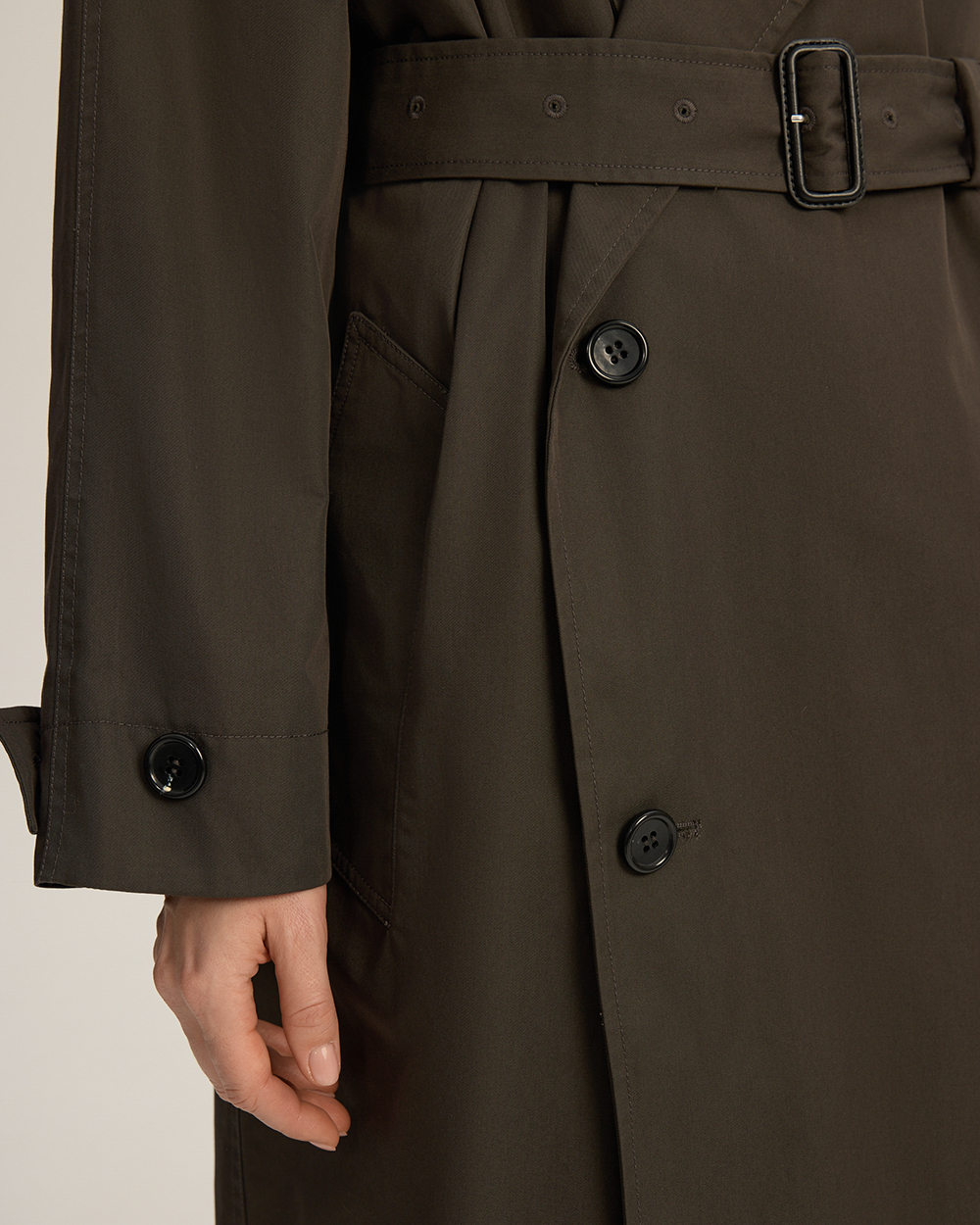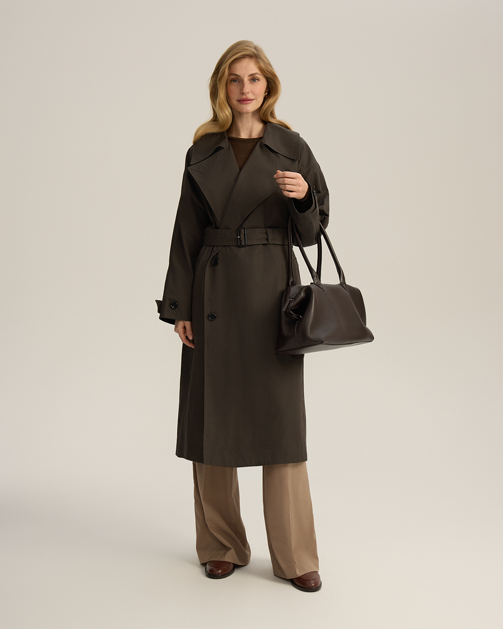 Двубортный oversize‑тренч выполнен из прочной и комфортной смеси хлопка с нейлоном — сочетание натуральной фактуры и повышенной износостойкости. Свободный силуэт со спущенной линией плеча создает современный, расслабленный образ. Регулируемые паты на рукавах позволяют менять посадку манжет и форму рукава. тест