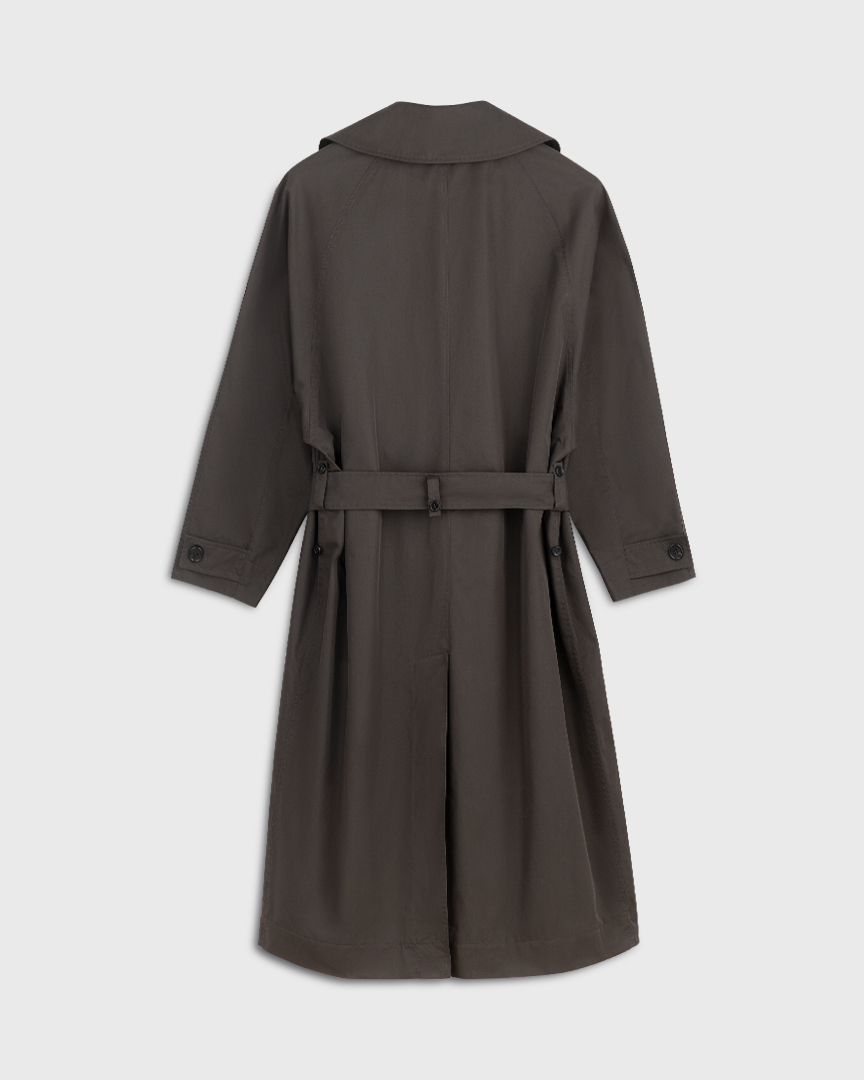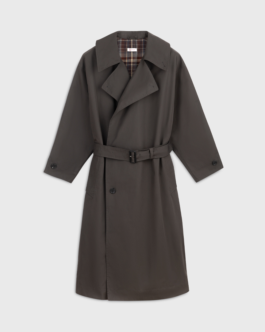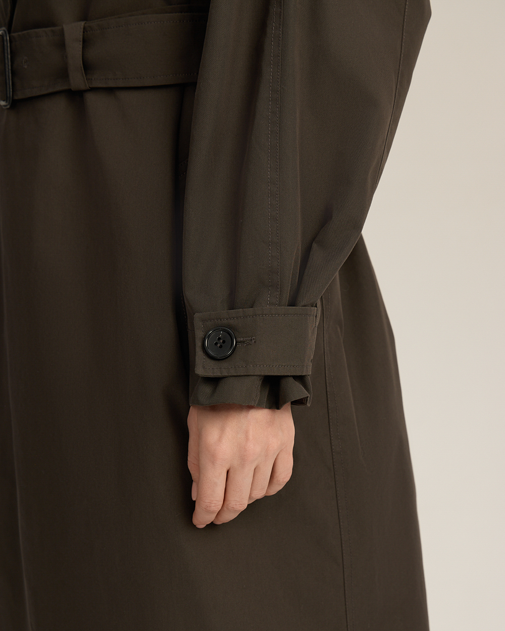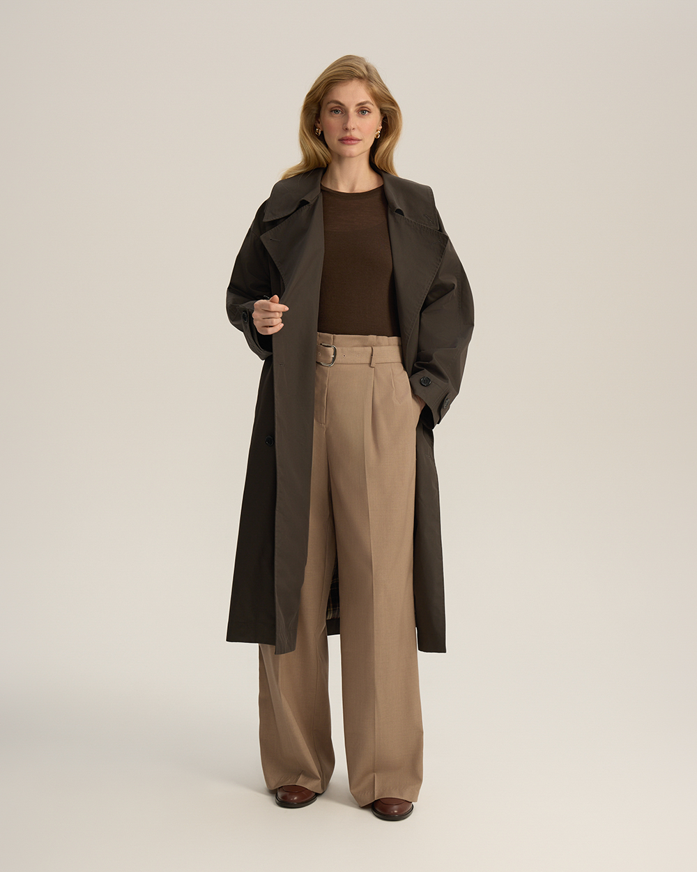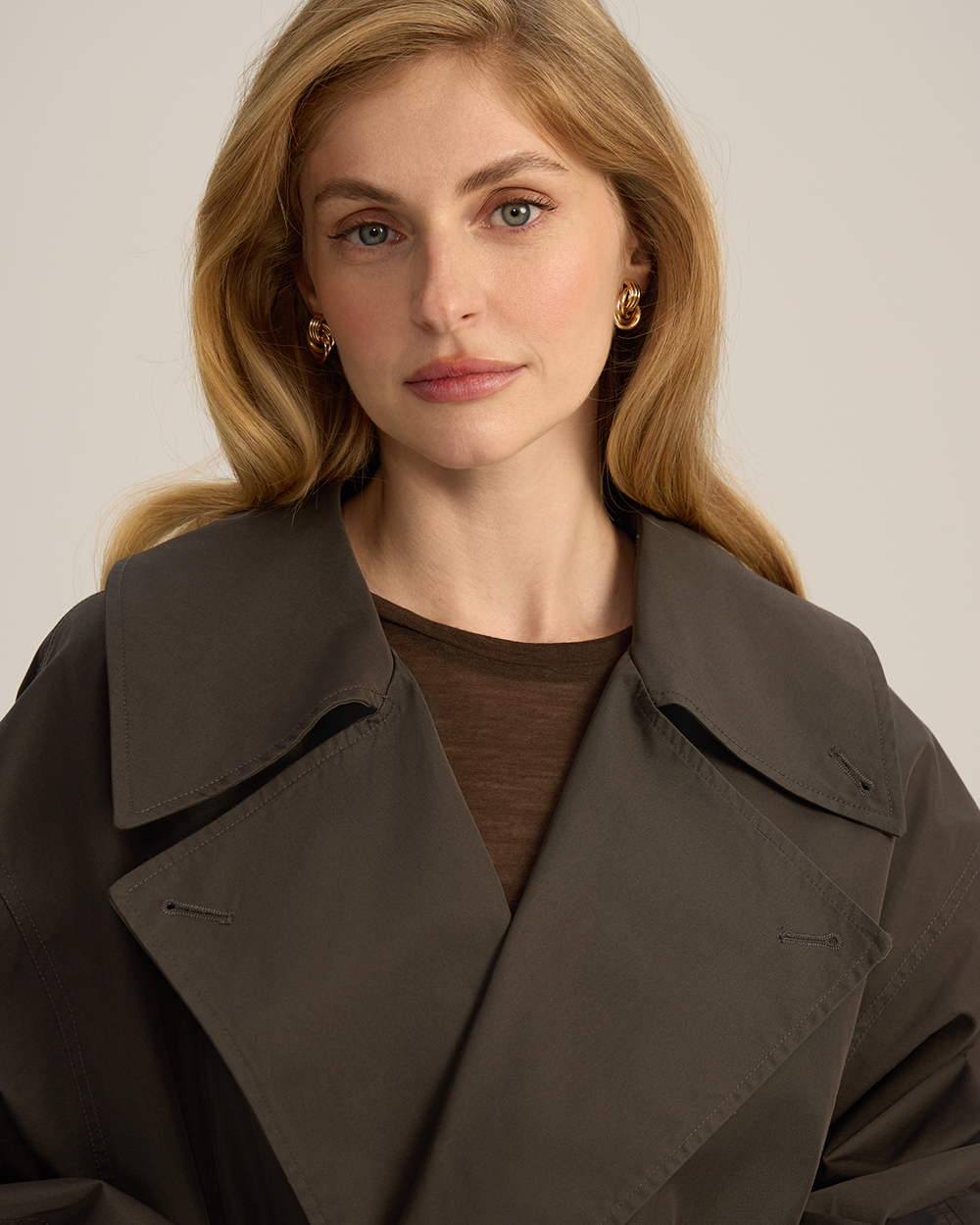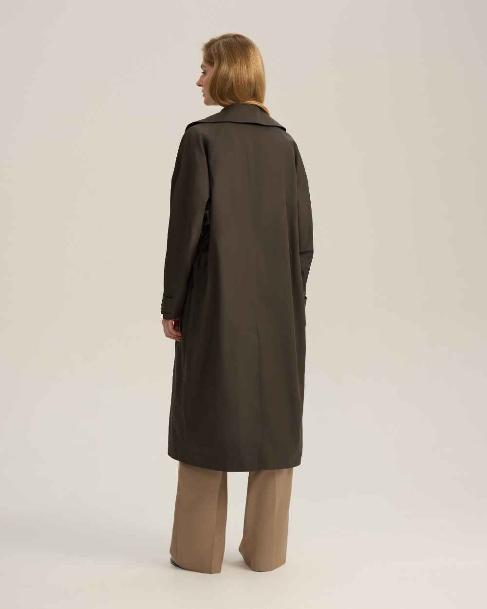 Двубортный oversize‑тренч выполнен из прочной и комфортной смеси хлопка с нейлоном — сочетание натуральной фактуры и повышенной износостойкости. Свободный силуэт со спущенной линией плеча создает современный, расслабленный образ. Регулируемые паты на рукавах позволяют менять посадку манжет и форму рукава. тест