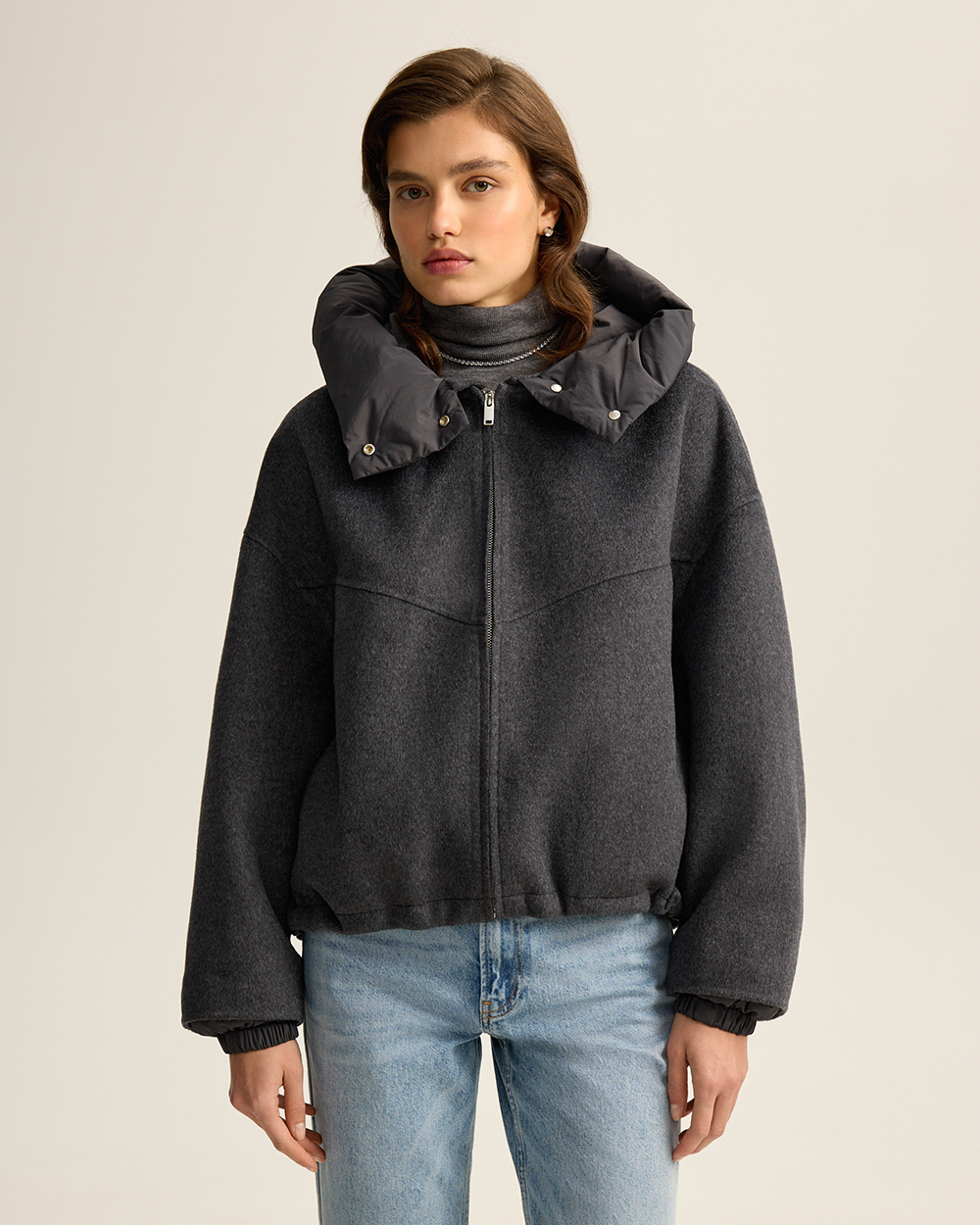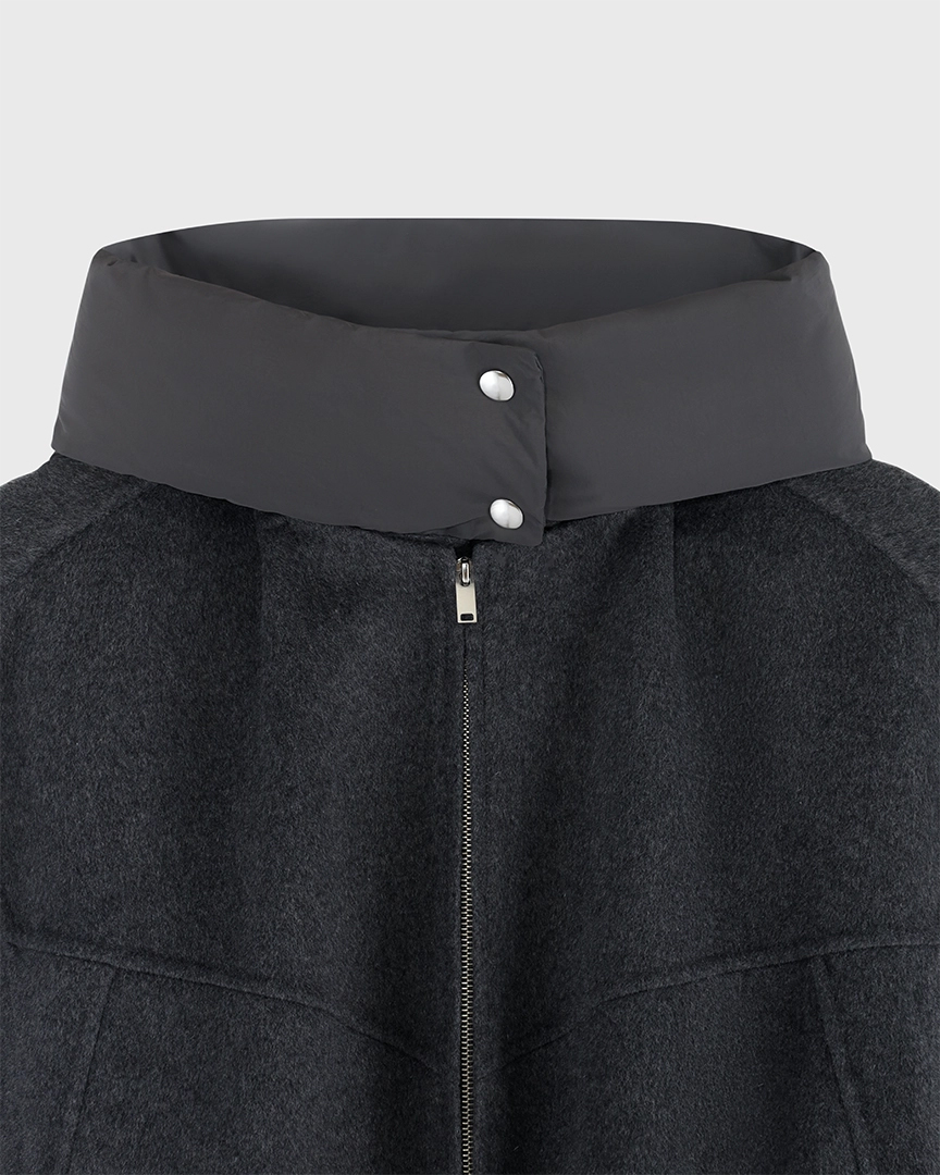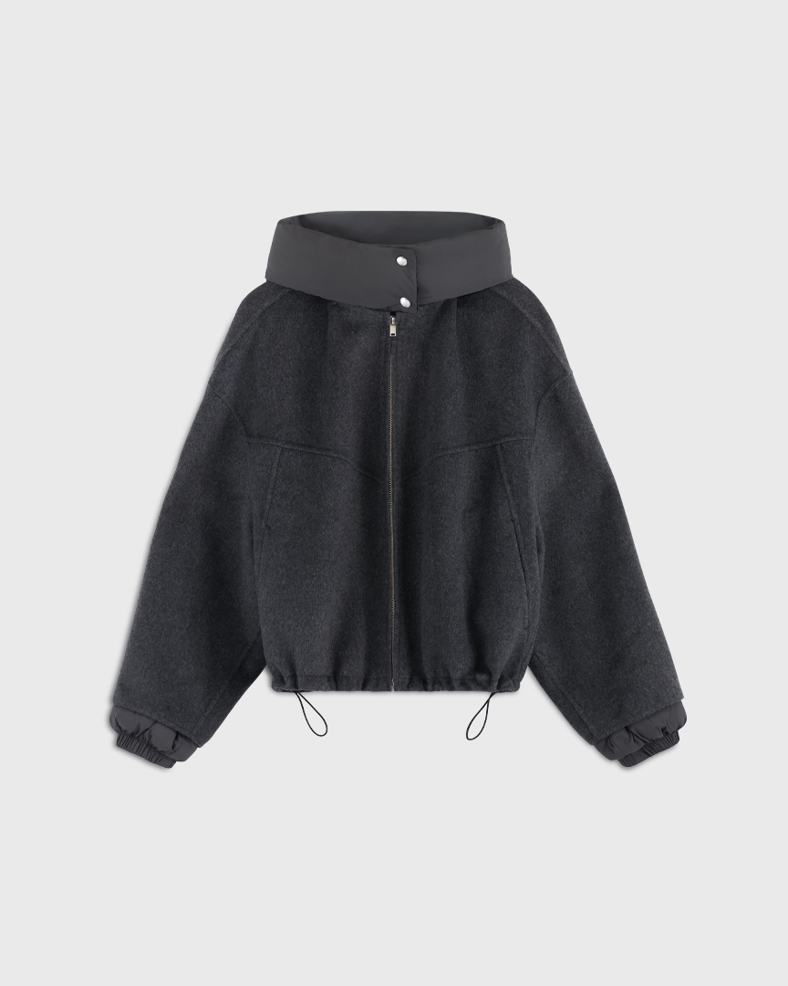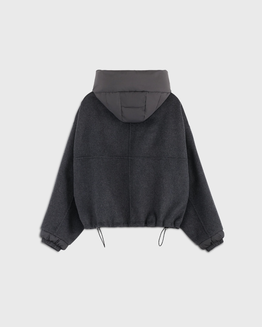 Удобно, когда вещи могут выполнять в гардеробе сразу несколько функций. Мы наделили этой сверх-способностью новую куртку из шерстяной пальтовой ткани. Она может выступать в гардеробе как куртка с капюшоном и как шерстяной бомбер: утепленный капюшон на кнопках и манжеты отстегиваются.