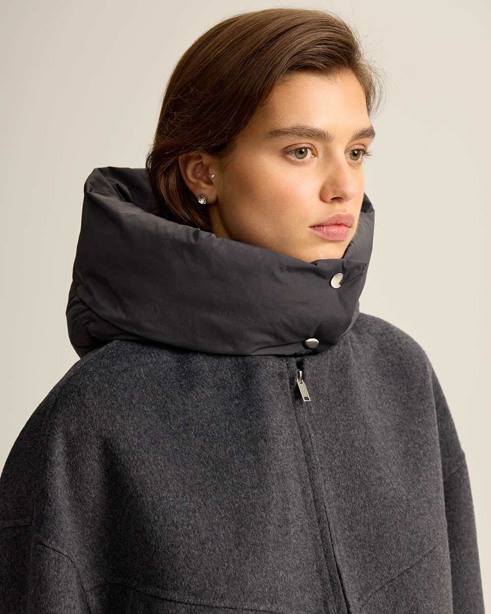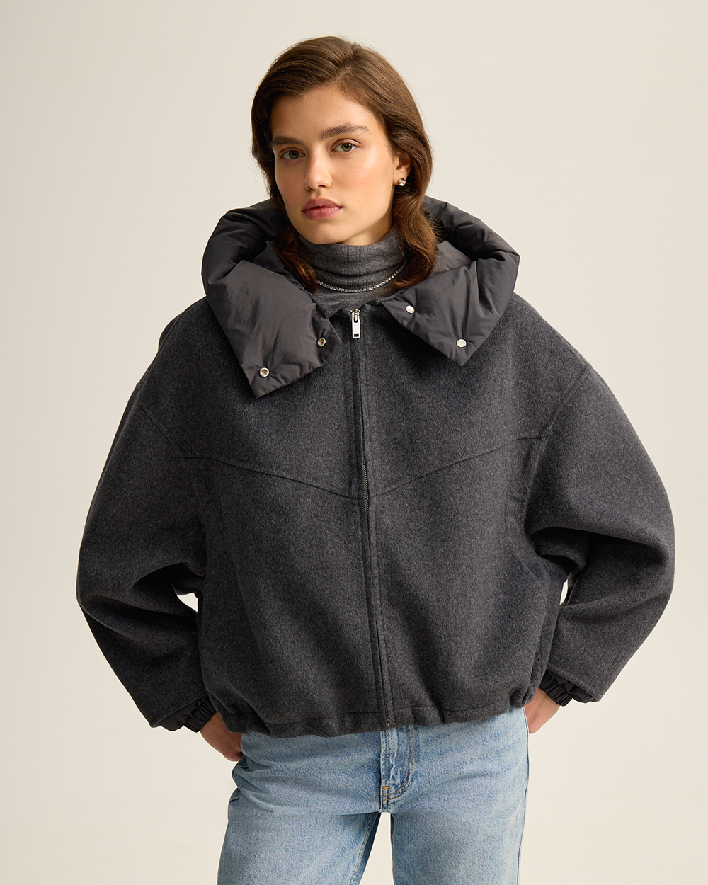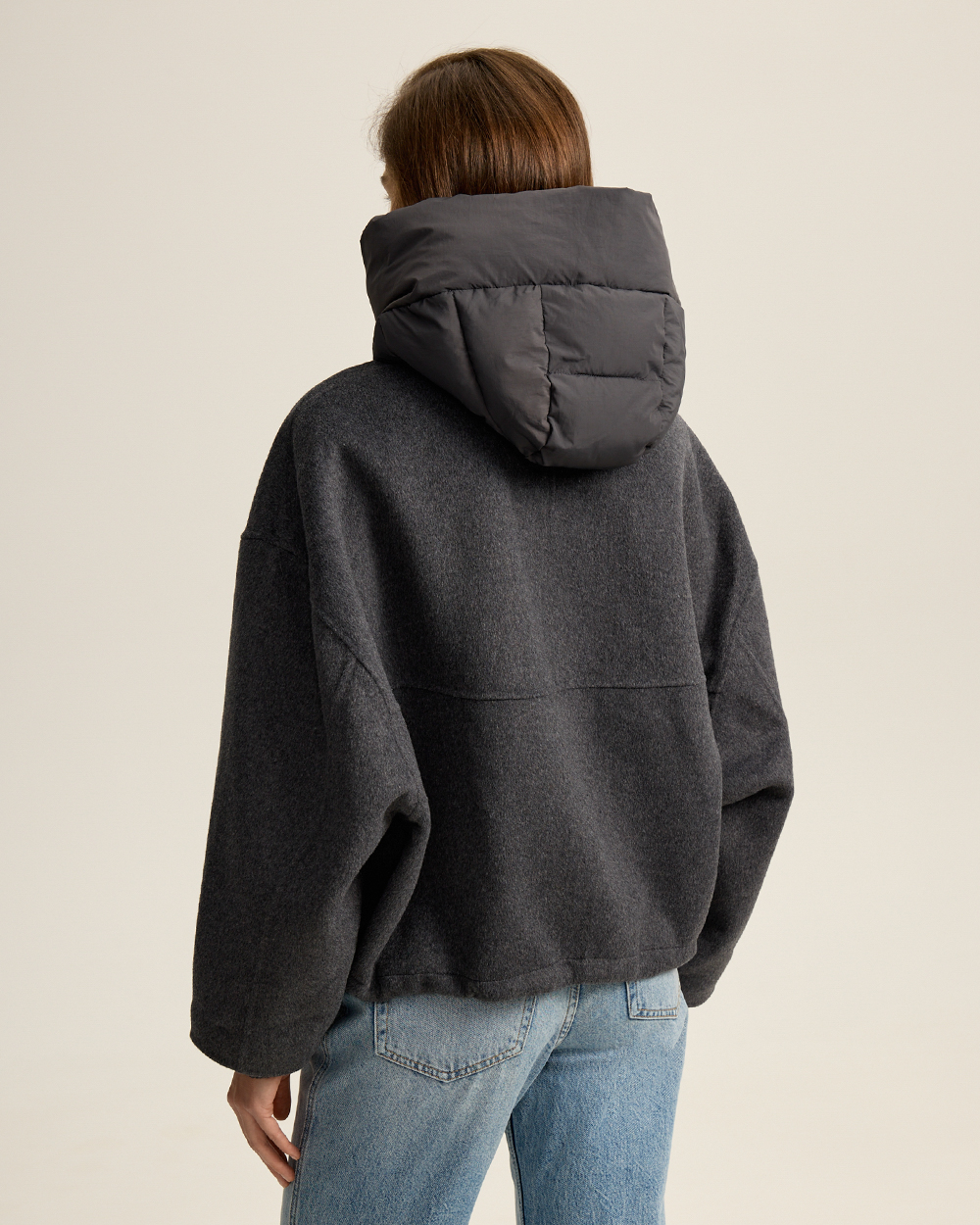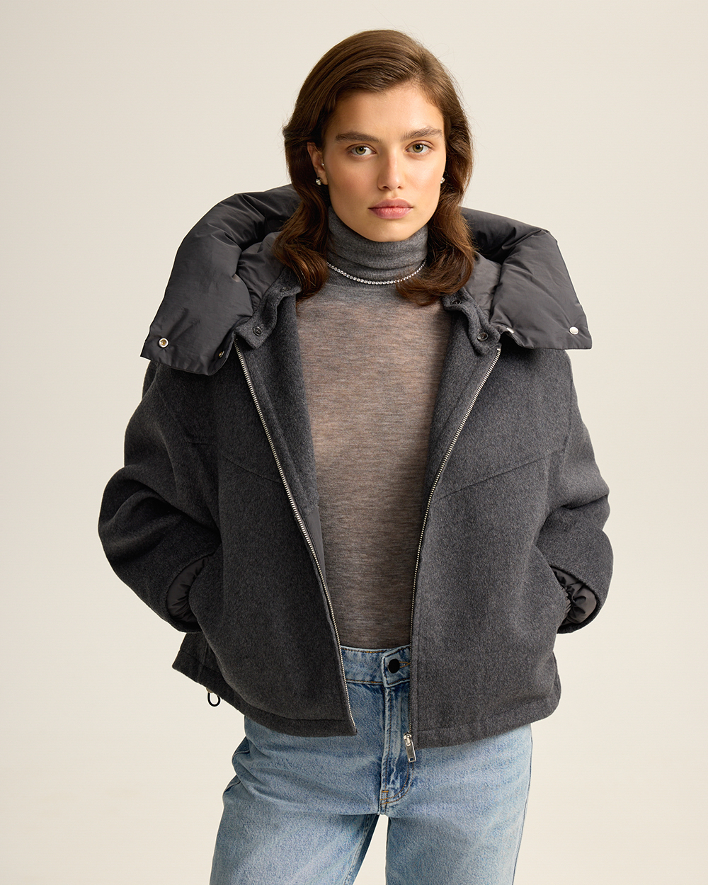 Удобно, когда вещи могут выполнять в гардеробе сразу несколько функций. Мы наделили этой сверх-способностью новую куртку из шерстяной пальтовой ткани. Она может выступать в гардеробе как куртка с капюшоном и как шерстяной бомбер: утепленный капюшон на кнопках и манжеты отстегиваются.