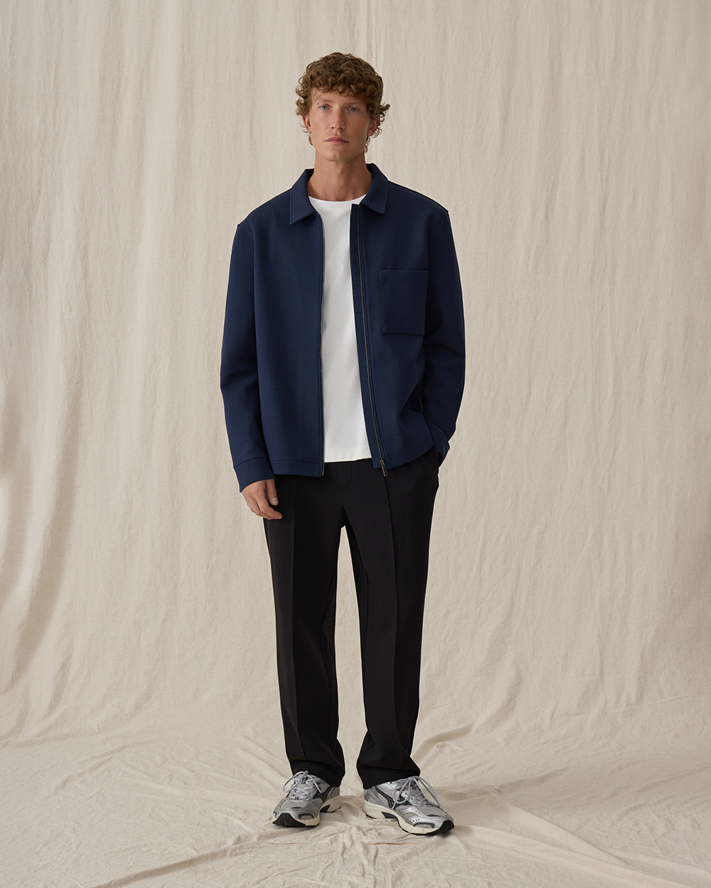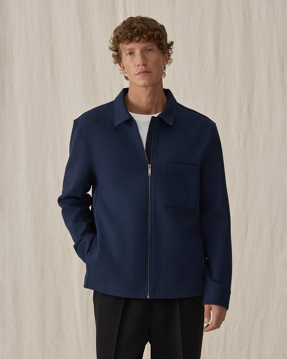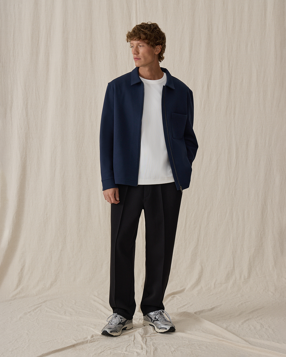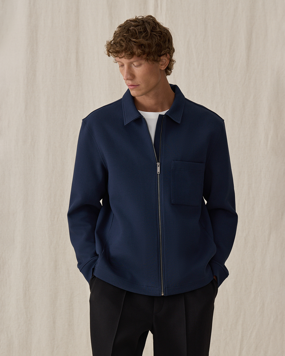 Мы выбрали плотный хлопковый футер как самый комфортный материал, для того чтобы создать из него удобную куртку, в которой чувствуешь себя, как в любимой толстовке. Отложной воротник делает образ более четким и структурным.