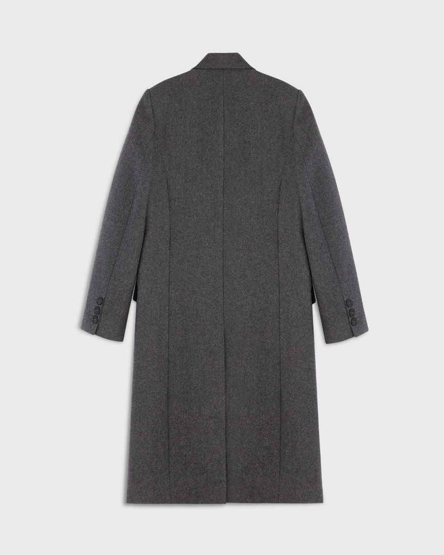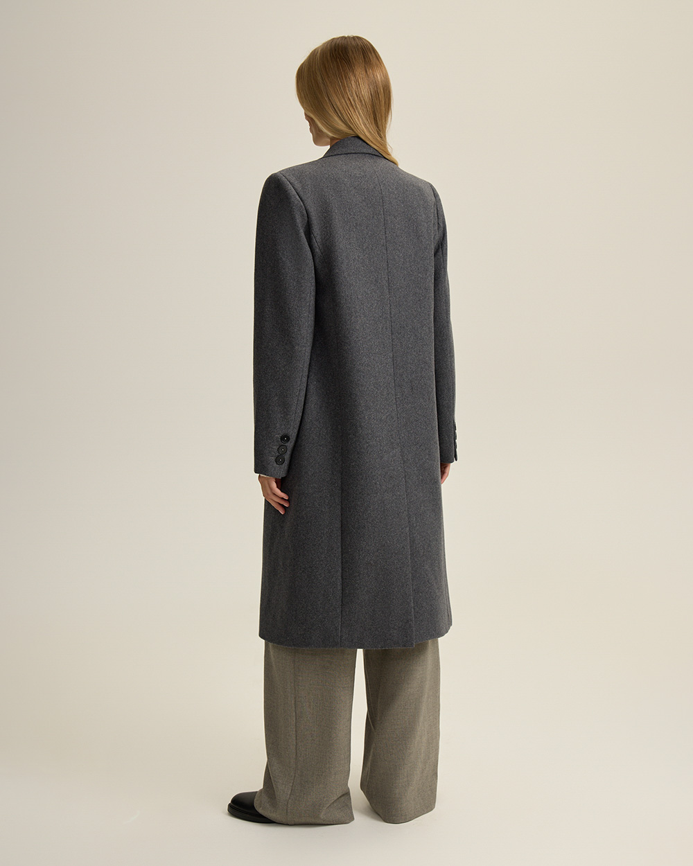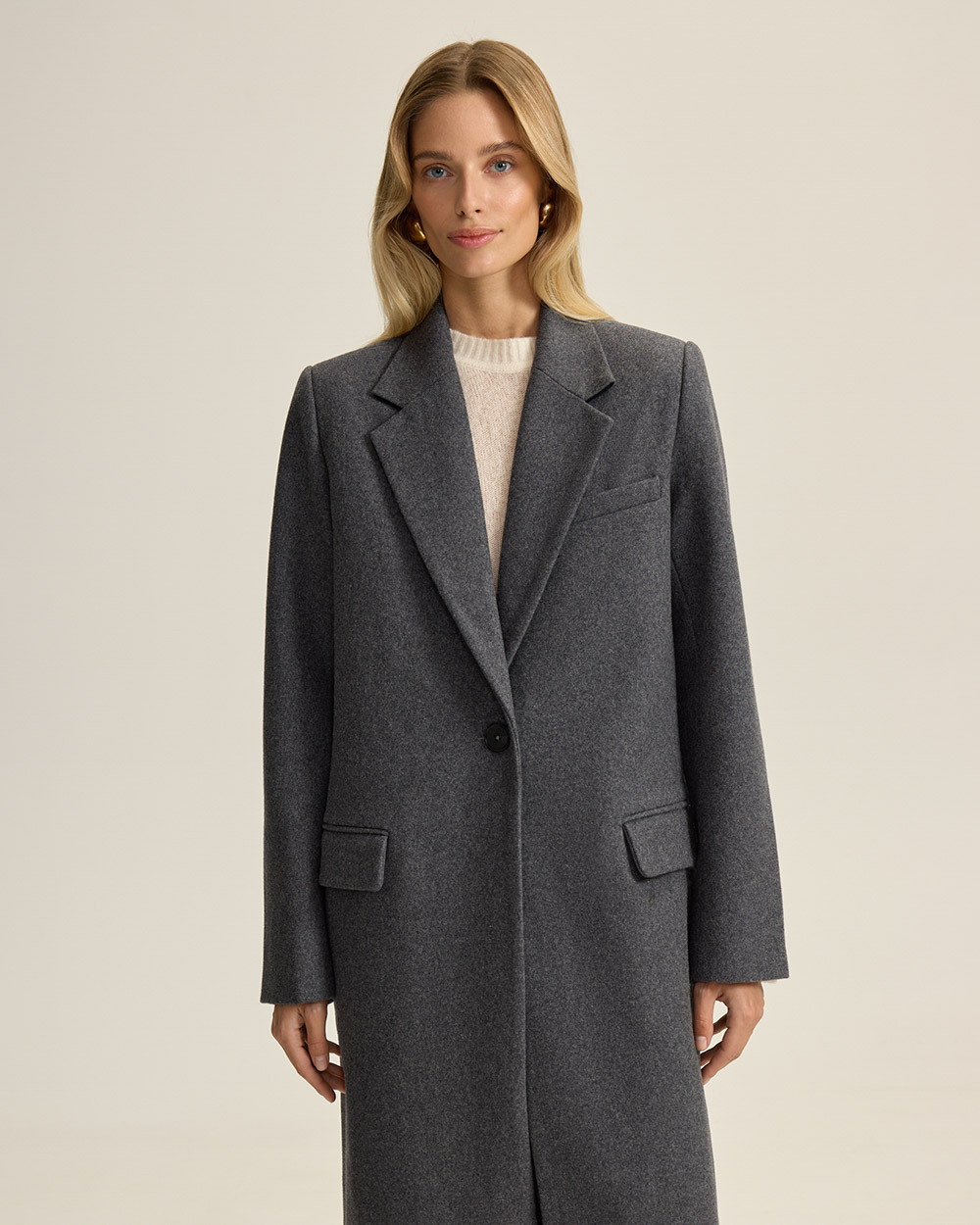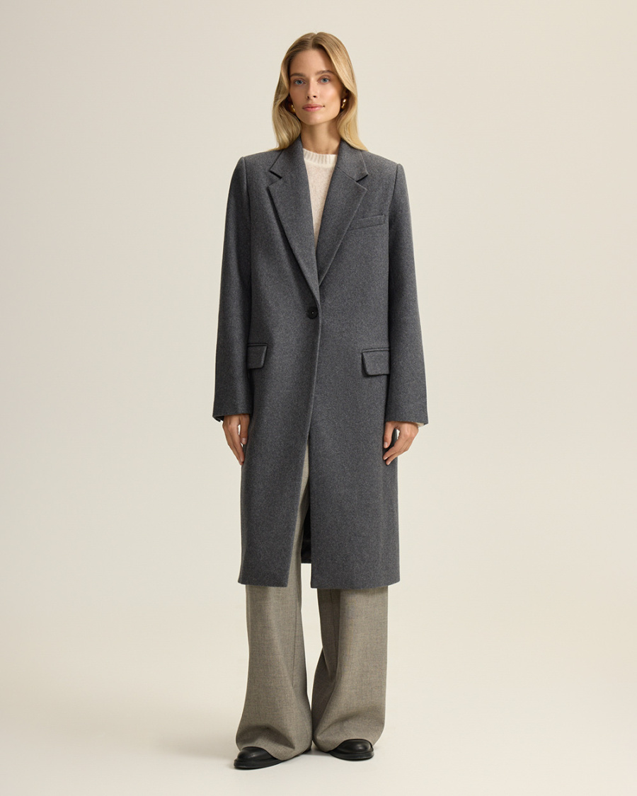 Однобортное пальто прямого кроя из шерсти. Лаконичный силуэт с четкой линией плеча и посадкой оверсайз — современная интерпретация классики. Подплечники, лацканы и карманы с клапанами придают образу архитектурность и благородную строгость.